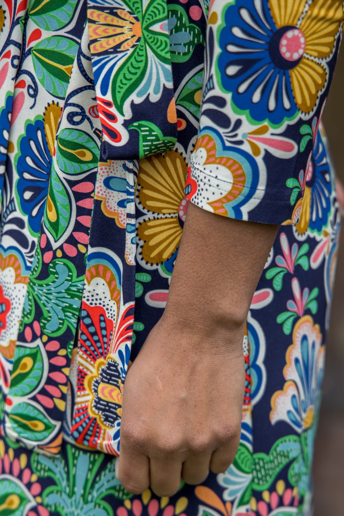 Mönstret är en färgsprakande folkloredröm med pigga nyanser av grönt, gult, rött och blått på en djup marinblå botten. Nertill pryds kjolen av en dekorativ bård som ger en fin inramning och förstärker den bohemiskt eleganta känslan.