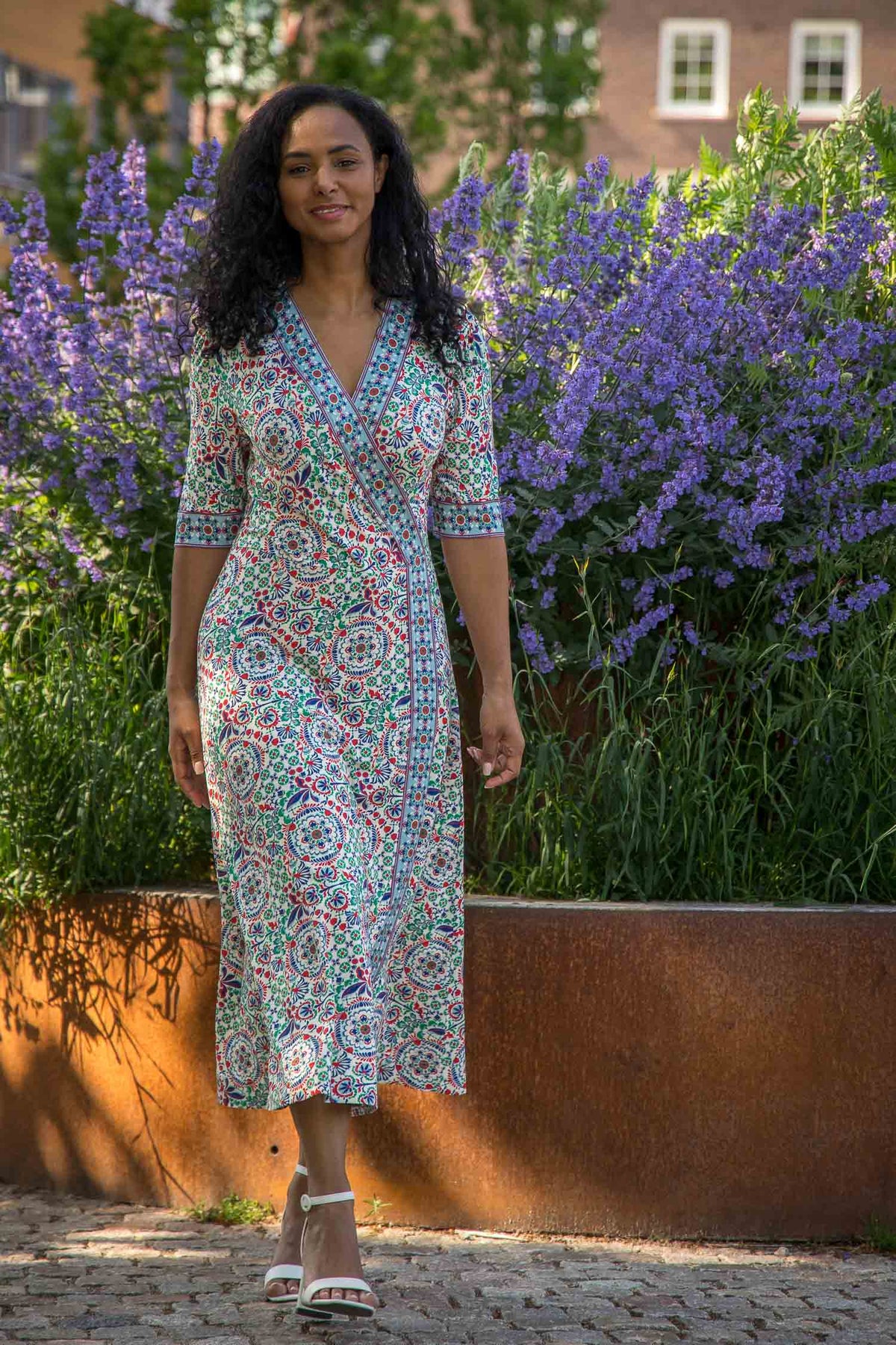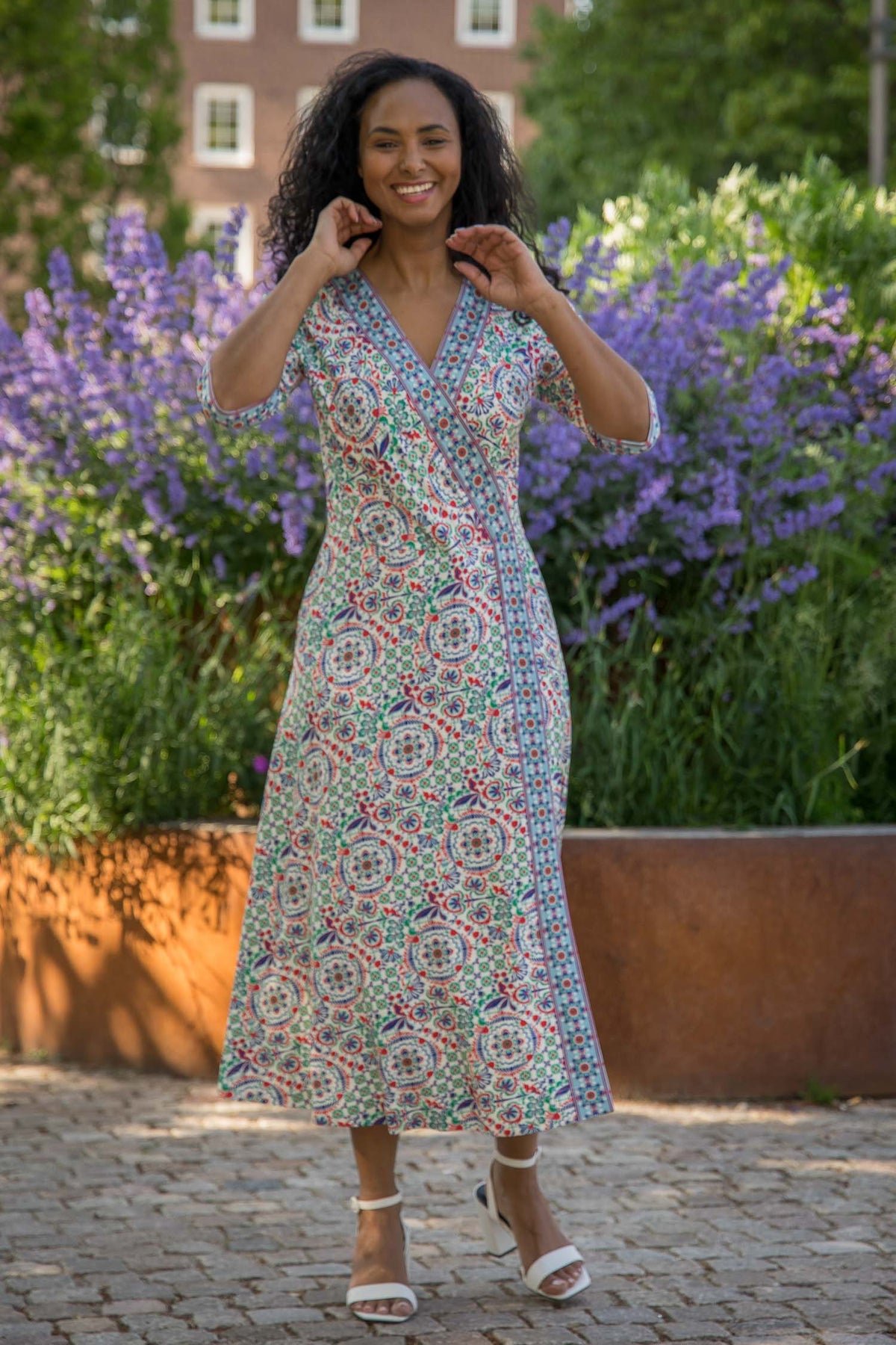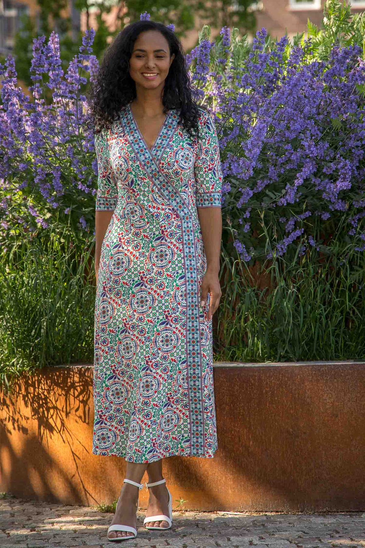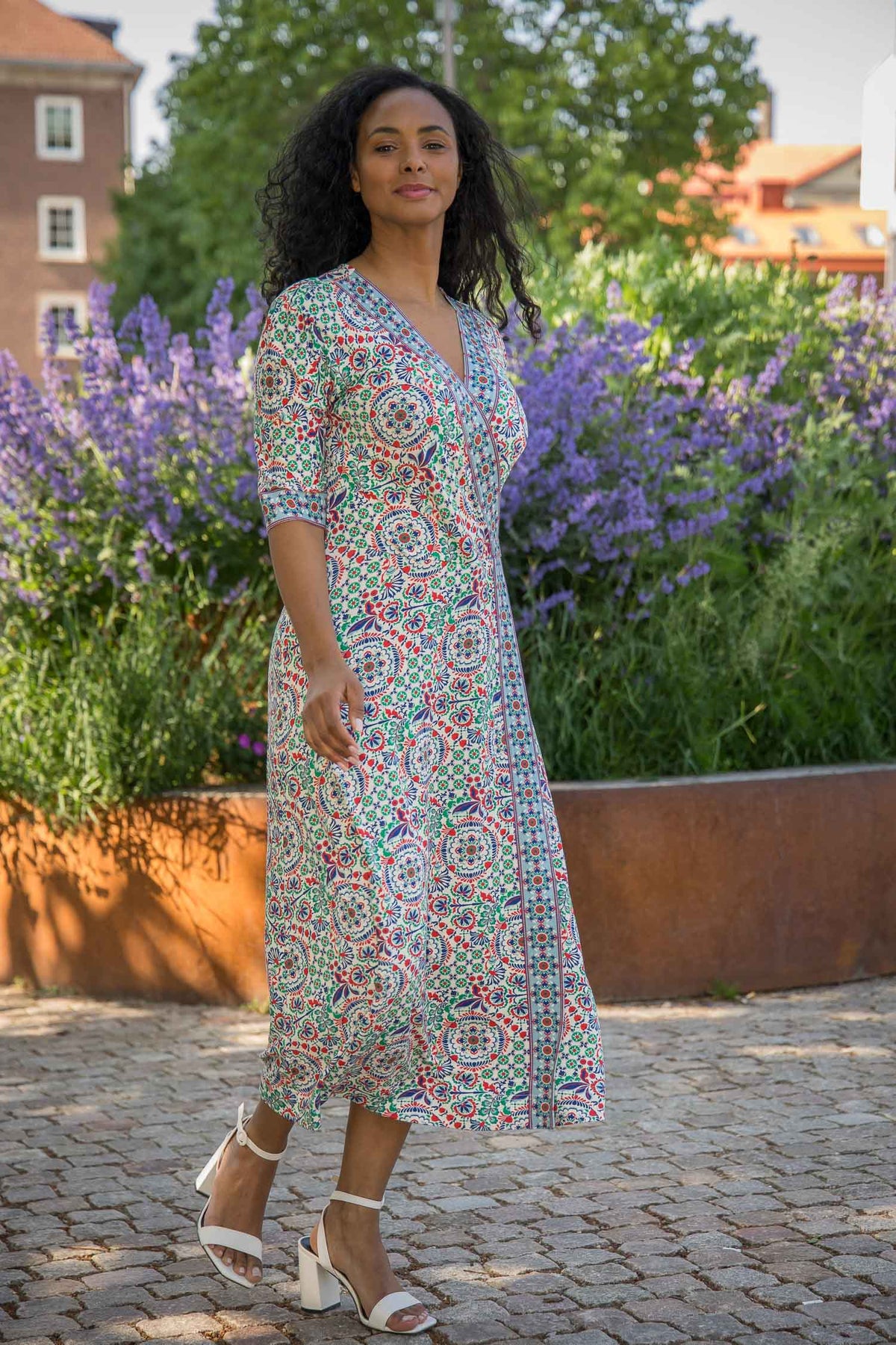 Slip-On, vår nya klänning, är en omlottmodell utan knytband – fastsydd i midjan och lätt att dra på. Både överdelen och kjolen omlottar framtill, vilket ger en välsittande men enkel passform. Kjolen är vadlång, klockad med vidd. Klänningen har kort ärm med lätt rynk upptill. En dekorativ bård i kontrastmönster löper längs halsringningen, framkanten på kjolen och ärmsluten.