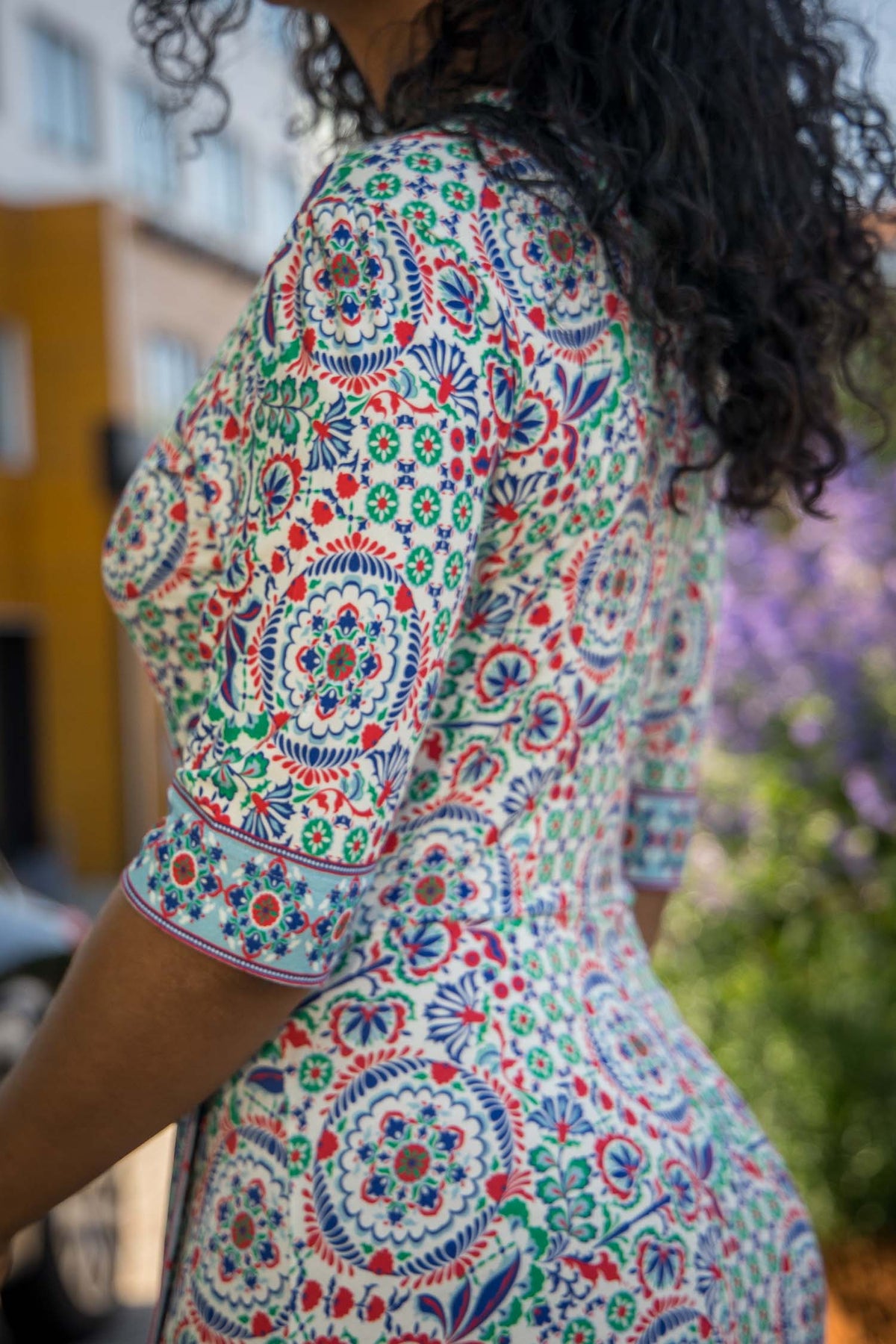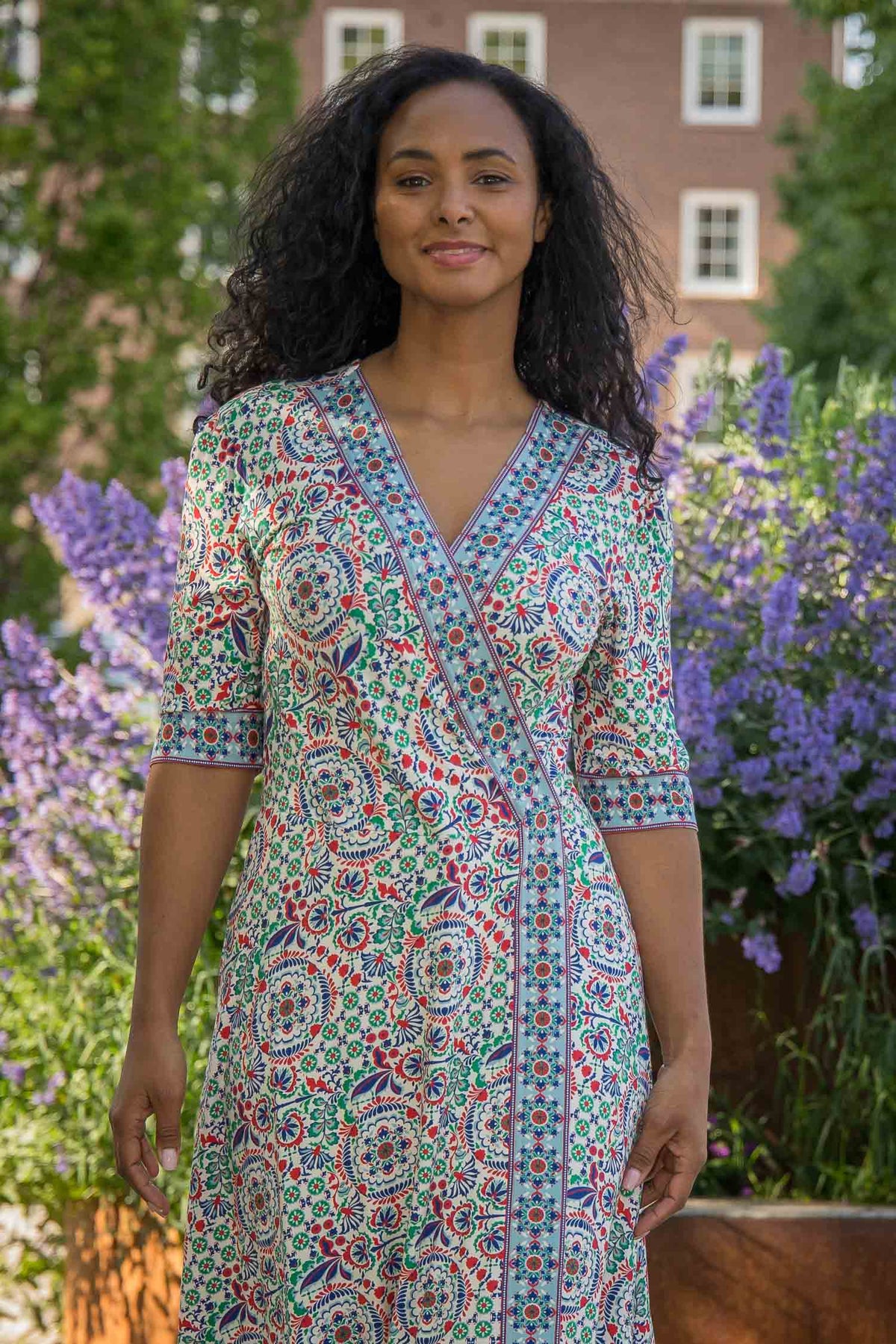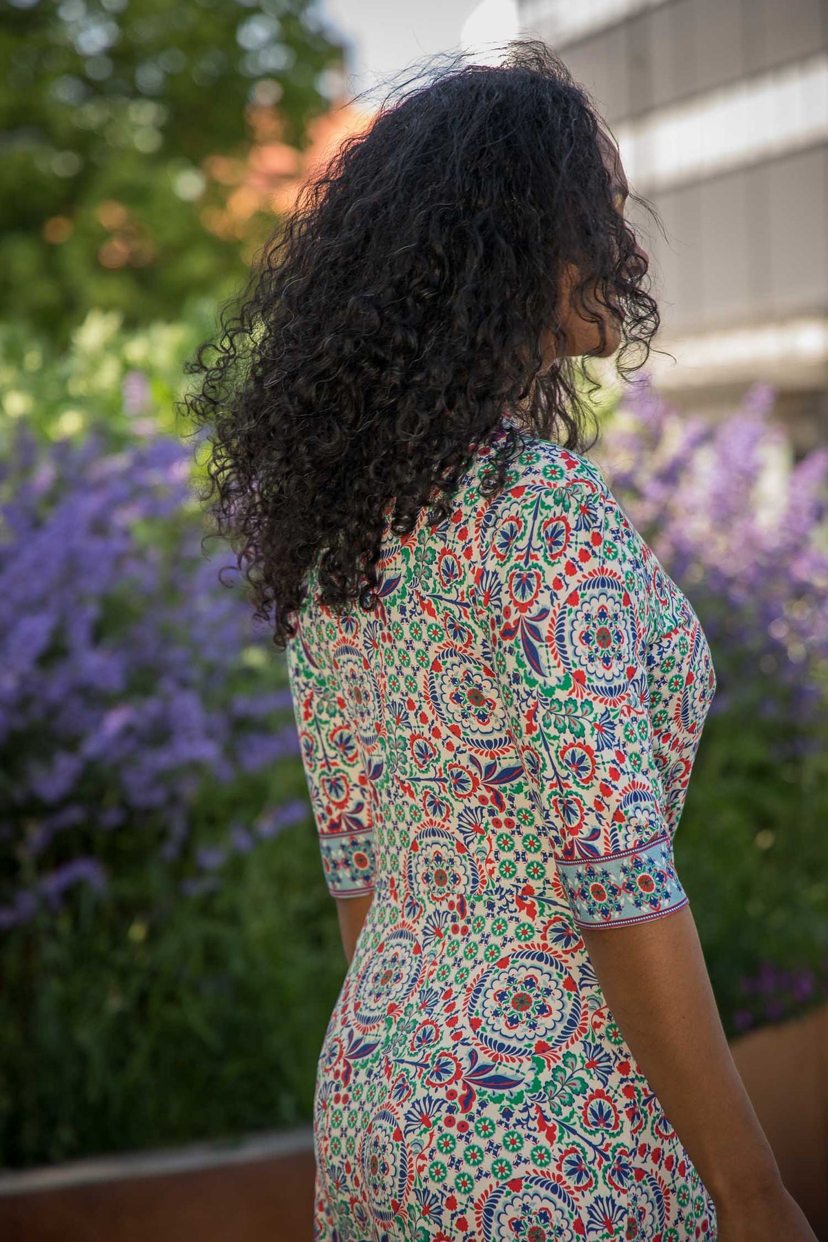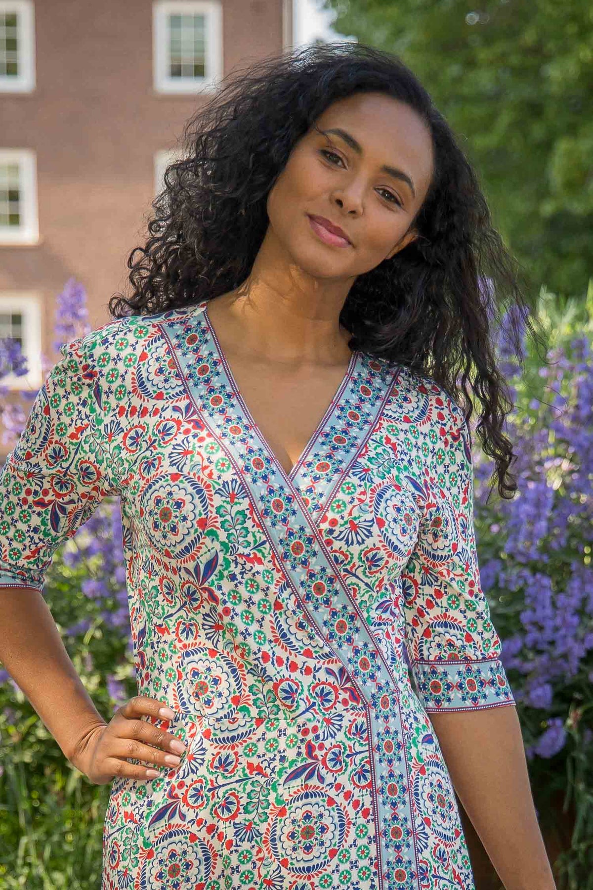 Slip-On, vår nya klänning, är en omlottmodell utan knytband – fastsydd i midjan och lätt att dra på. Både överdelen och kjolen omlottar framtill, vilket ger en välsittande men enkel passform. Kjolen är vadlång, klockad med vidd. Klänningen har kort ärm med lätt rynk upptill. En dekorativ bård i kontrastmönster löper längs halsringningen, framkanten på kjolen och ärmsluten.