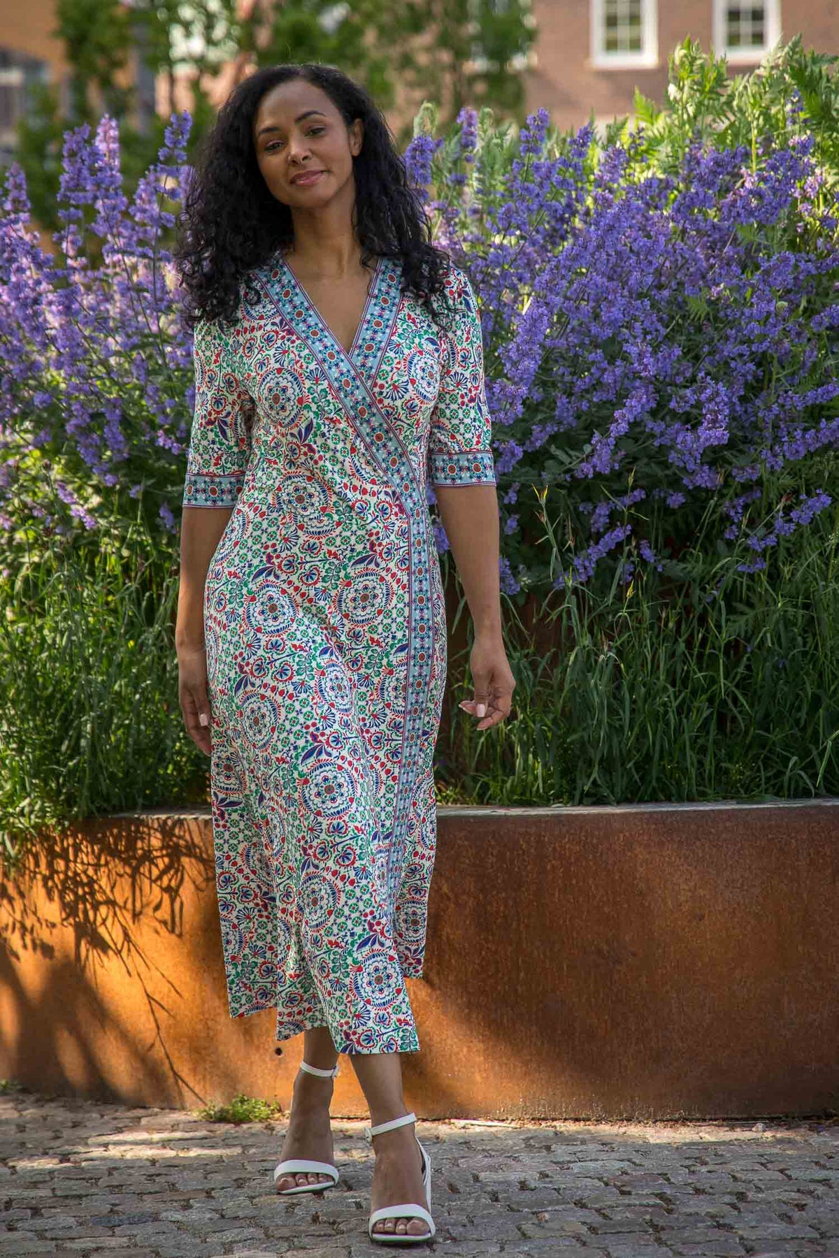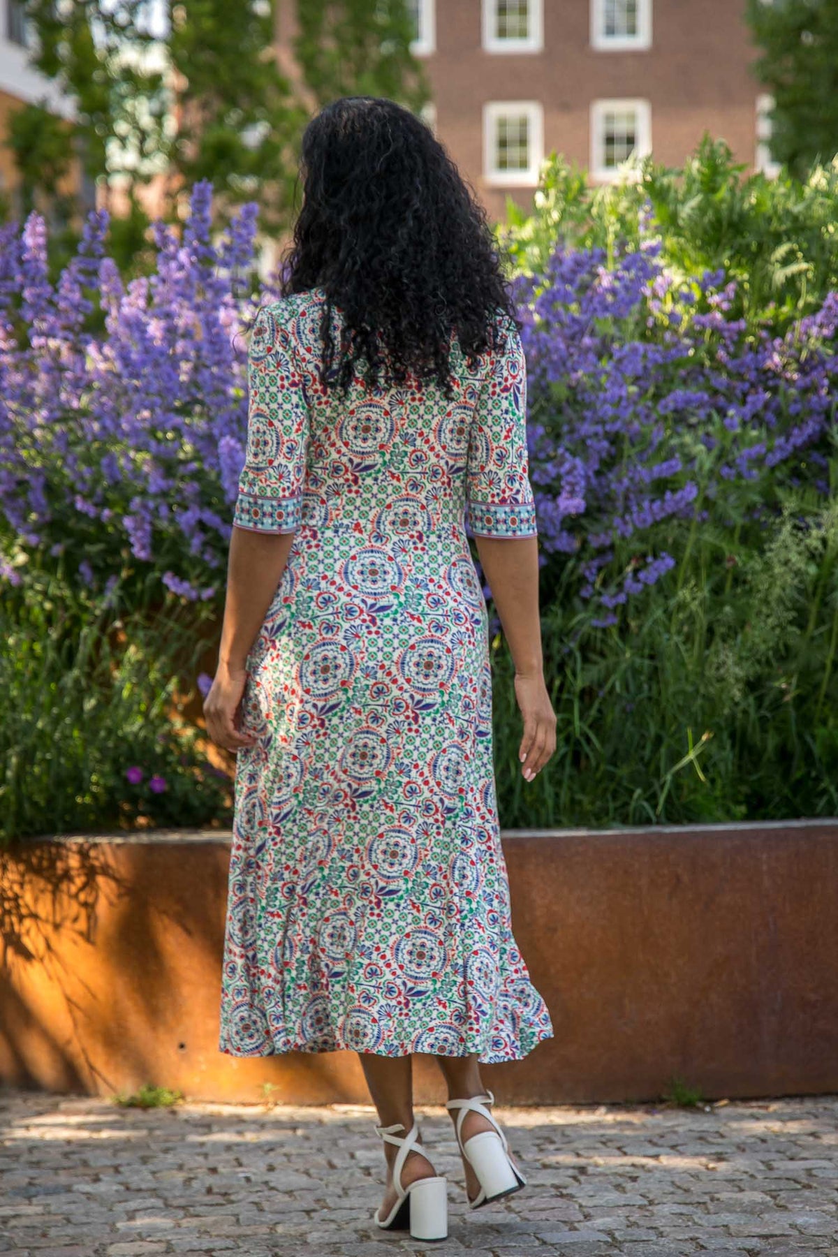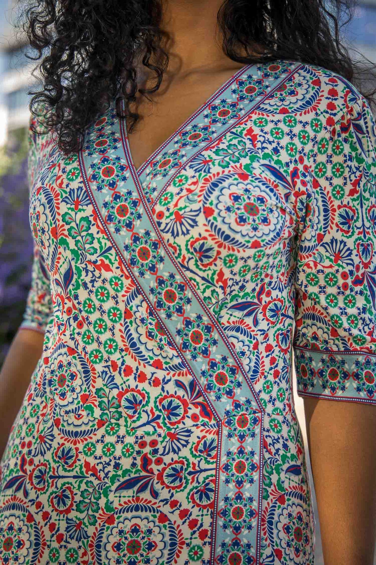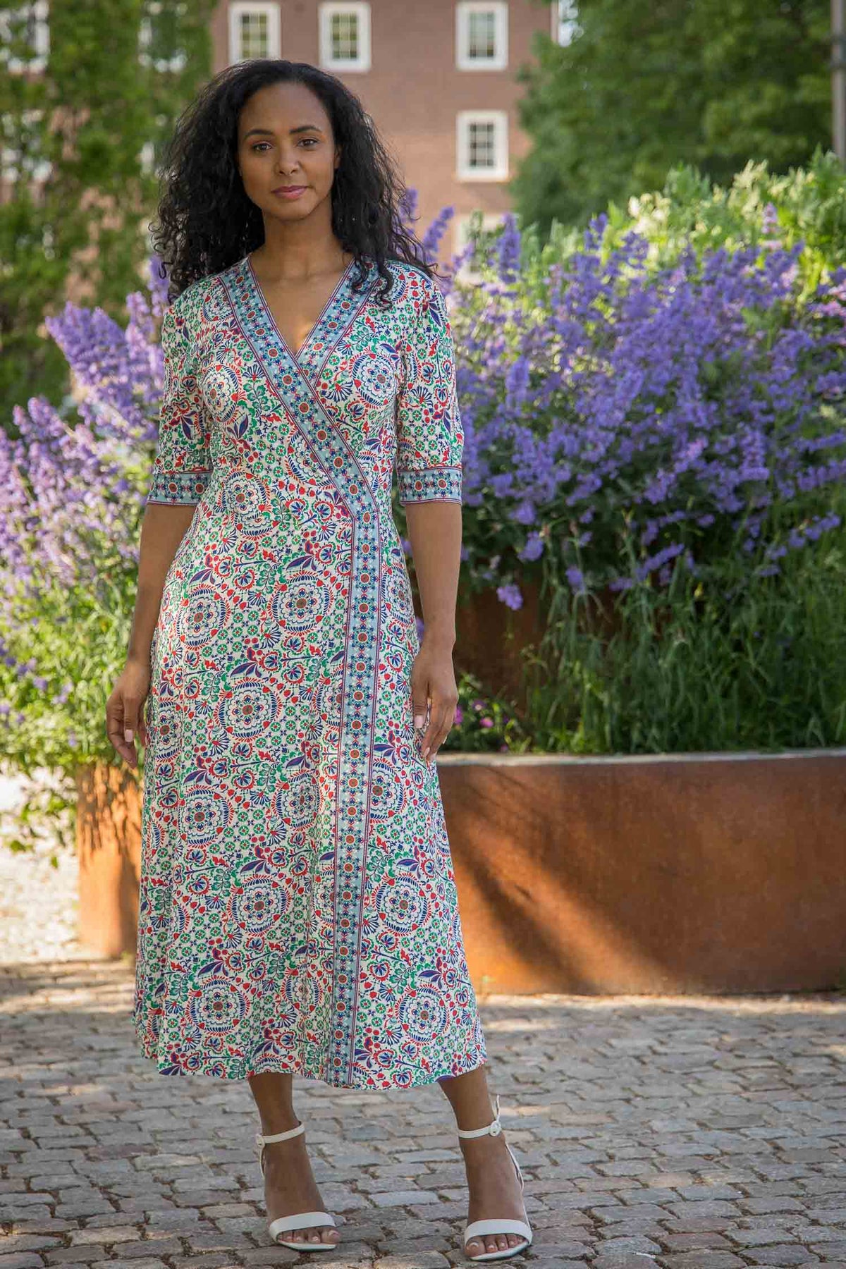 Slip-On, vår nya klänning, är en omlottmodell utan knytband – fastsydd i midjan och lätt att dra på. Både överdelen och kjolen omlottar framtill, vilket ger en välsittande men enkel passform. Kjolen är vadlång, klockad med vidd. Klänningen har kort ärm med lätt rynk upptill. En dekorativ bård i kontrastmönster löper längs halsringningen, framkanten på kjolen och ärmsluten.