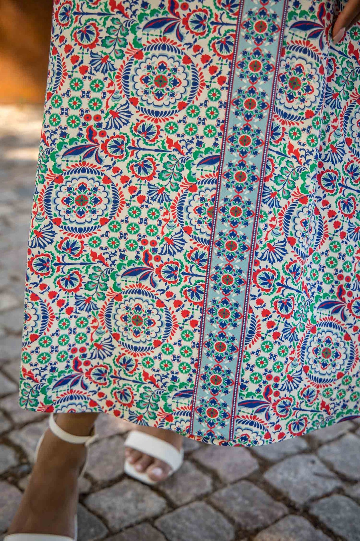 Tyget har ett folkinspirerat medaljongmönster med stiliserade blommor i rött, grönt och marinblått mot ljus botten, kombinerat med en ornamenterad bård i samma färgskala.