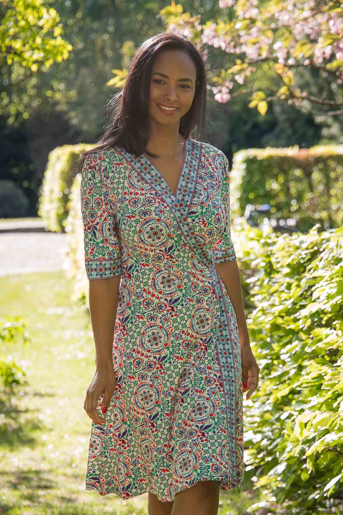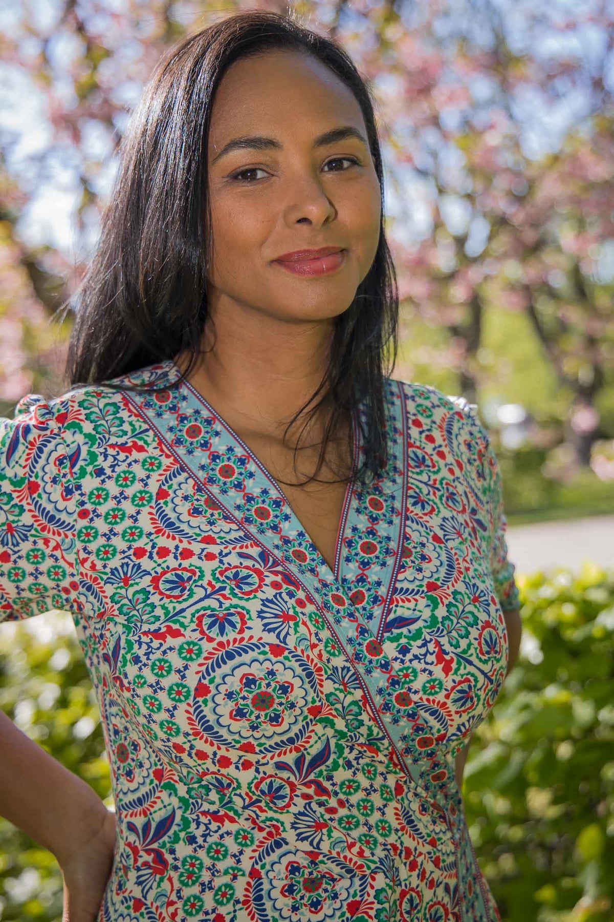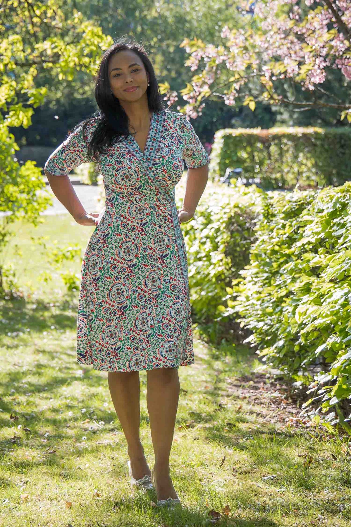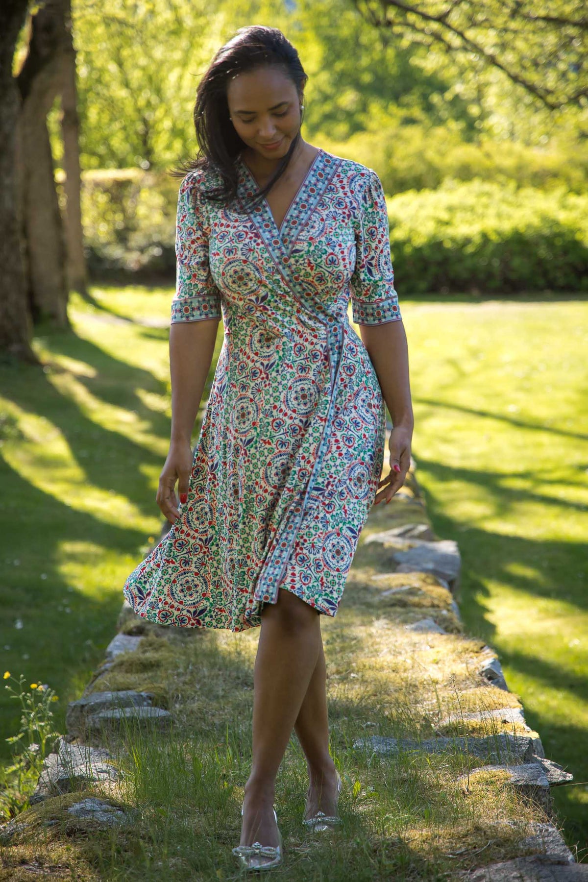 Slip-On, vår nya klänning, är en omlottmodell utan knytband – fastsydd i midjan och lätt att dra på. Både överdelen och kjolen omlottar framtill, vilket ger en välsittande men enkel passform. Kjolen är knälång, klockad med vidd. Klänningen har kort ärm med lätt rynk upptill. En dekorativ bård i kontrastmönster löper längs halsringningen, framkanten på kjolen och ärmsluten.