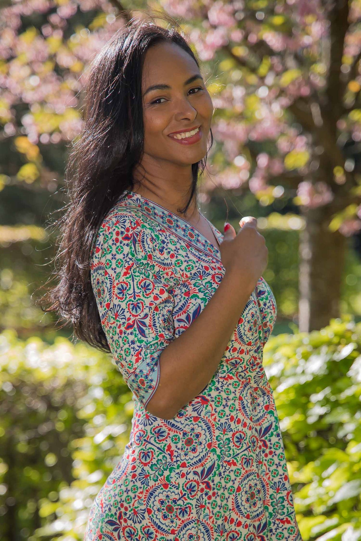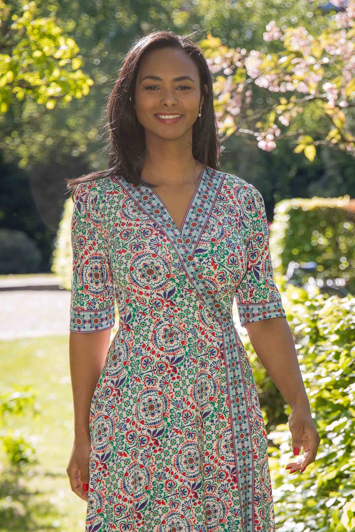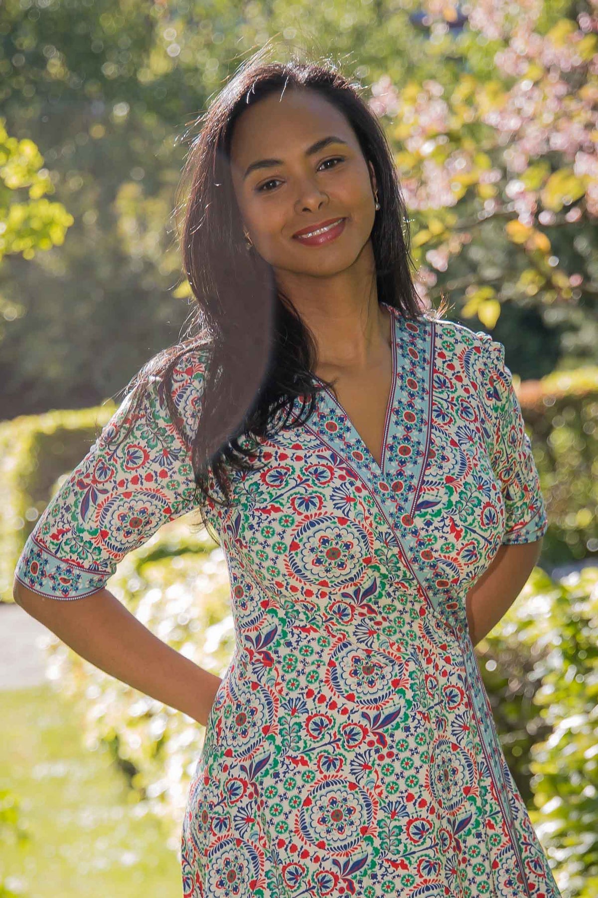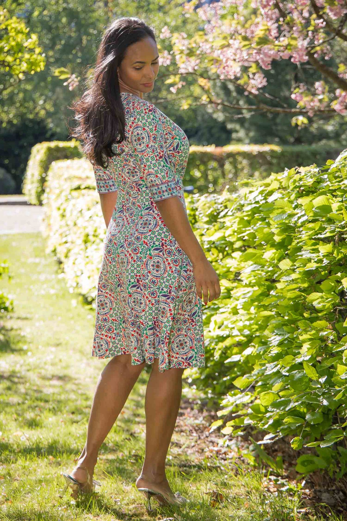 Slip-On, vår nya klänning, är en omlottmodell utan knytband – fastsydd i midjan och lätt att dra på. Både överdelen och kjolen omlottar framtill, vilket ger en välsittande men enkel passform. Kjolen är knälång, klockad med vidd. Klänningen har kort ärm med lätt rynk upptill. En dekorativ bård i kontrastmönster löper längs halsringningen, framkanten på kjolen och ärmsluten.