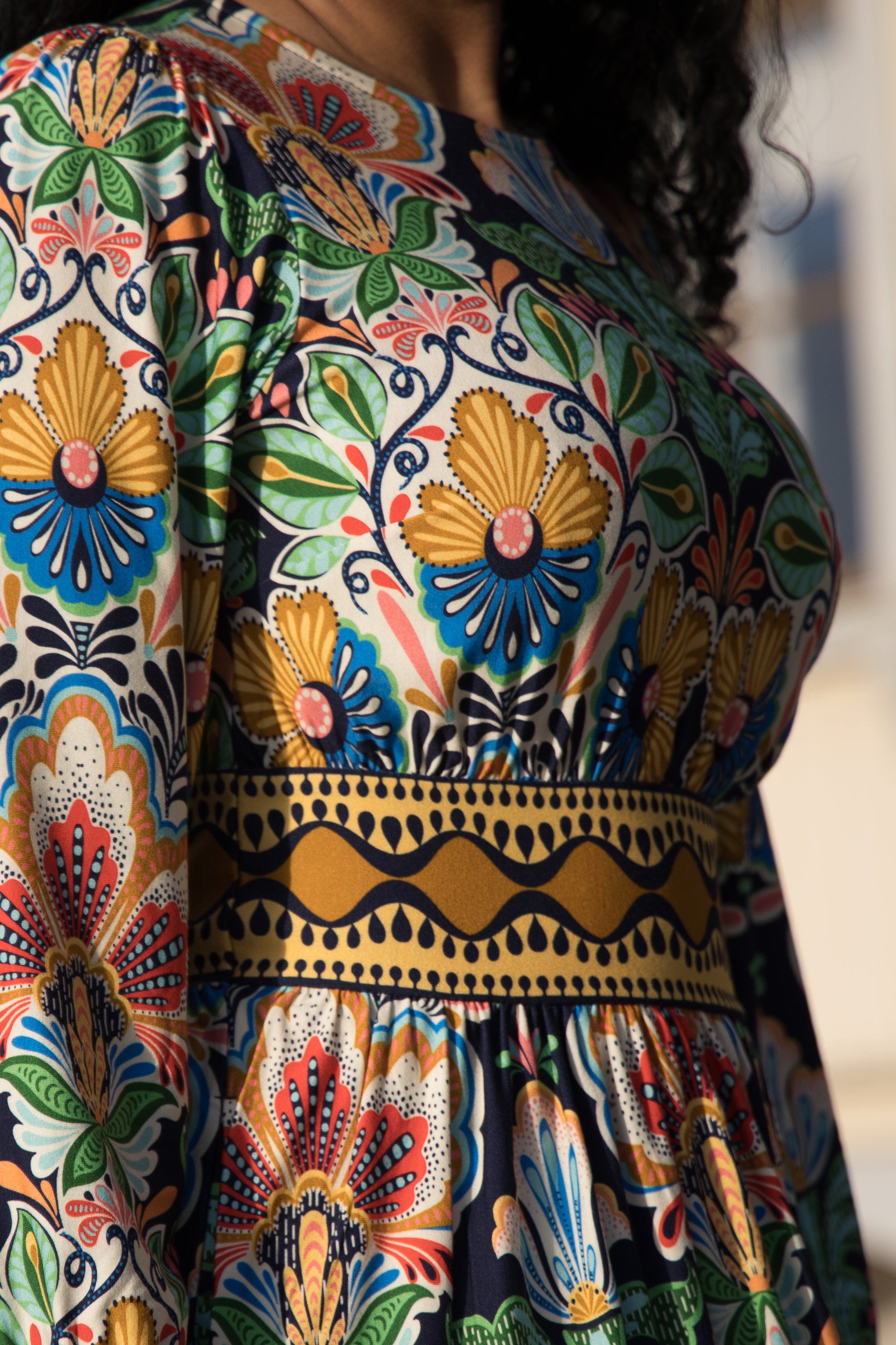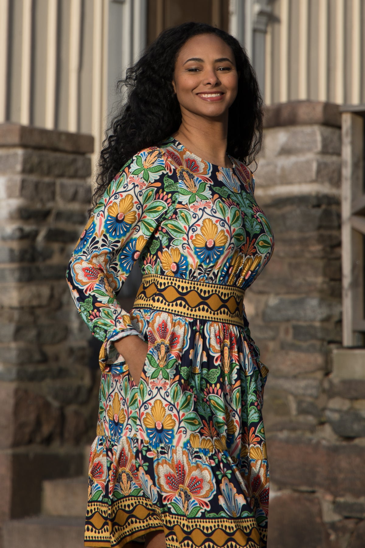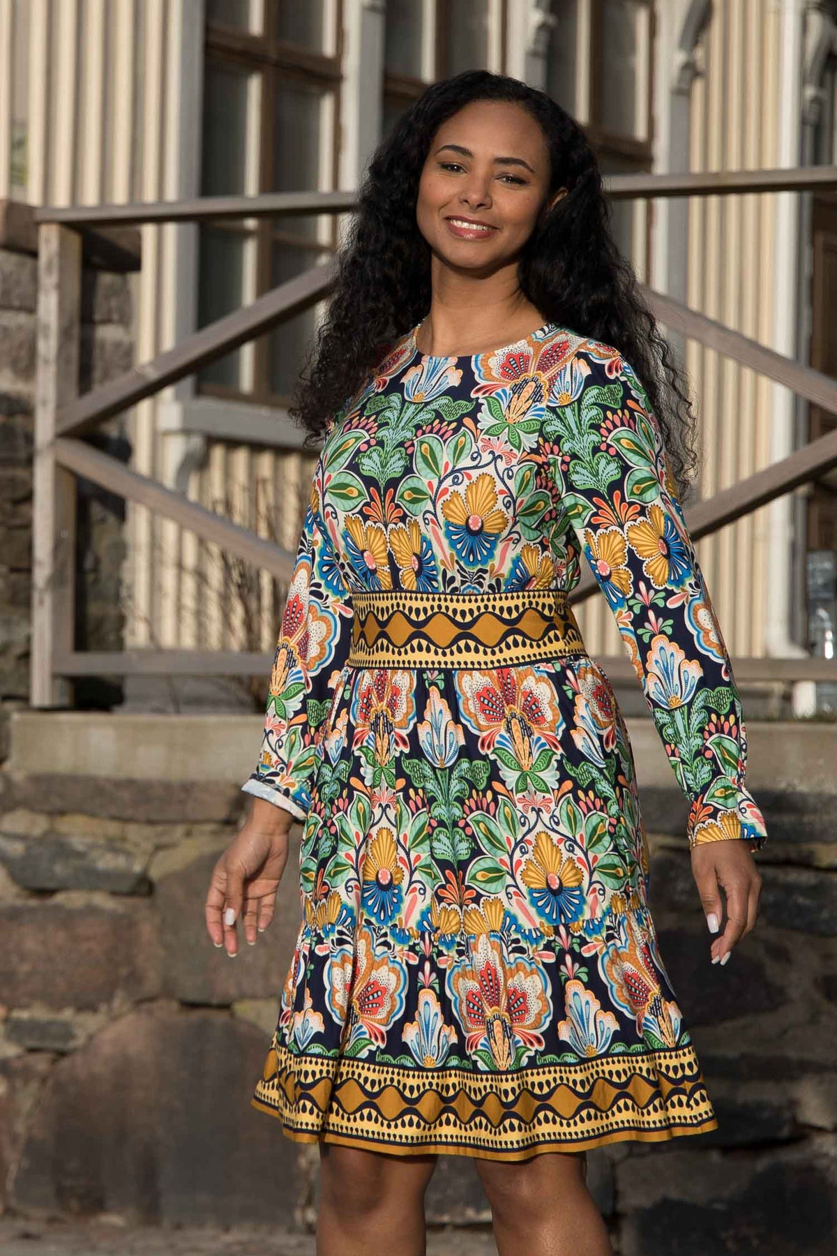 Klänningen är sydd i Bulgarien på en mindre fabrik med lång erfarenhet och mycket kunskap. Som alltid är klänningen designad hos oss i Borås.