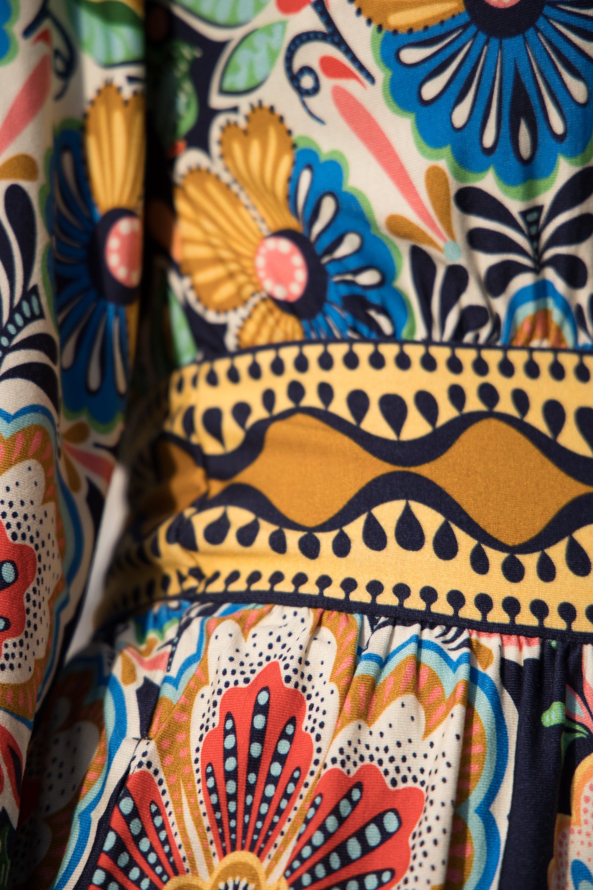 En klänning som drar blickarna till sig! Wow short jersey dress har ett livfullt folklore-inspirerat mönster på en mjuk och stretchig jerseykvalitet. Det fastsydda midjebandet skapar en smickrande silhuett och ger illusionen av en tvådelad outfit.