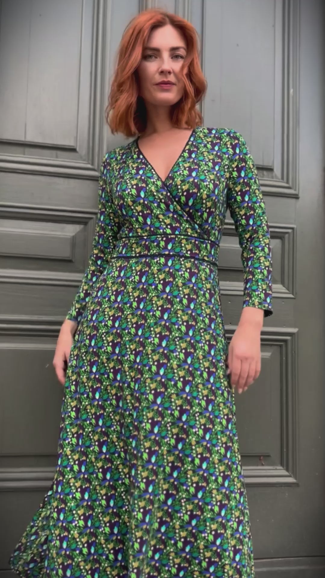 • Vadlång klänning med omlottskuren överdel (stängd omlott).