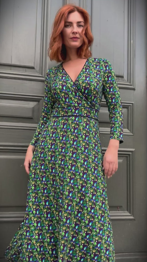 En klänning i mjuk trikå med ett blommönster i grönt, blått, turkost och gult på mörkt marinblå botten – en färgkombination som känns både modern och nostalgisk.