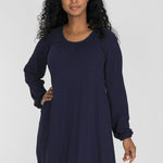 A-lined belted är vår A-linjeformade klänning i mjuk, stretchig trikå med ett tungt fall. Klänningsmodellen har en ledig passform och fickor i sidorna. Halsringningen är rundad med rynk och de långa raglanärmarna är vida med rynk nertill. Klänningen kommer med ett löst knytband som kan användas om du vill markera midjan. På bilderna syns den både med och utan bälte.