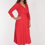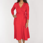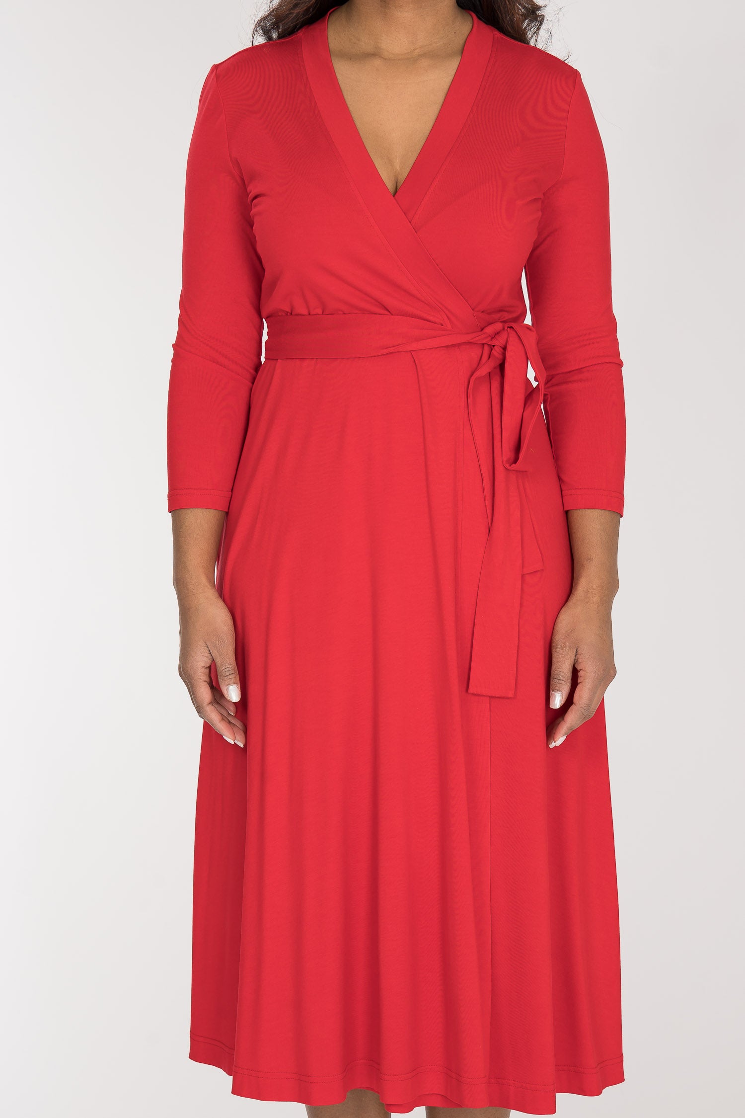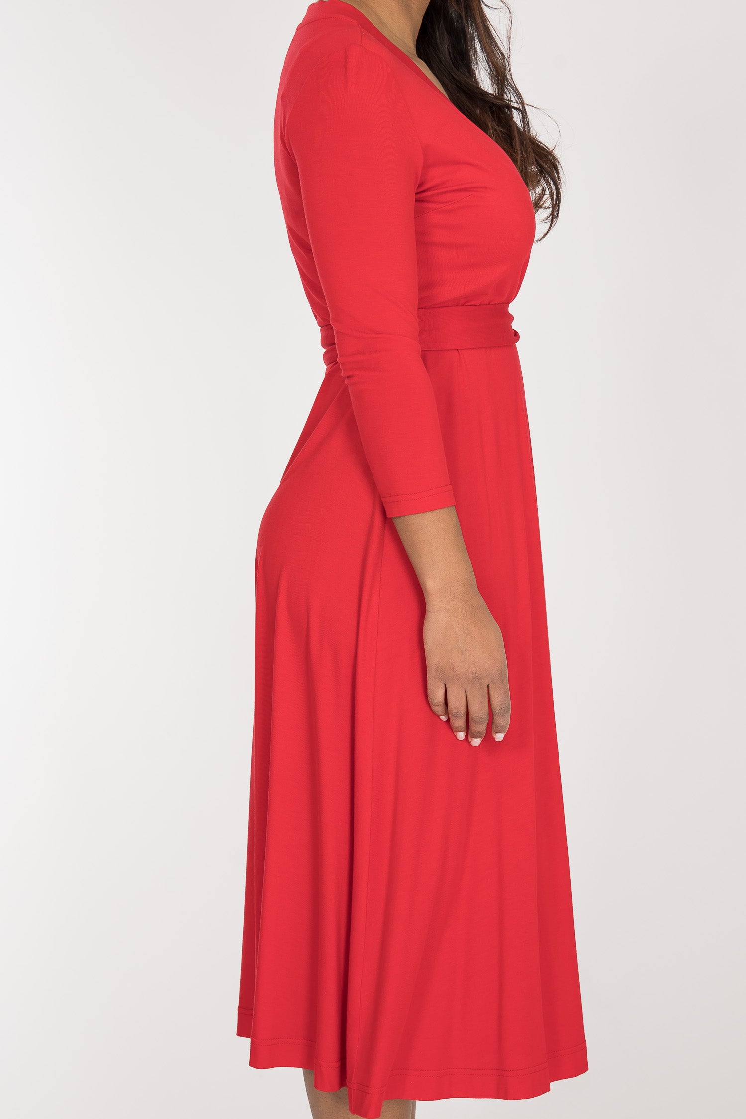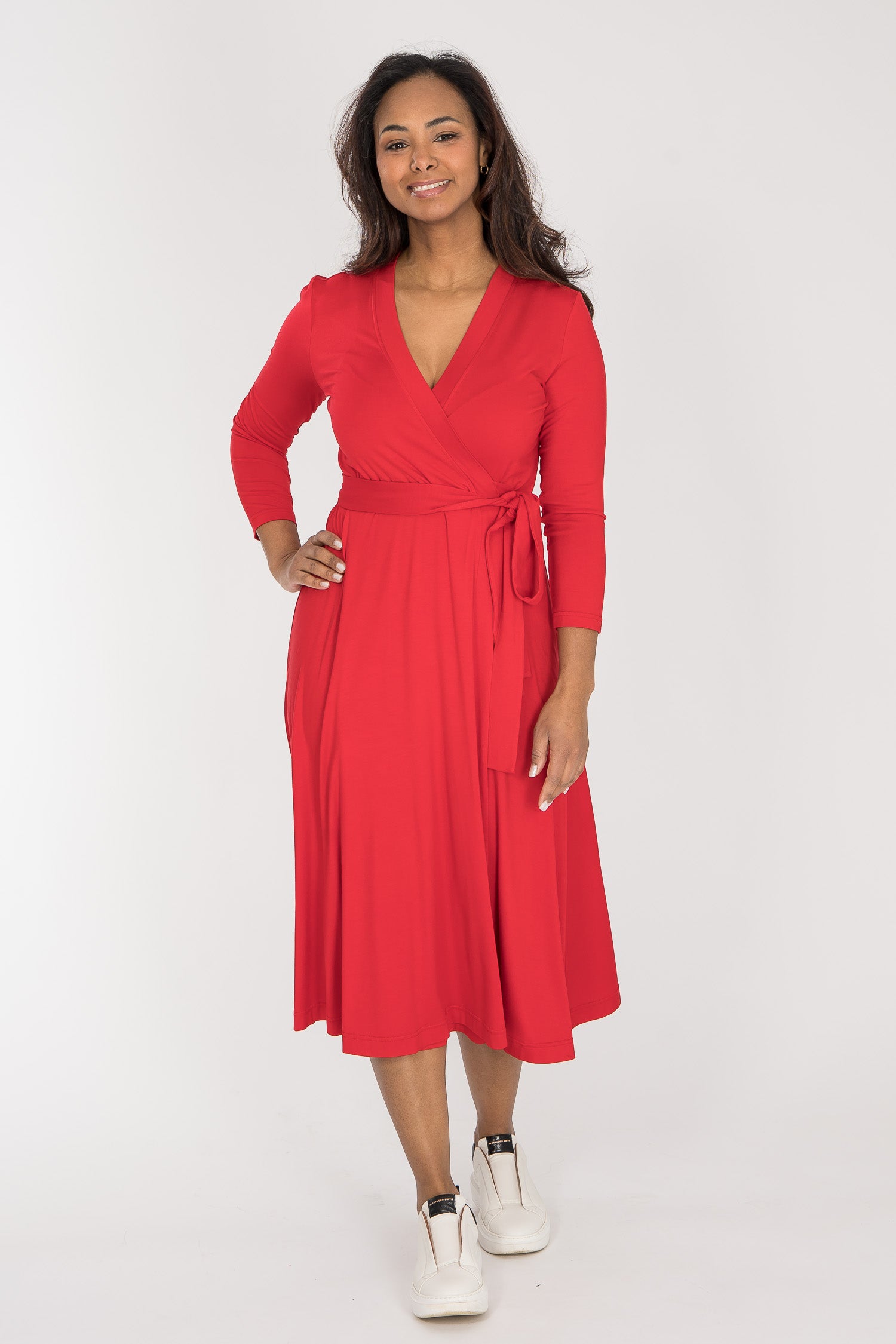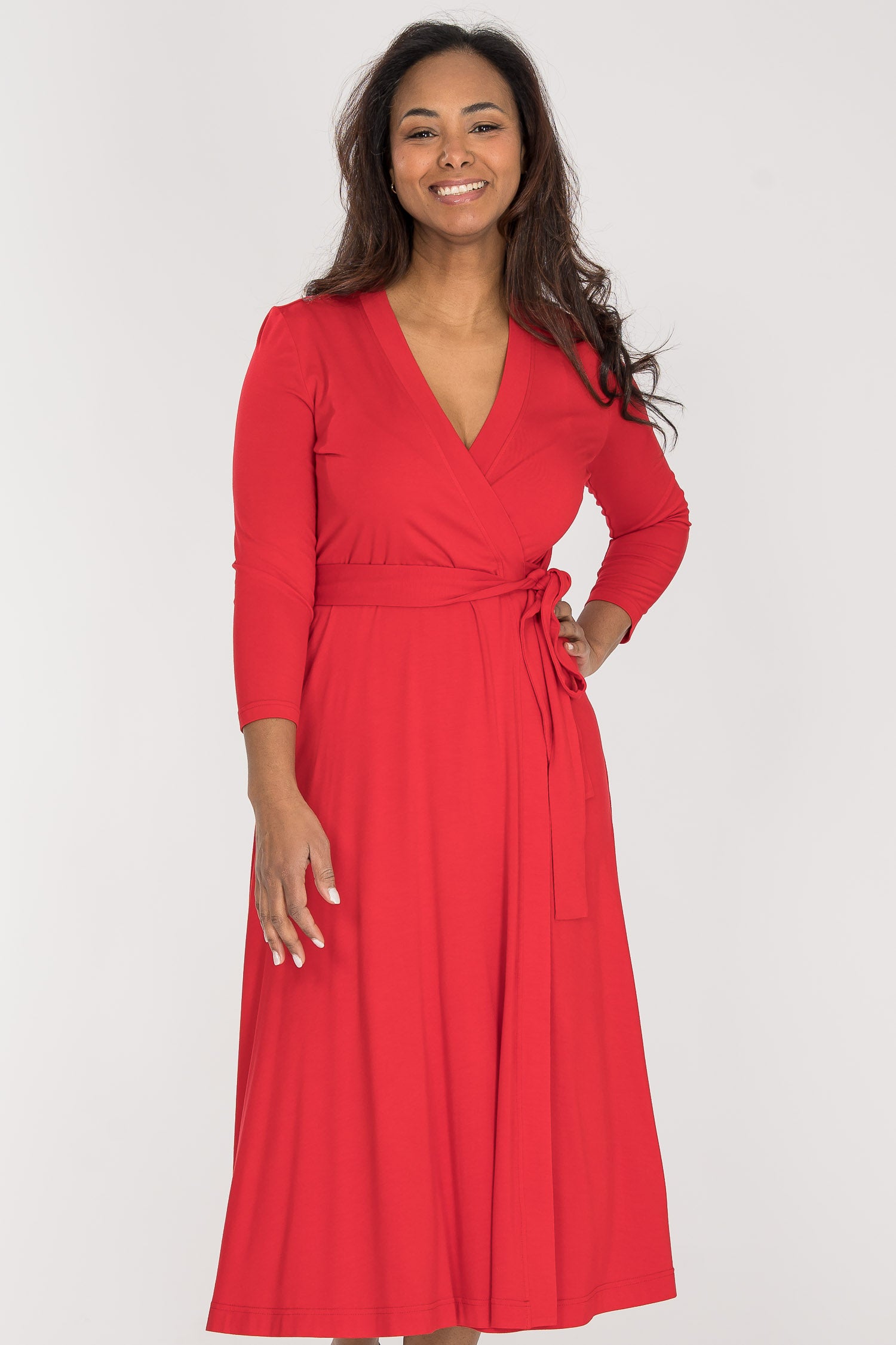 Vi har en förkärlek för omlottklänningar, de är lika smickrande som bekväma. Här är en vadlång modell i mjuk trikå med knyt i midjan och vidd i kjolen. Bestie wrap dress återkommer i kollektionen år efter år och är en av våra mest älskade klänningar.