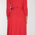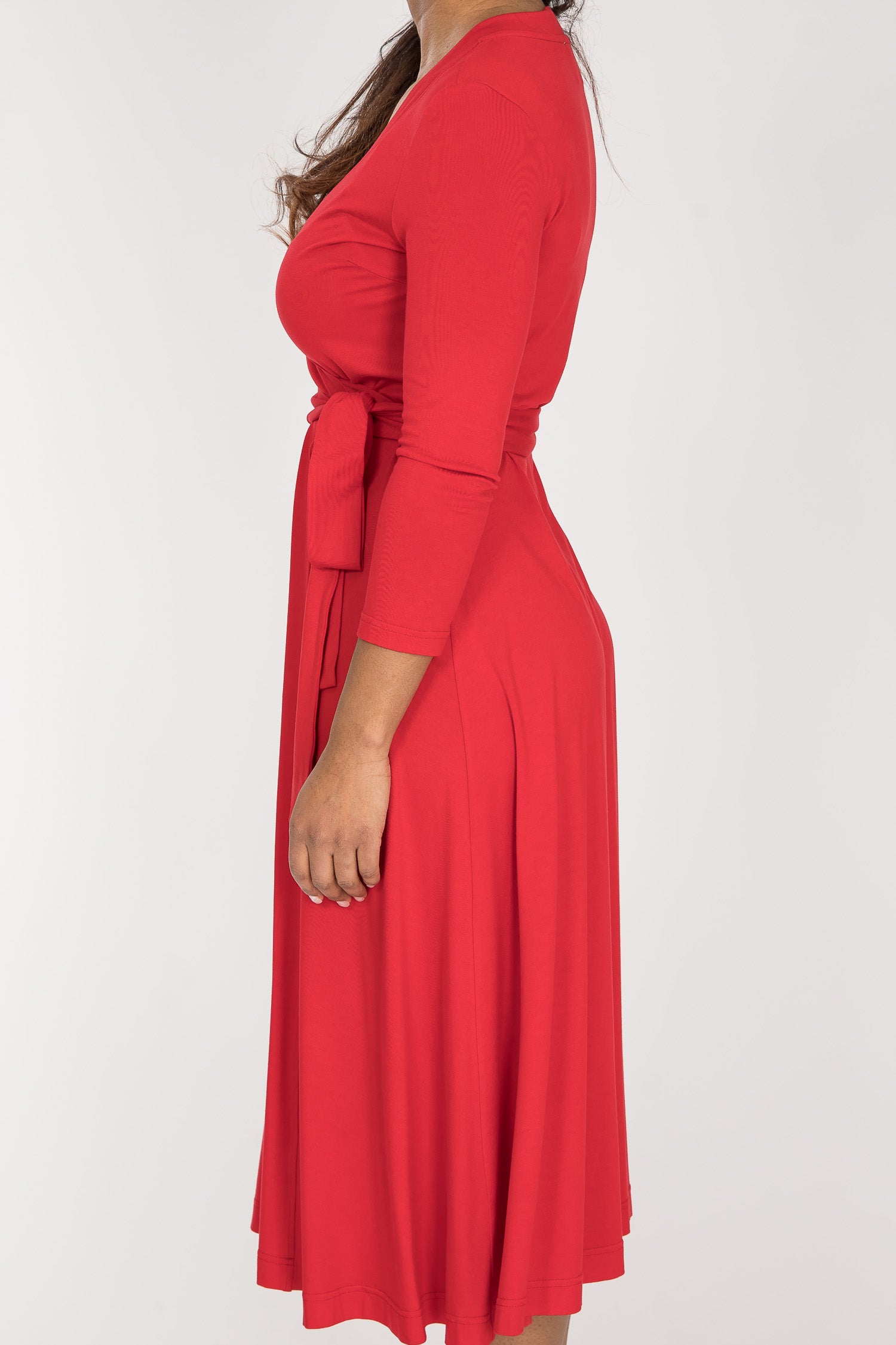 Omlottklänningen är sydd i en trikå av viskos och elastan. Tyget är mjukt och följsamt, nopprar inte och håller både formen och färgen tvätt efter tvätt. Kort sagt – en klänning att bära ofta och länge.