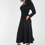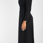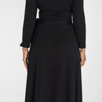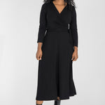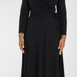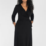Ready to go – en vadlång trikåklänning som kombinerar komfort med genomtänkta detaljer. Omlottlivet med drapering i sidan och de ¾-långa ärmarna med rynk vid axeln skapar en feminin helhet. Den utställda kjolen faller fint, och det fastsydda knytbandet i midjan kan knytas både fram och bak för att variera stilen. Sidfickor gör klänningen både praktisk och bekväm.