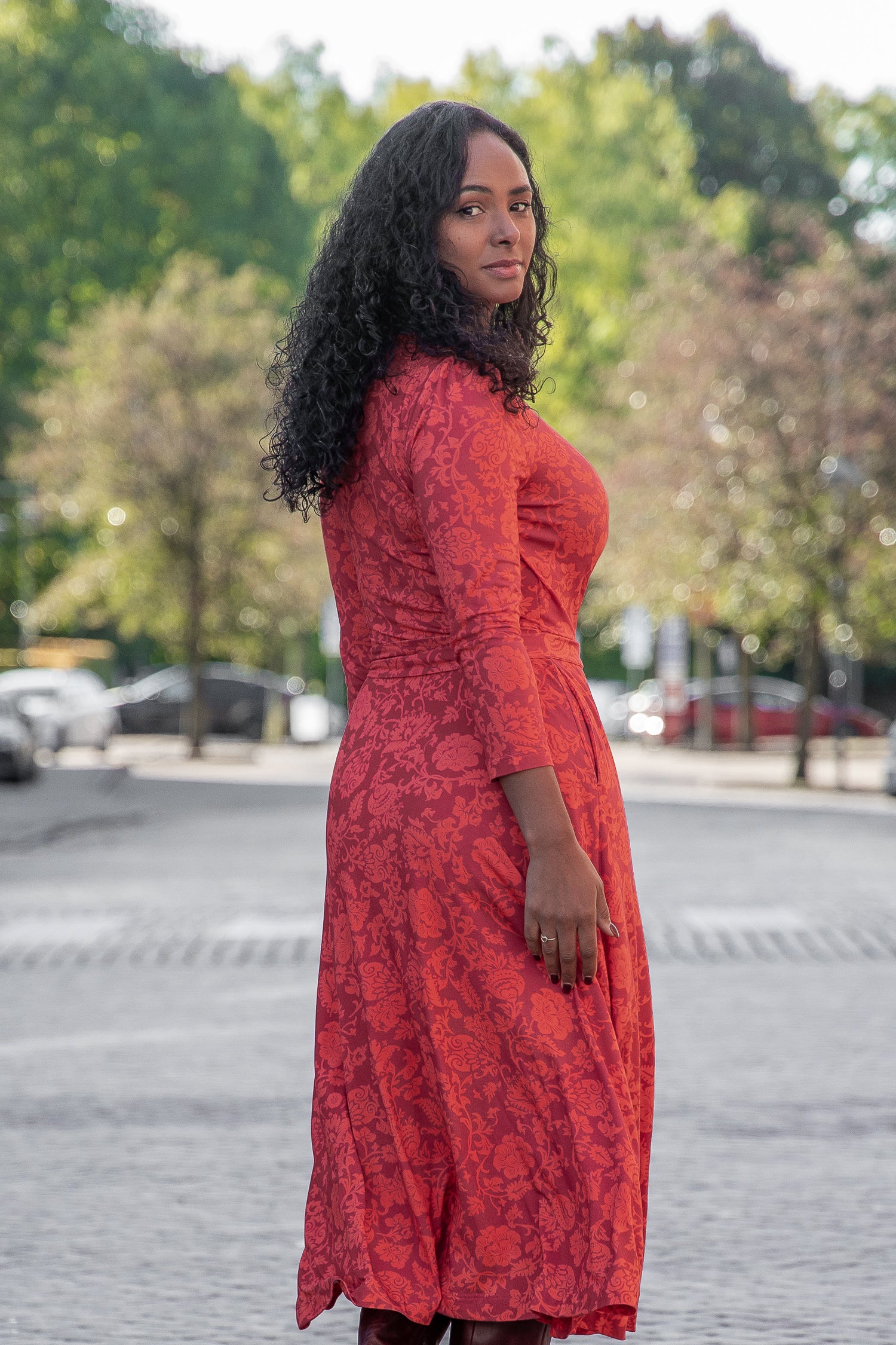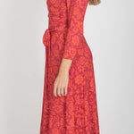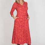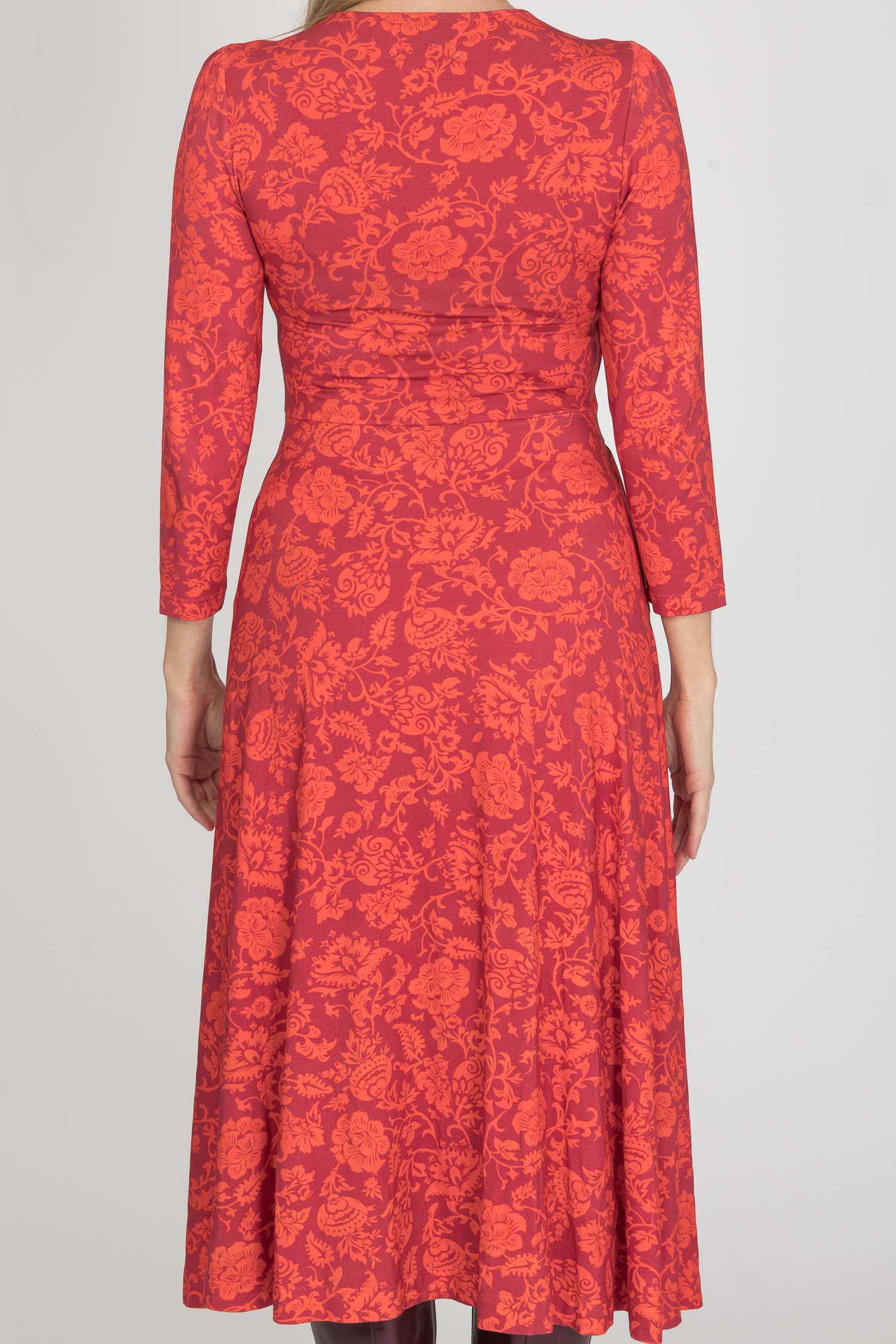 Ready to go – en vadlång trikåklänning som kombinerar komfort med genomtänkta detaljer. Det orange blommönstret på vinröd botten ger en varm och livfull känsla som fungerar lika bra till vardag som till kväll.