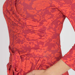 Tyget har en röd bas med ett ton-i-ton-mönster i två olika nyanser av rött, en mörkare och en ljusare som tillsammans ger en elegant och sofistikerad känsla.