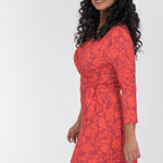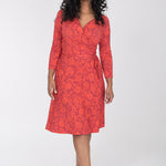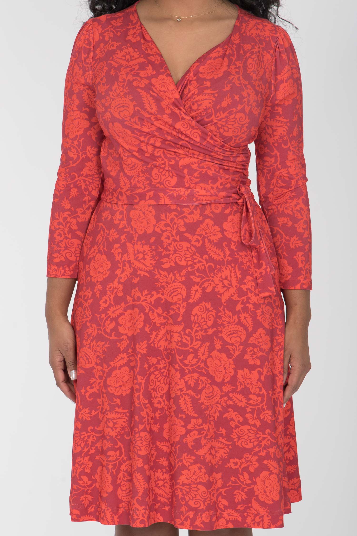 Ready to go – en knälång trikåklänning som kombinerar komfort med genomtänkta detaljer. Det orange blommönstret på vinröd botten ger en varm och livfull känsla som fungerar lika bra till vardag som till kväll.