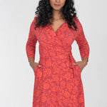 Omlottlivet med drapering i sidan och de ¾-långa ärmarna med rynk vid axeln skapar en feminin helhet. Den utställda kjolen faller fint, och det fastsydda knytbandet i midjan kan knytas både fram och bak för att variera stilen. Sidfickor gör klänningen både praktisk och bekväm.