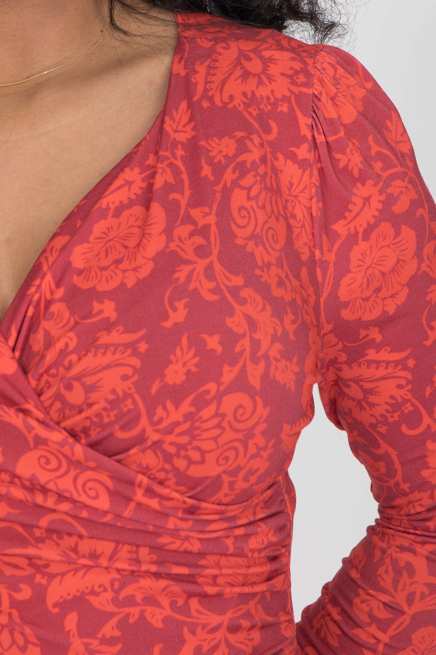 Tyget har en röd bas med ett ton-i-ton-mönster i två olika nyanser av rött, en mörkare och en ljusare som tillsammans ger en elegant och sofistikerad känsla.