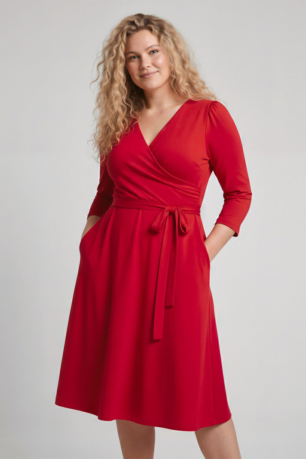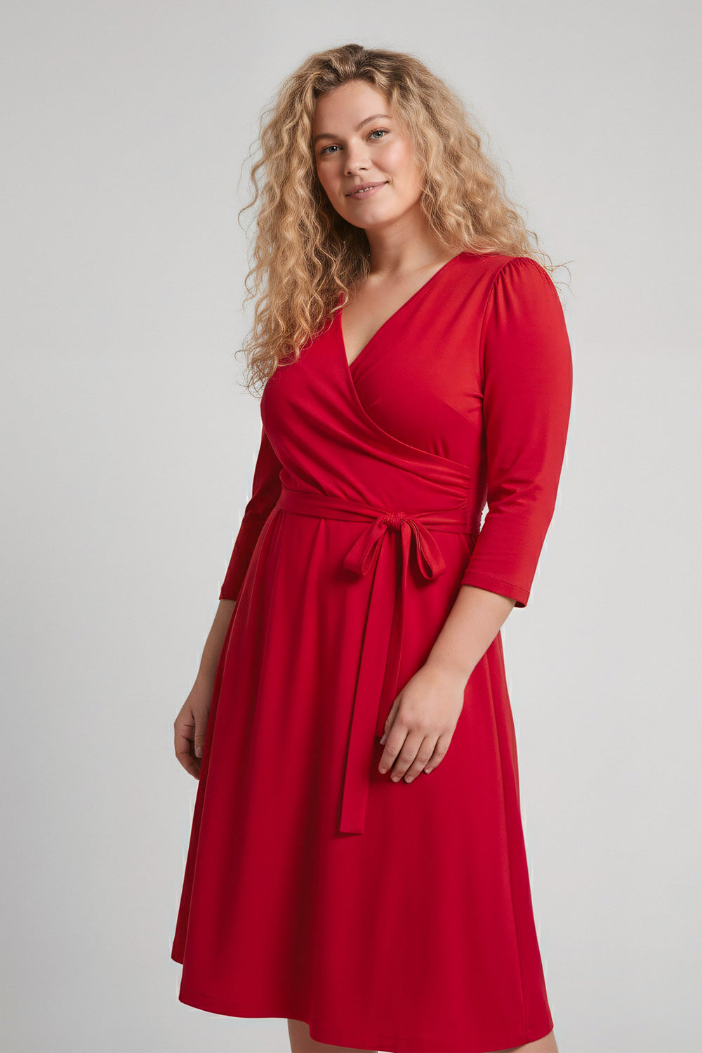 Ready to go – en knälång trikåklänning som kombinerar komfort med genomtänkta detaljer. Omlottlivet med drapering i sidan och de ¾-långa ärmarna med rynk vid axeln skapar en feminin helhet. Den utställda kjolen faller fint, och det fastsydda knytbandet i midjan kan knytas både fram och bak för att variera stilen. Sidfickor gör klänningen både praktisk och bekväm.