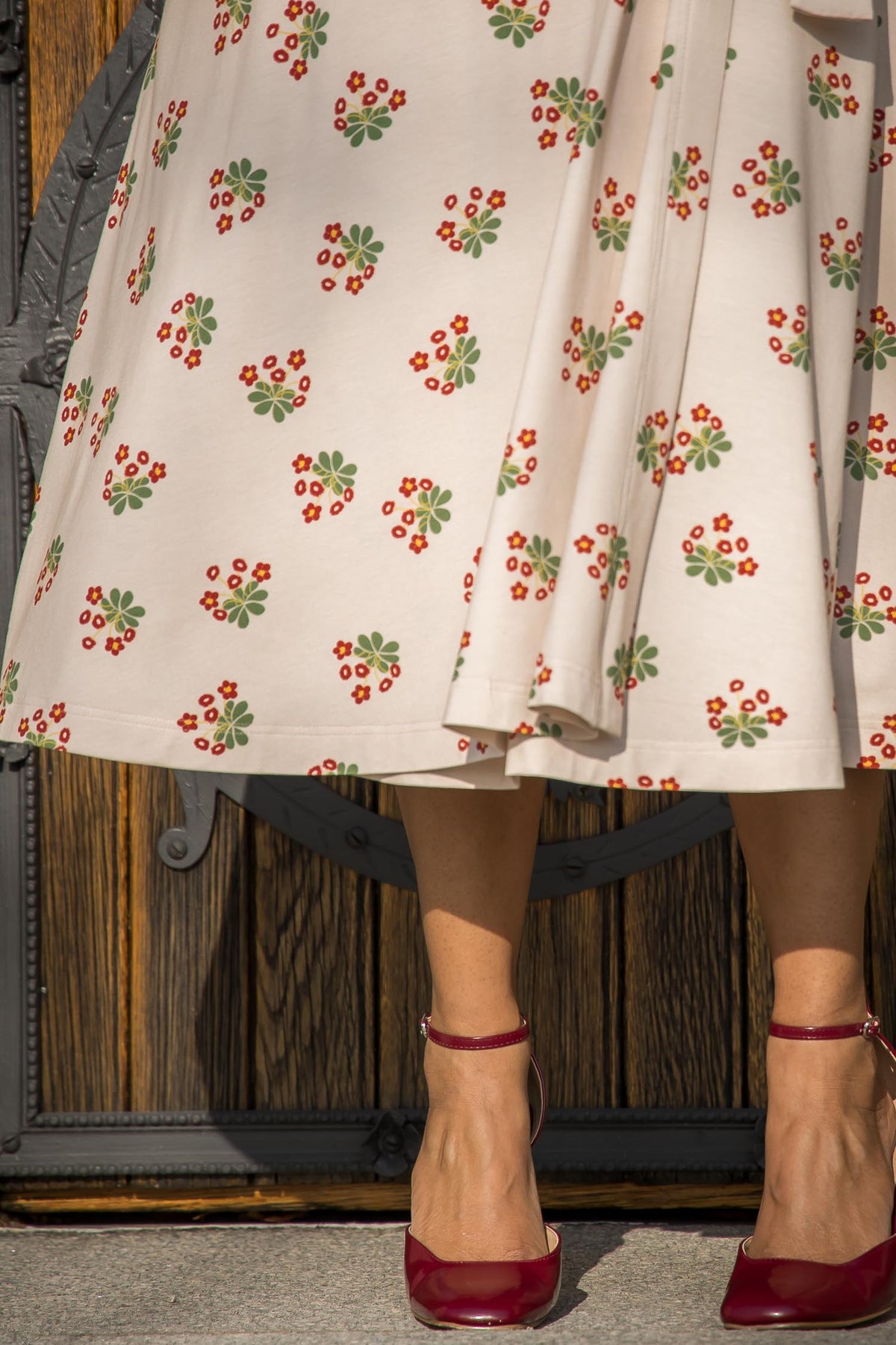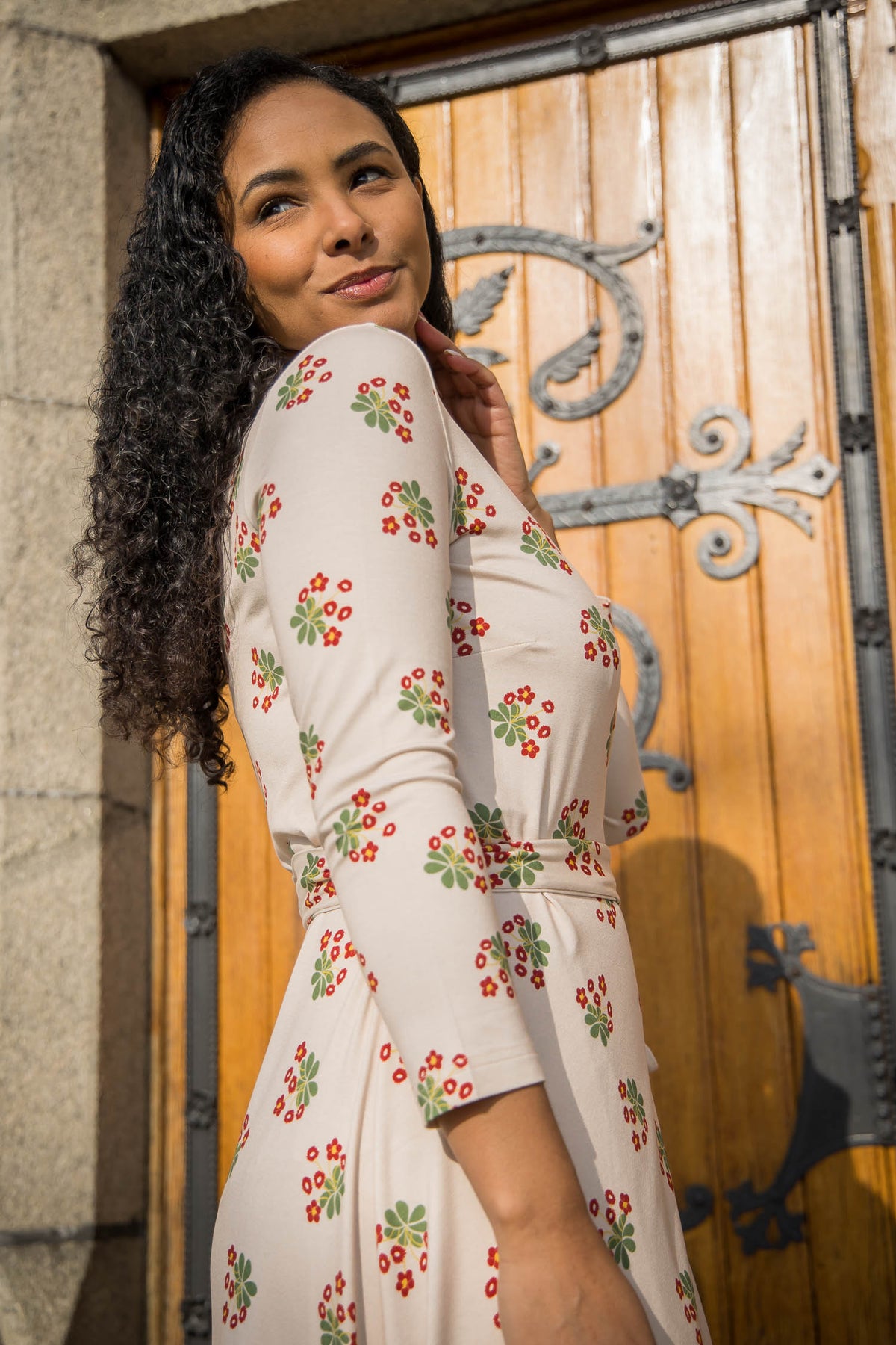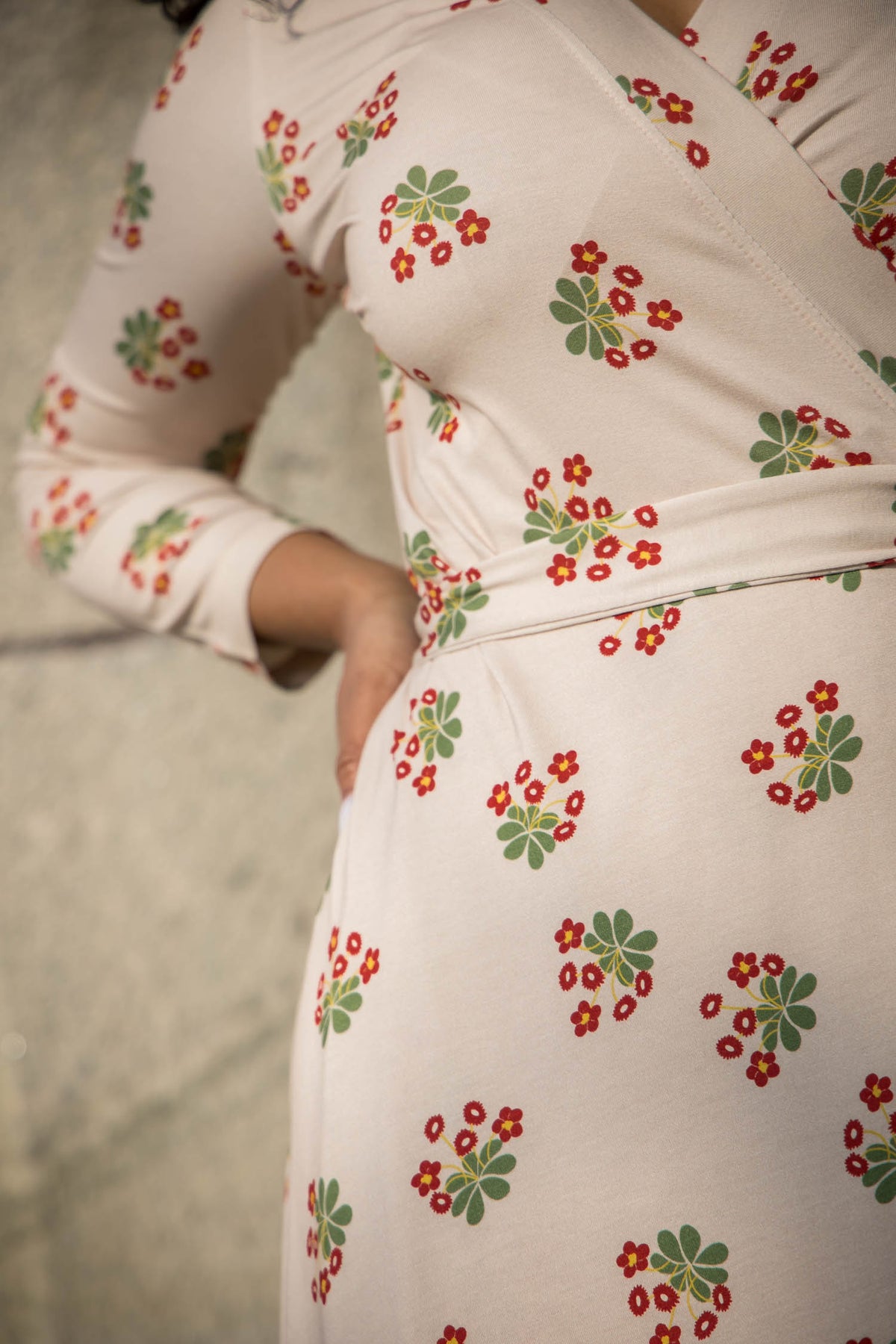 Tyget på denna omlottklänning har en beige botten med ett vackert blommönster i mörkt rött och grönt. Den har generöst med tyg och omlottar mycket runt kroppen och sluter fint vid nacken. Kjolen är rundskuren med härlig vidd och ett vackert fall.