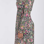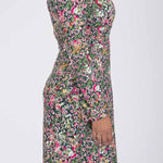 Detta klänningsmönster har en mörkblå botten som ger en sofistikerad och neutral grund, med livfulla gröna och rosa toner från pastell till fuchsia. Små inslag av gula och orange nyanser tillför värme och energi, vilket gör mönstret balanserat och mångsidigt för flera färgpaletter.