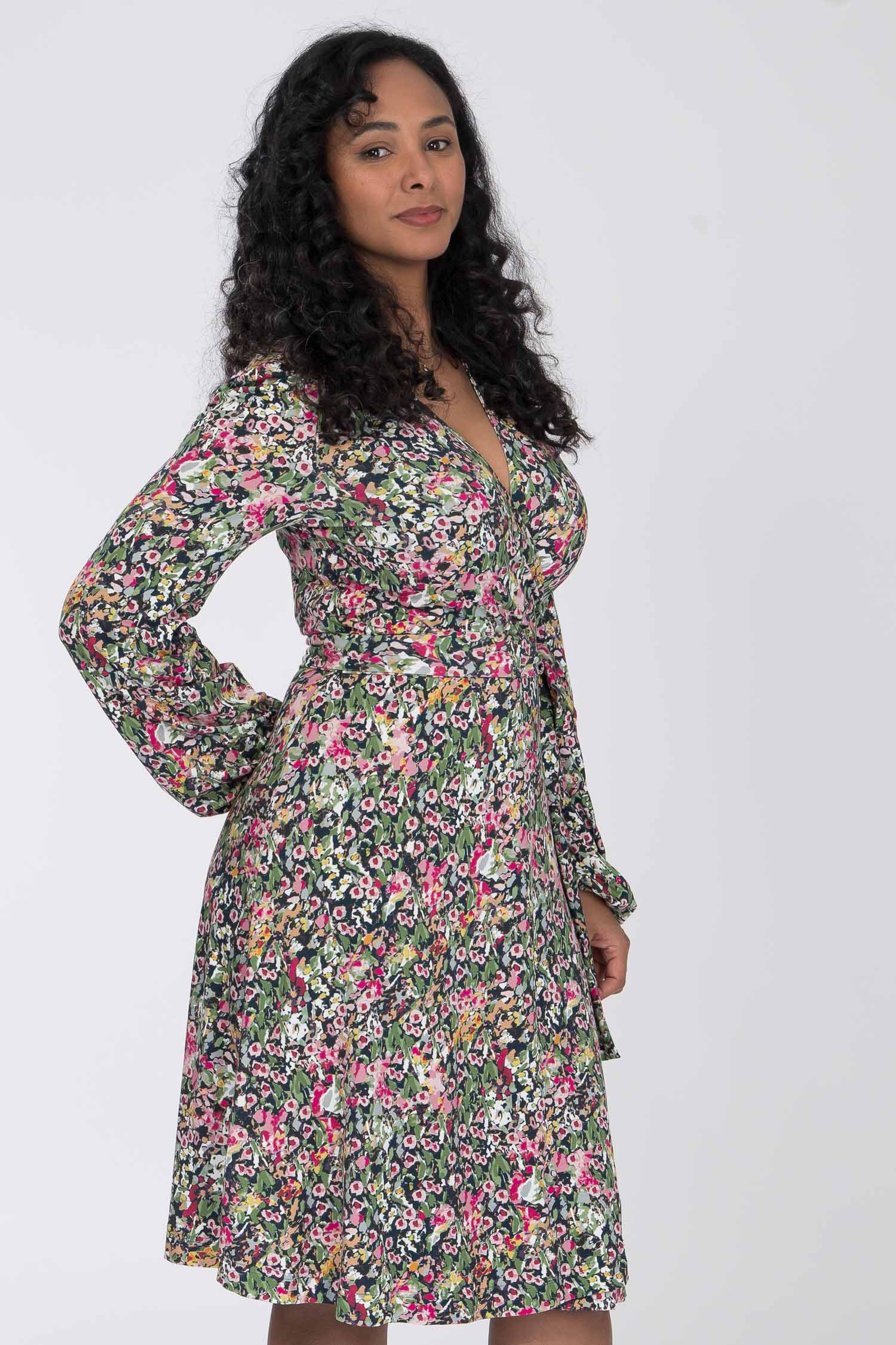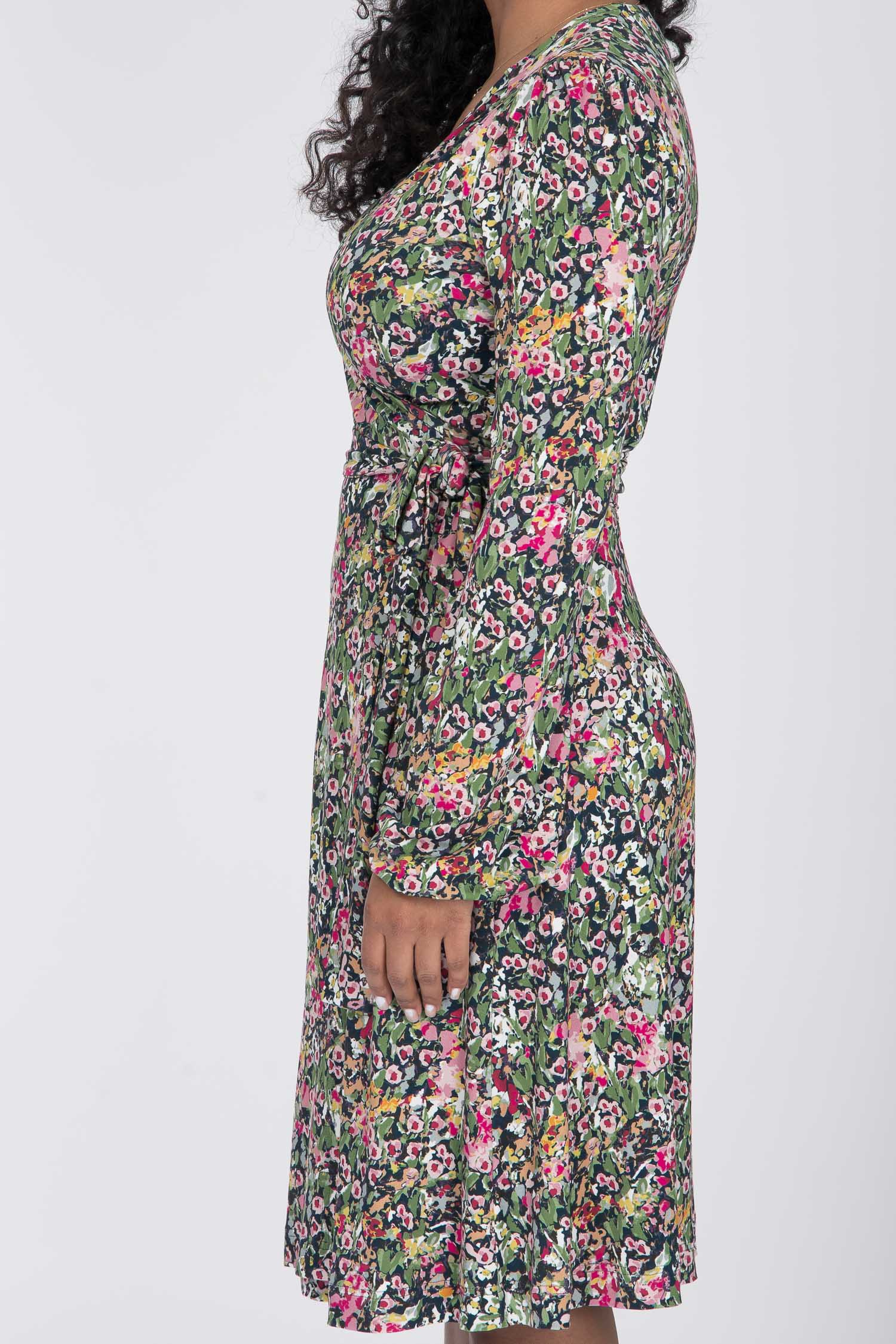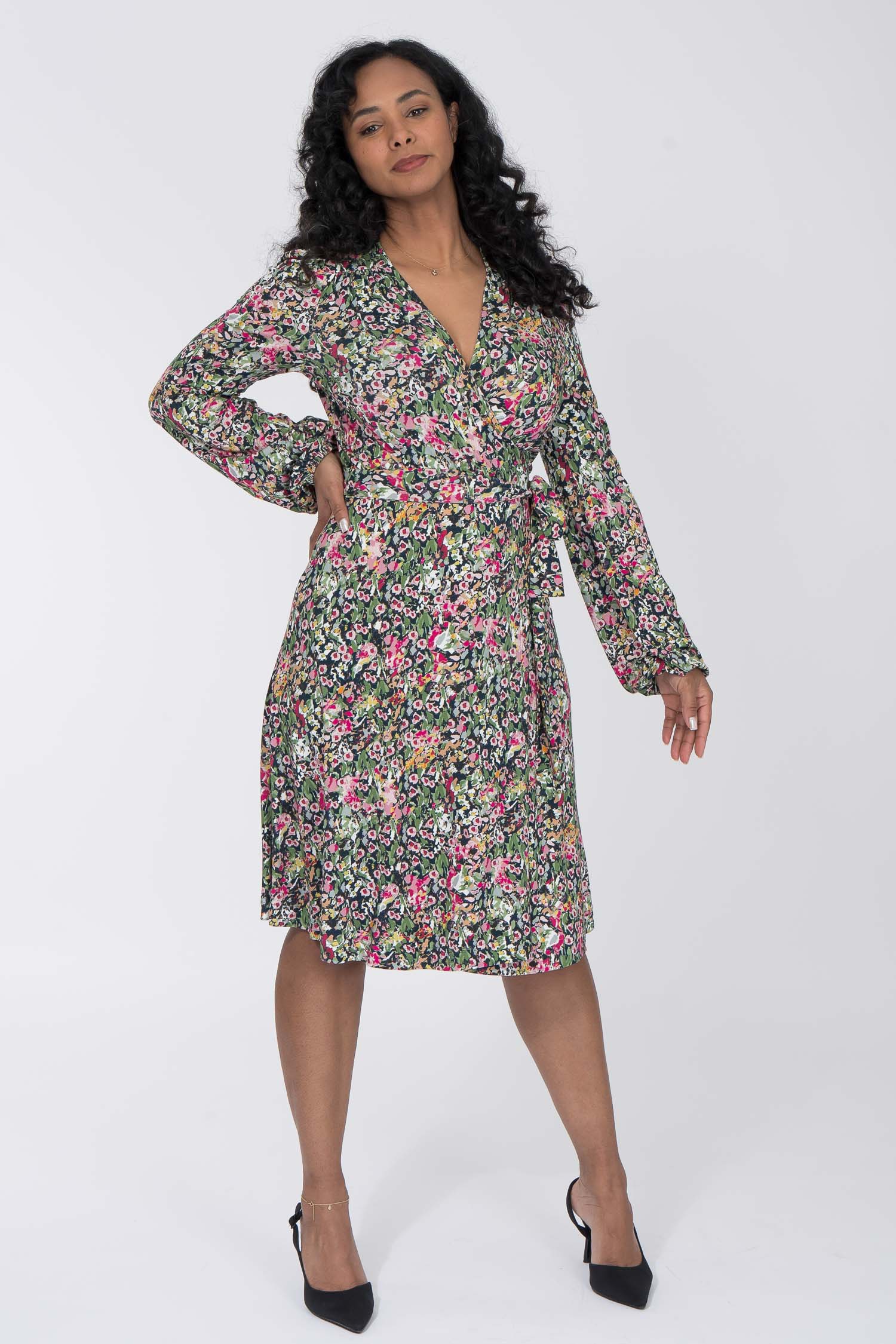 Omlottklänningen har ett härligt blommönster i rosa och grönt på en mörkblå botten som får dig att drömma bort till Monets trädgård. Tillverkad i mjuk och stretchig trikå av viskos och elastan, med tungt fall som smickrar din silhuett.