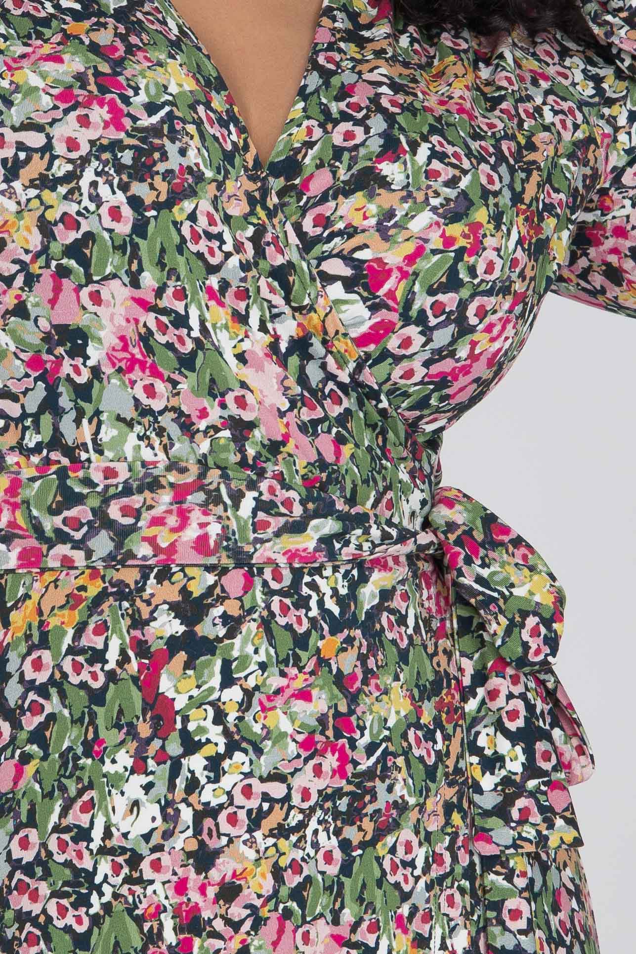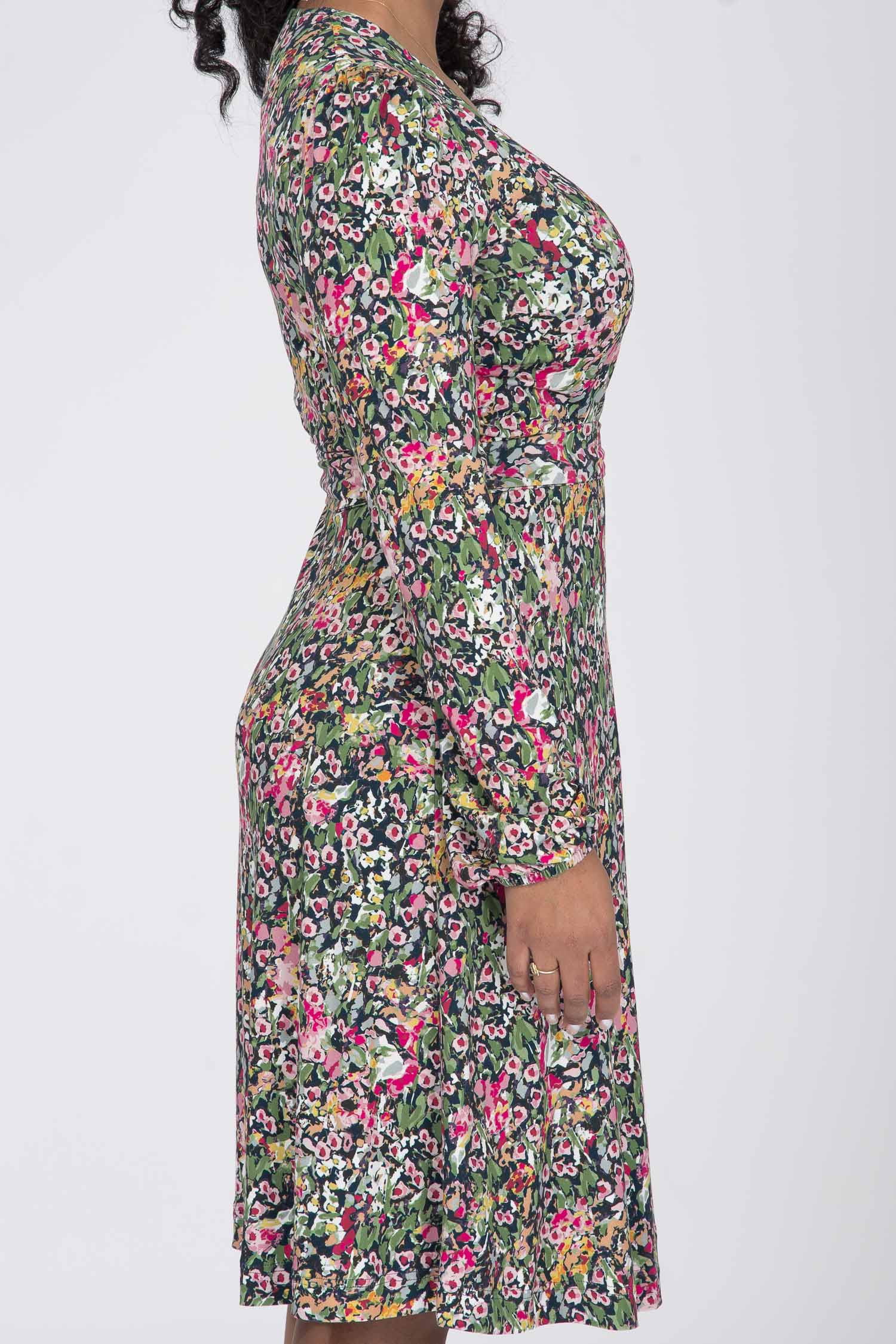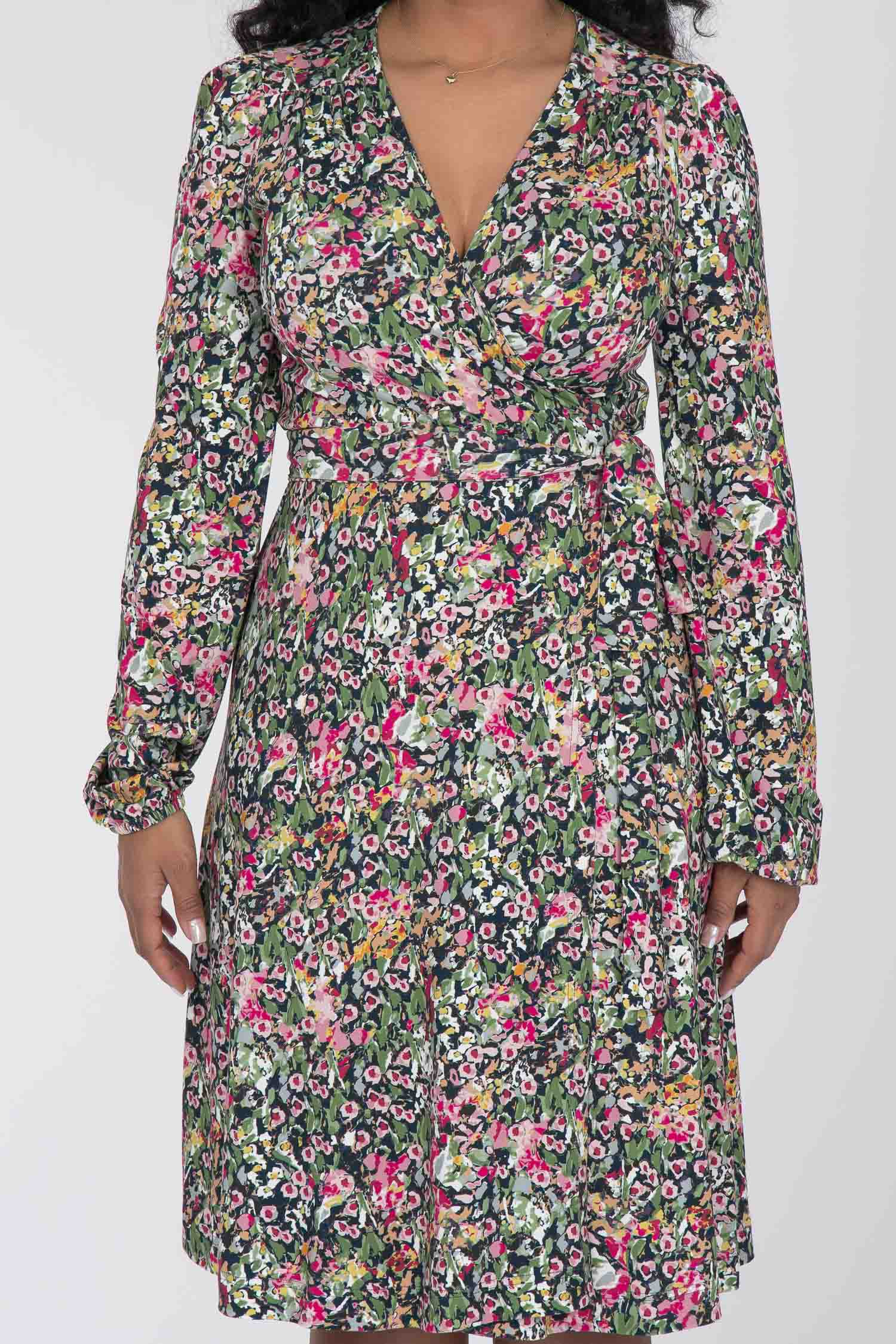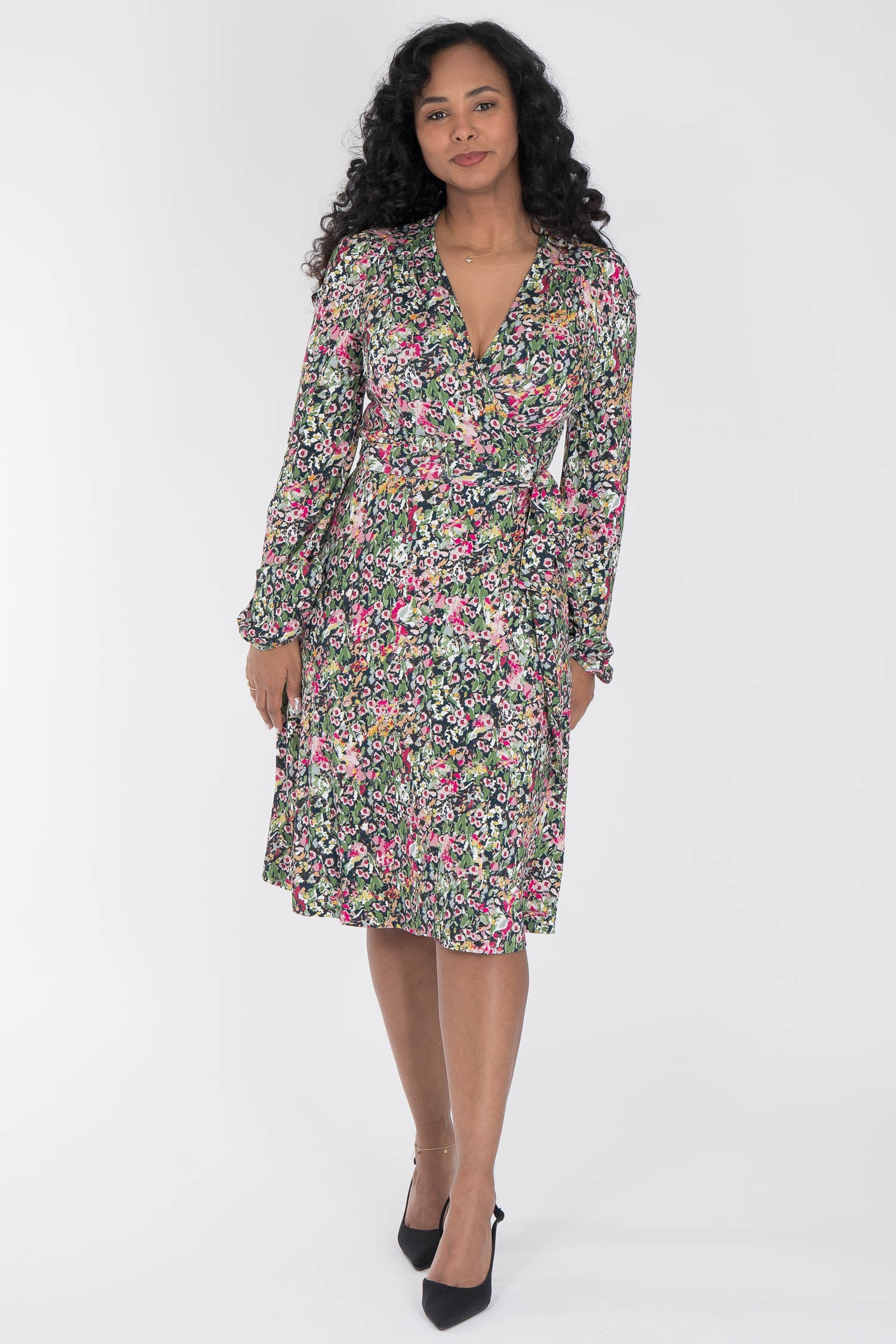 Omlottklänningen har ett härligt blommönster i rosa och grönt på en mörkblå botten som får dig att drömma bort till Monets trädgård. Tillverkad i mjuk och stretchig trikå av viskos och elastan, med tungt fall som smickrar din silhuett.