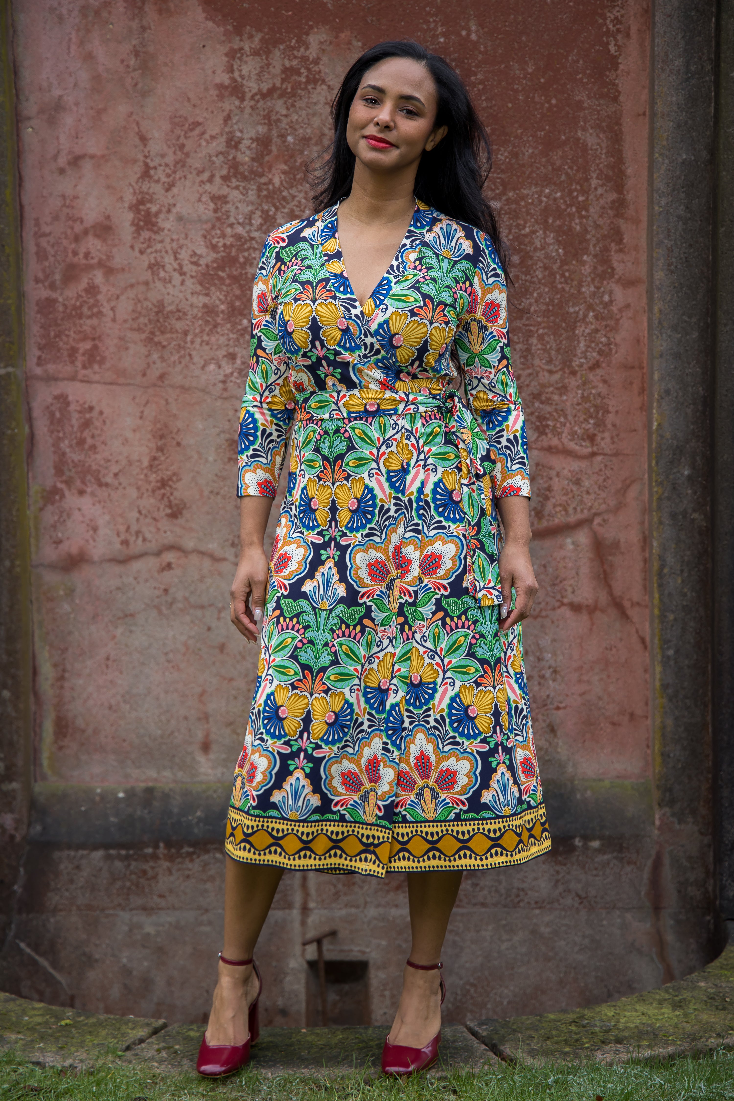 Våra modeller av omlottklänningar är alla olika med sin egna unika design. Vissa omlottklänningar knyts med tunna band på insidan och bredare, synliga band som knyts i sidan. Några omlottklänningar knyts högre upp under bysten. Andra omlottklänningar har knytband som träs genom en öppning i sidan som sedan knyts runt om midjan på olika sätt. Vilken modell man gillar bäst är självklart en smaksak, alla har sina fördelar! Klänningsmodellerna återkommer ständigt i nya färger och mönster. Vi ser fram emot att du ska hitta den perfekta omlottklänningen för dig.