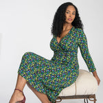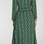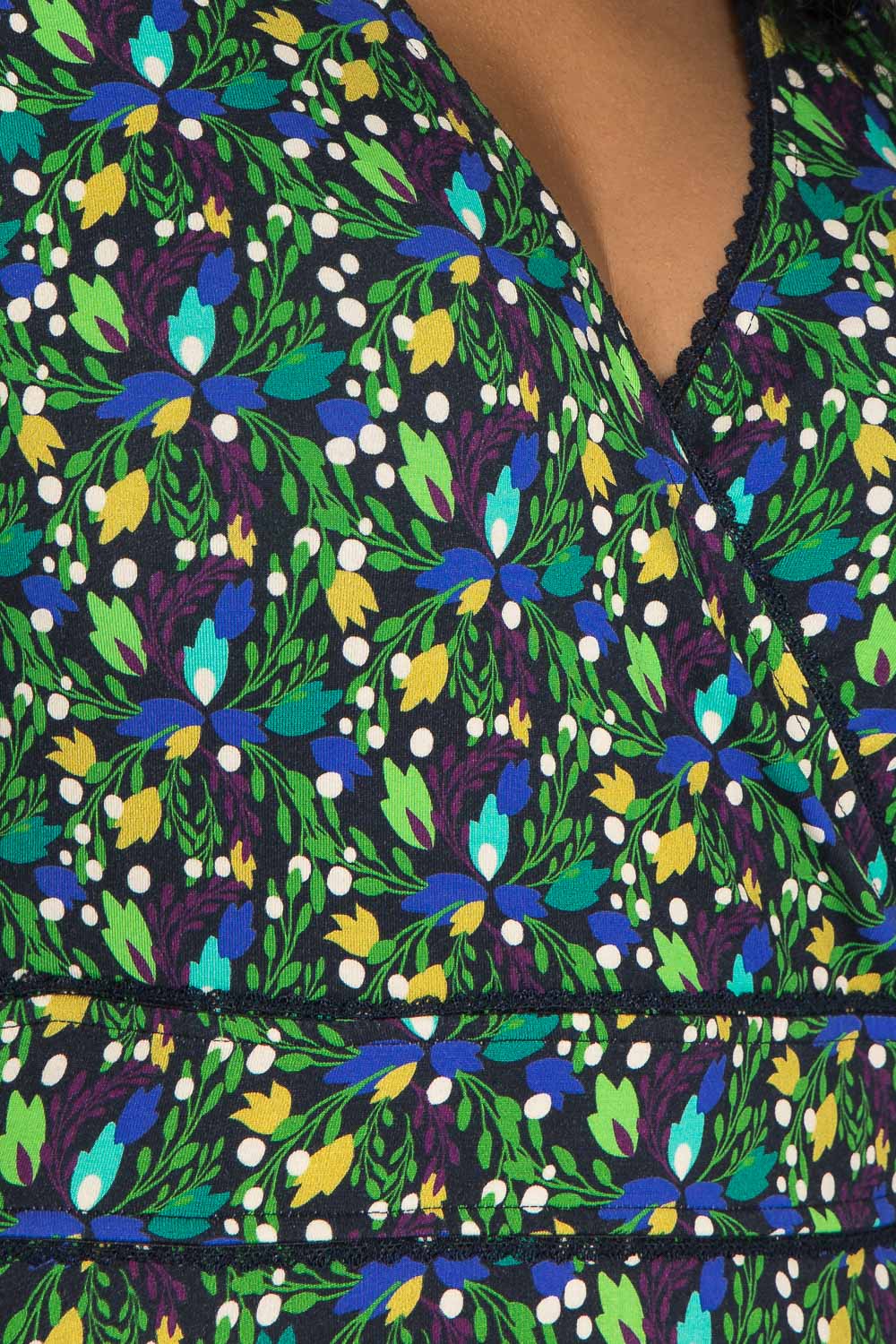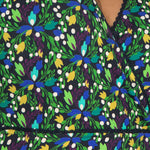 En klänning i mjuk trikå med ett blommönster i grönt, blått, turkost och gult på mörkt marinblå botten – en färgkombination som känns både modern och nostalgisk.