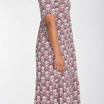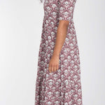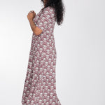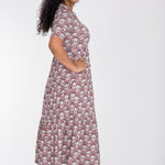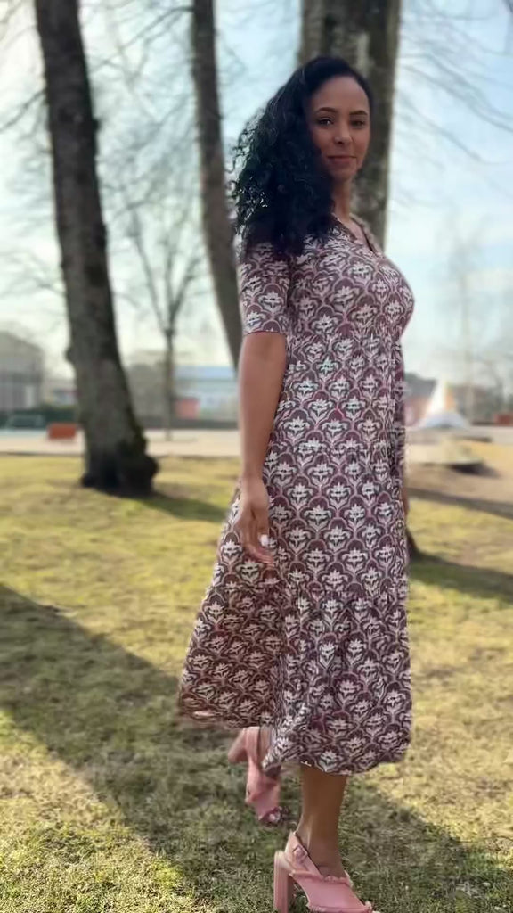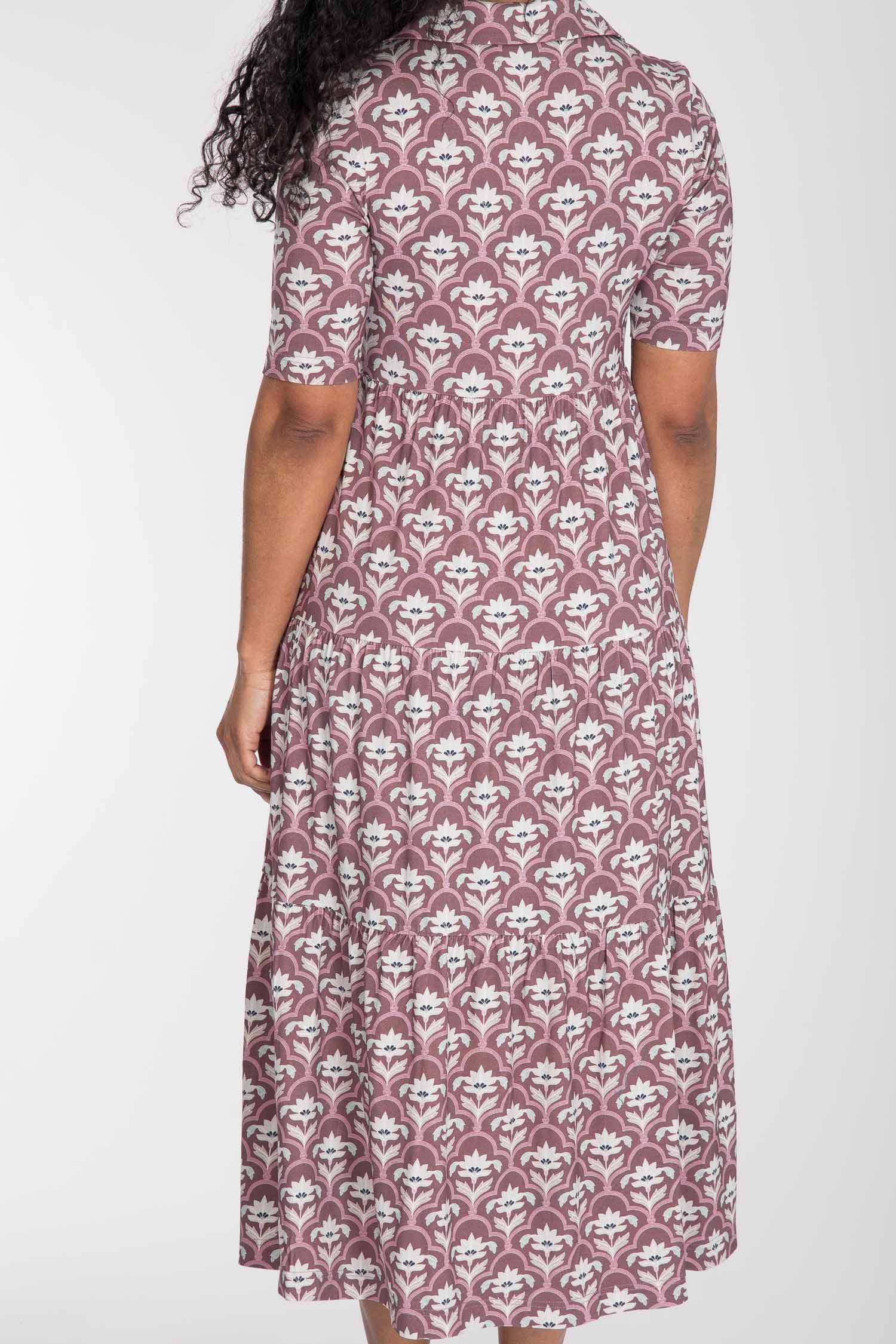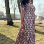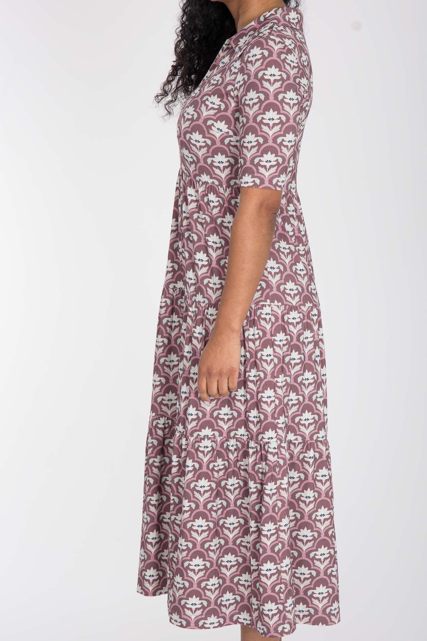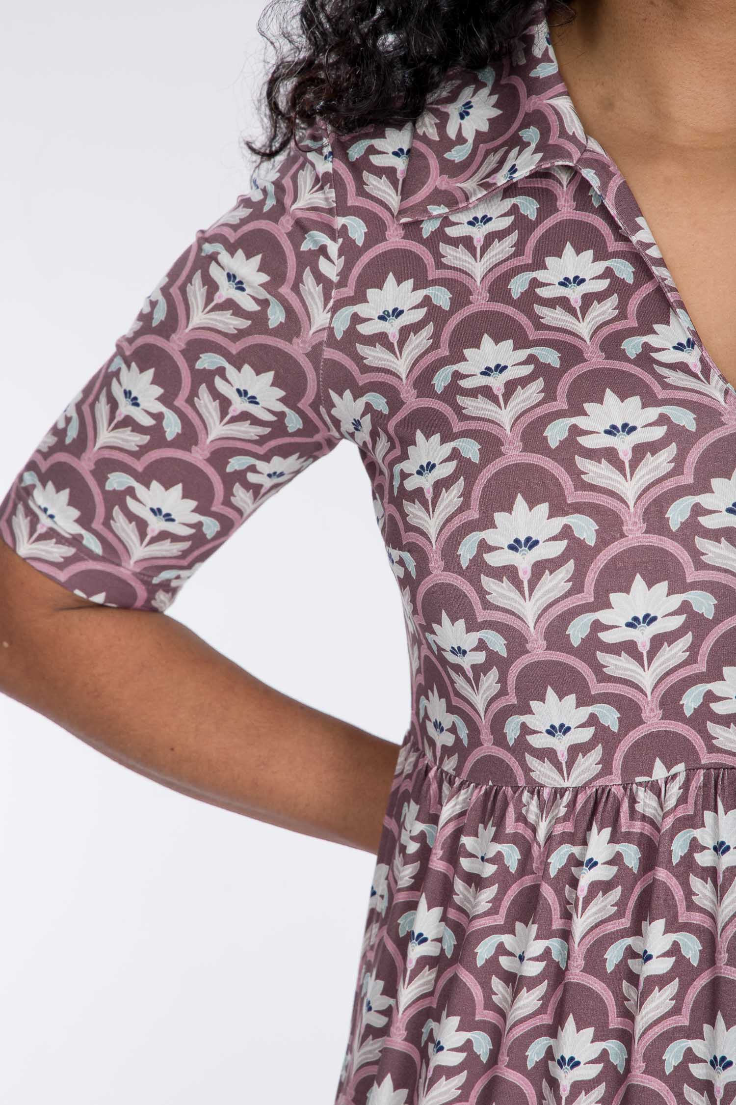 Den avslappnade skärningen strax under bysten gör att den faller fint, och kjolen med sina diskreta volanger ger precis lagom mycket vidd. Kragen och den öppna halsringningen ger en feminin touch som gör klänningen lika självklar till vardag som till fest. Det ornamentalt blommönstrade tyget sätter pricken över i:et – och räkna med komplimanger!