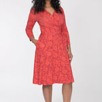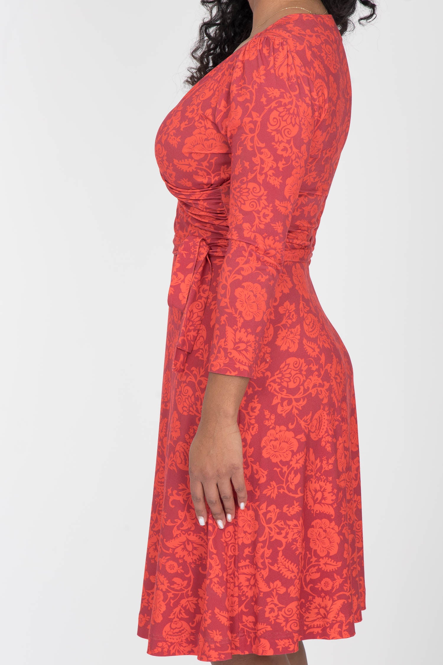 Omlottlivet med drapering i sidan och de ¾-långa ärmarna med rynk vid axeln skapar en feminin helhet. Den utställda kjolen faller fint, och det fastsydda knytbandet i midjan kan knytas både fram och bak för att variera stilen. Sidfickor gör klänningen både praktisk och bekväm.