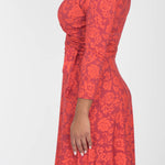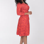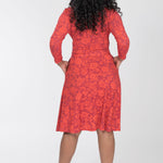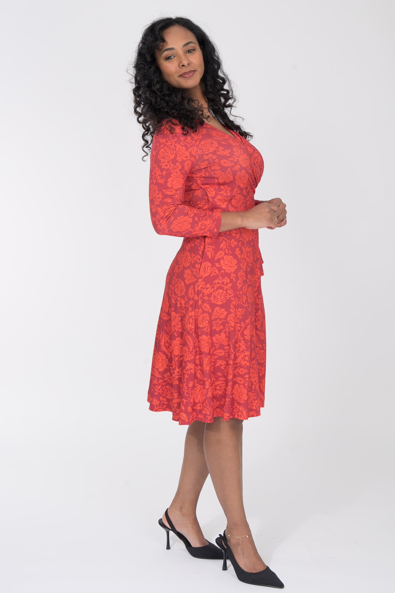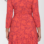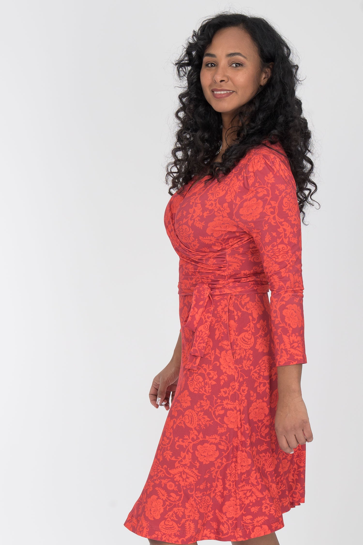 Ready to go – en knälång trikåklänning som kombinerar komfort med genomtänkta detaljer. Det orange blommönstret på vinröd botten ger en varm och livfull känsla som fungerar lika bra till vardag som till kväll.