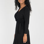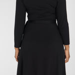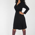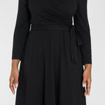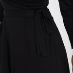 Ready to go – en knälång trikåklänning som kombinerar komfort med genomtänkta detaljer. Omlottlivet med drapering i sidan och de ¾-långa ärmarna med rynk vid axeln skapar en feminin helhet. Den utställda kjolen faller fint, och det fastsydda knytbandet i midjan kan knytas både fram och bak för att variera stilen. Sidfickor gör klänningen både praktisk och bekväm.