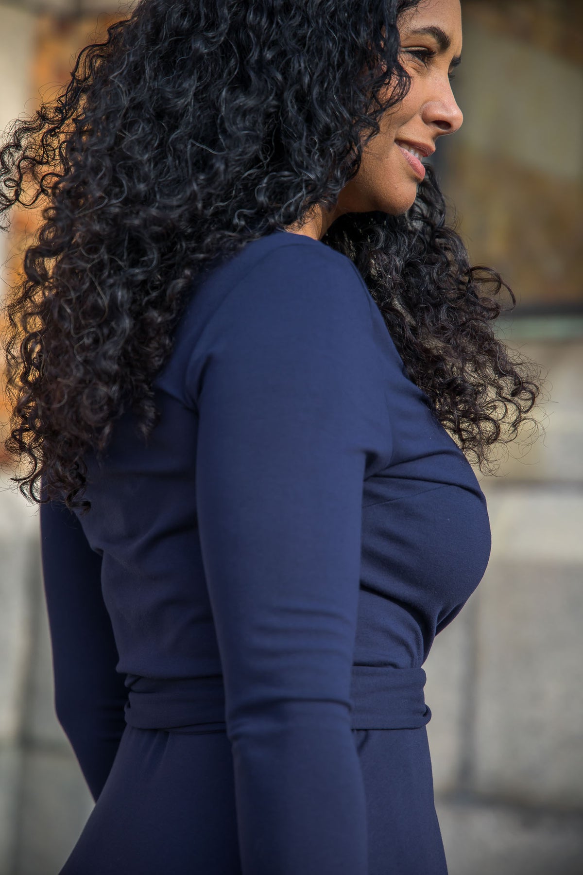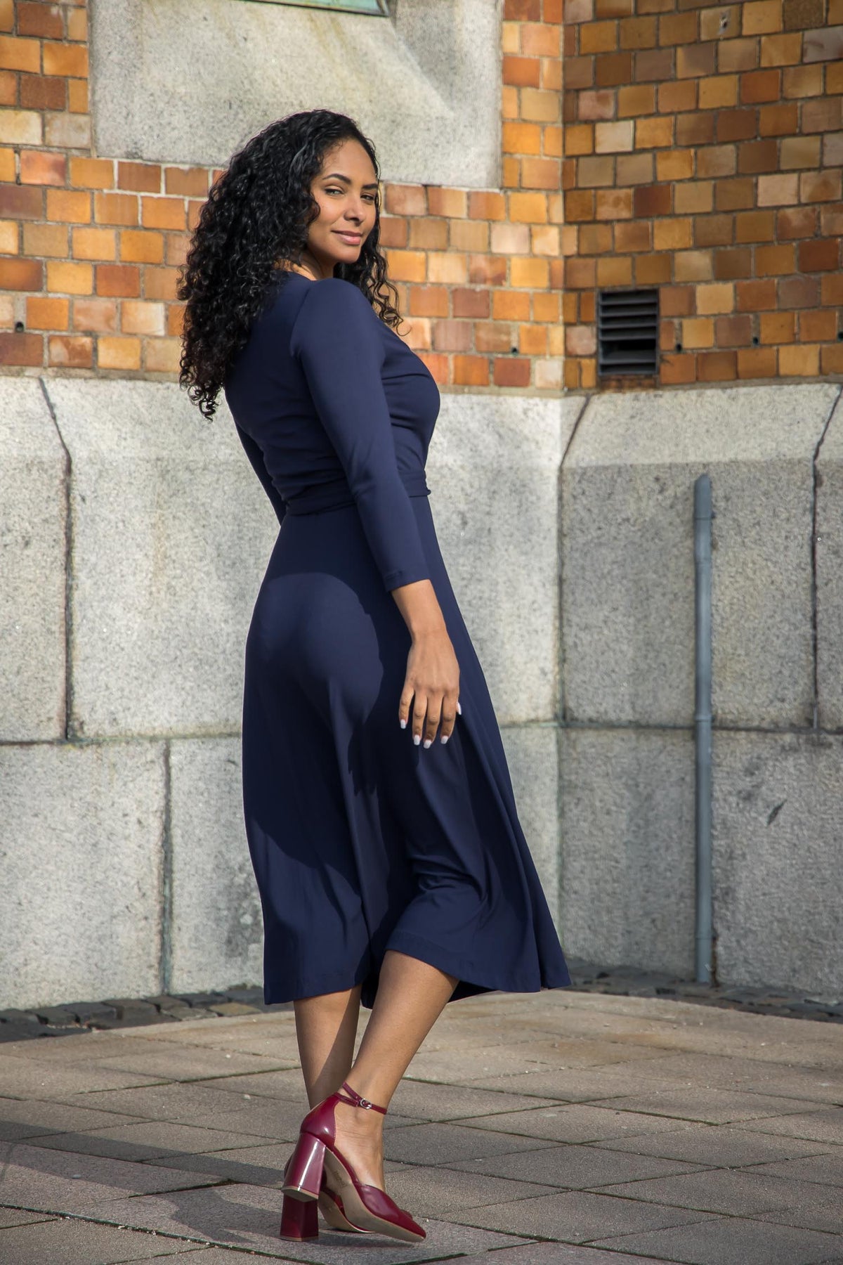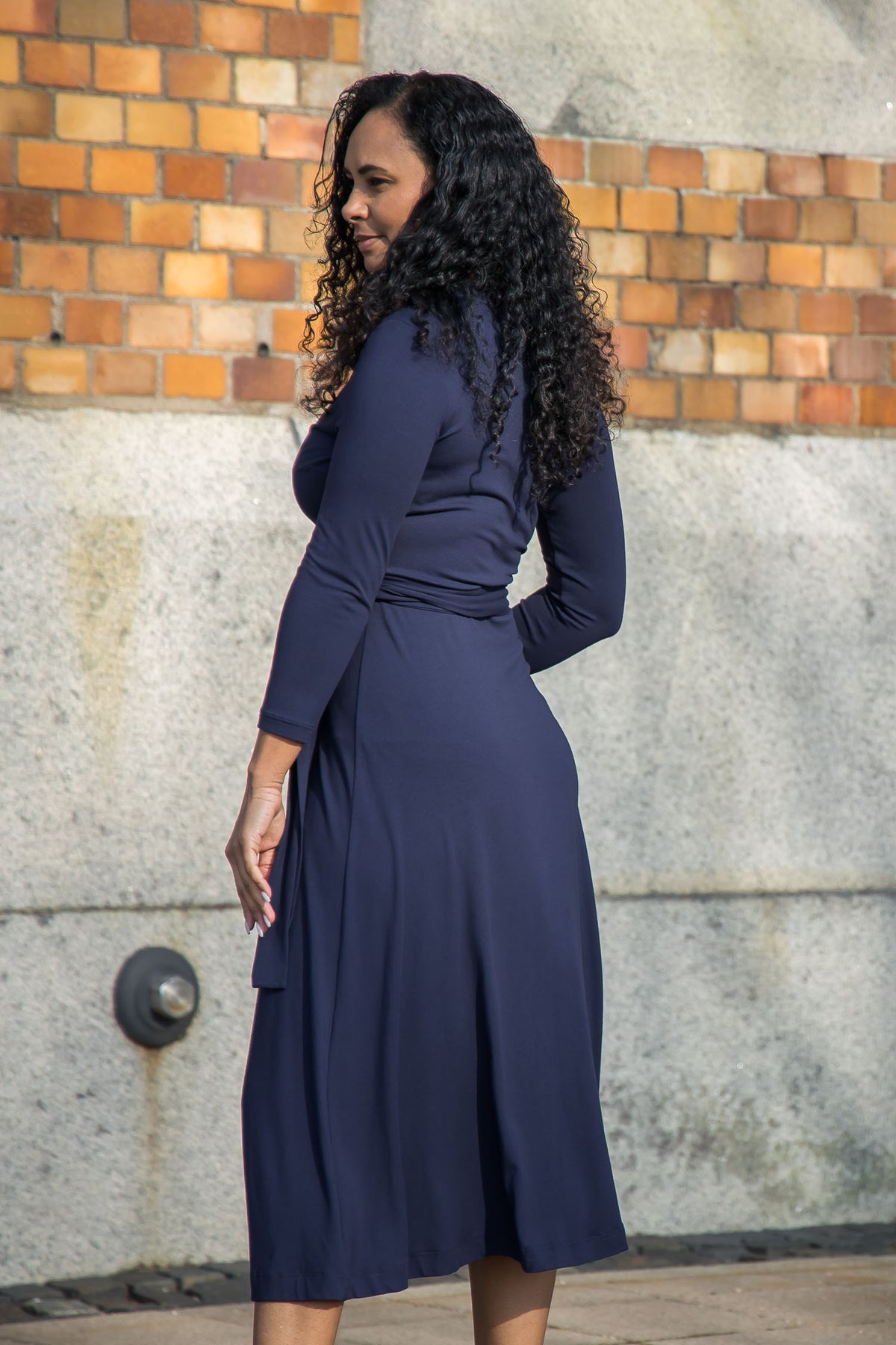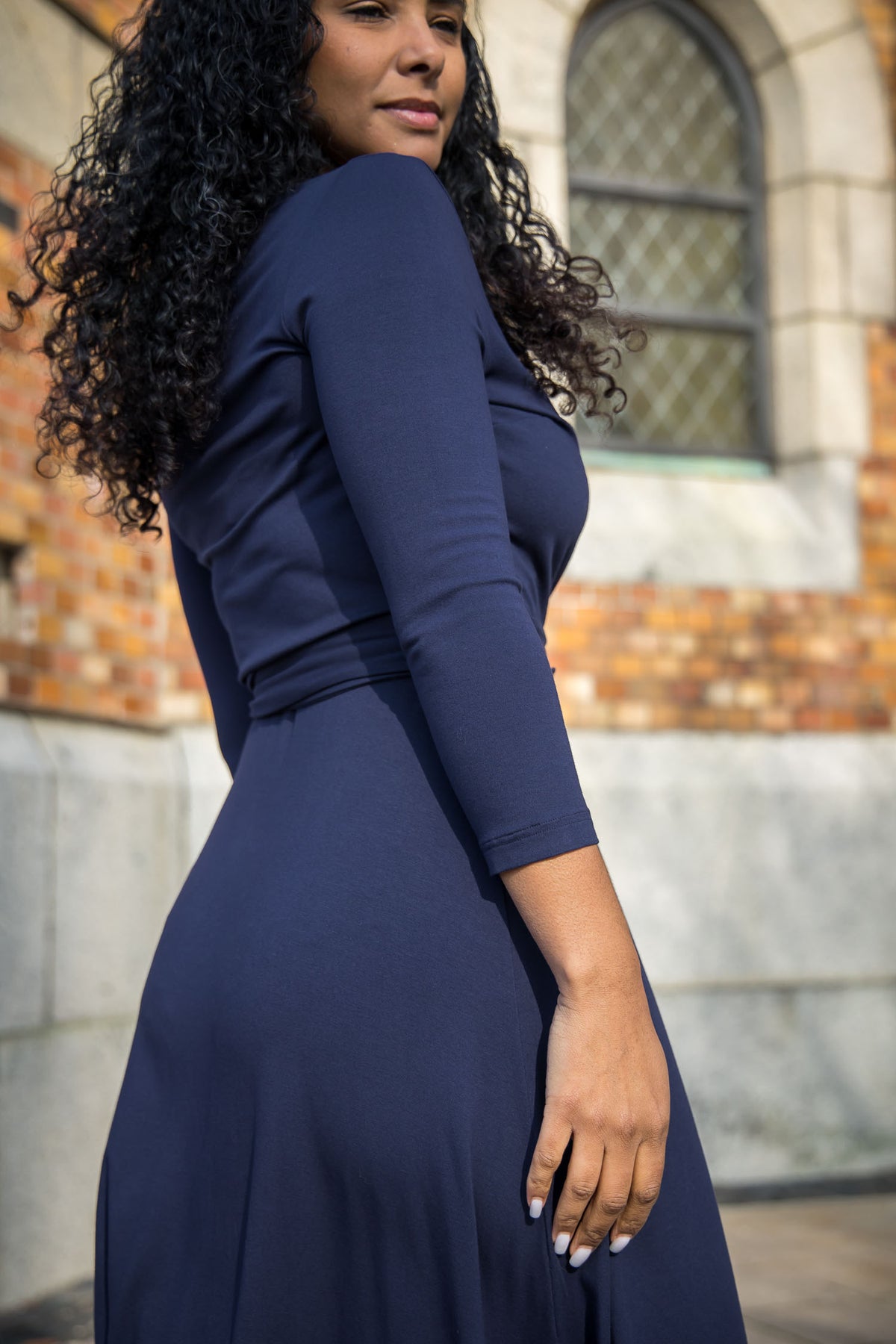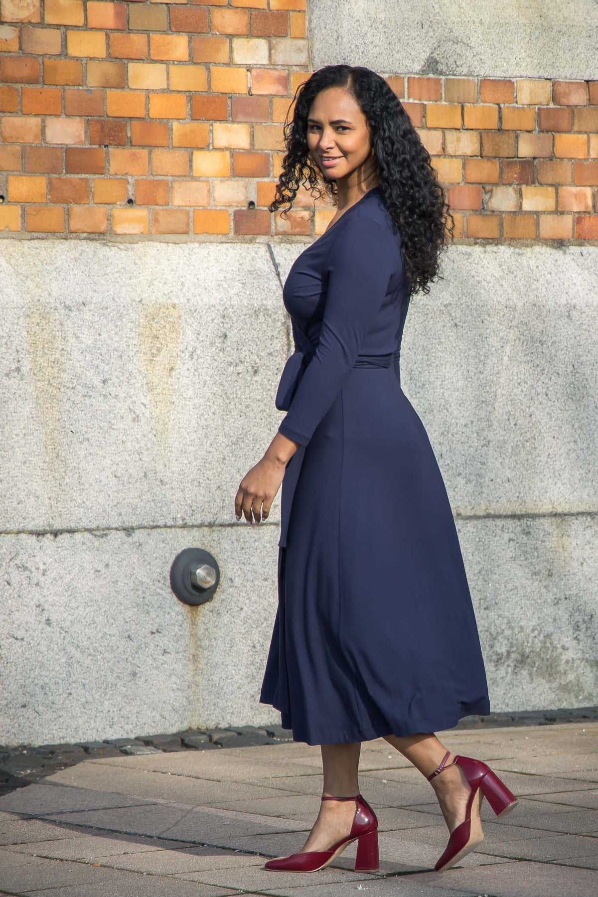 Omlottklänningen är sydd i en stretchig trikå med viskos och elastan med ett tungt fall. Kvalitén är mjuk, följsam, nopprar inte och håller både formen och färg tvätt efter tvätt. Med andra ord – här har du en klänning gjort för att användas mycket (och länge)