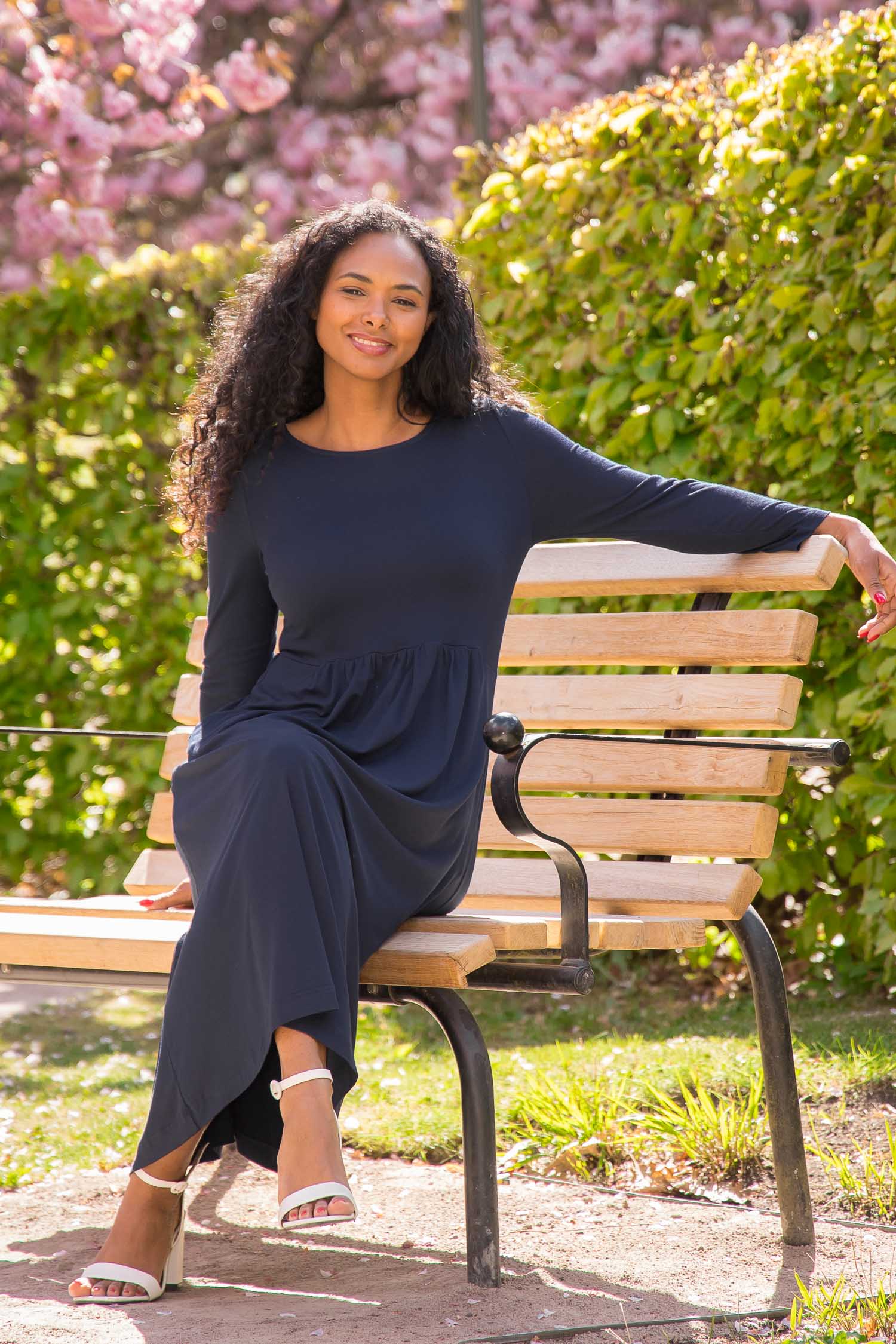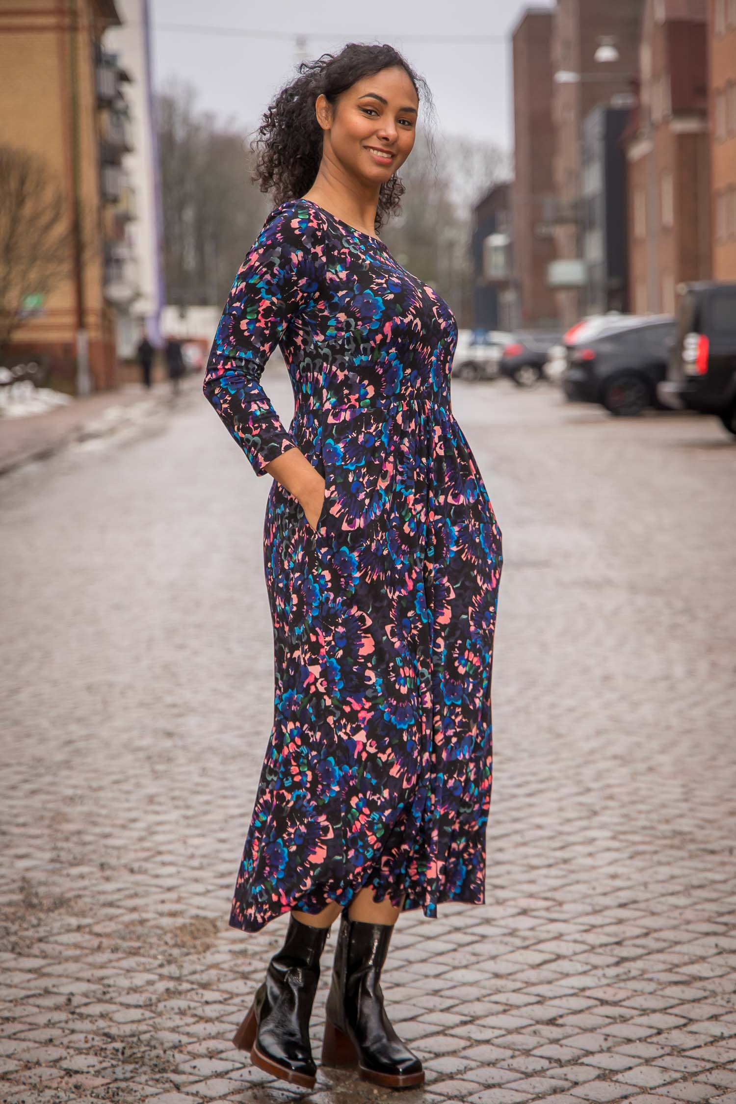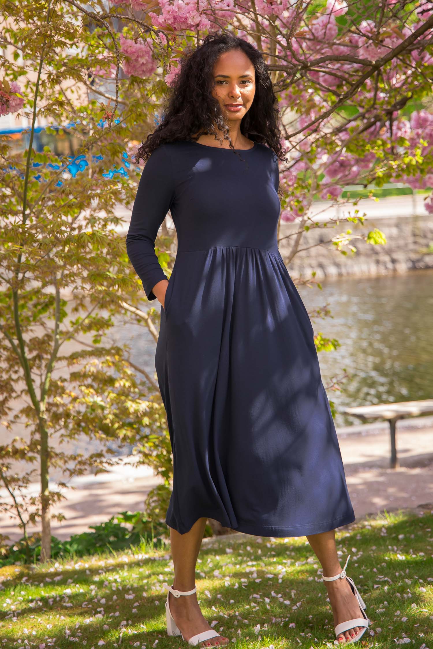 Omlottklänning utan knytband, fastsydd i midjan och enkel att dra på. Både överdelen och kjolen omlottar framtill, vilket ger en välsittande och lättburen passform. Ärm med lätt rynk upptill. Klockad kjol med vidd. Sys i stretchig viskos/elastan-trikå med tungt fall.