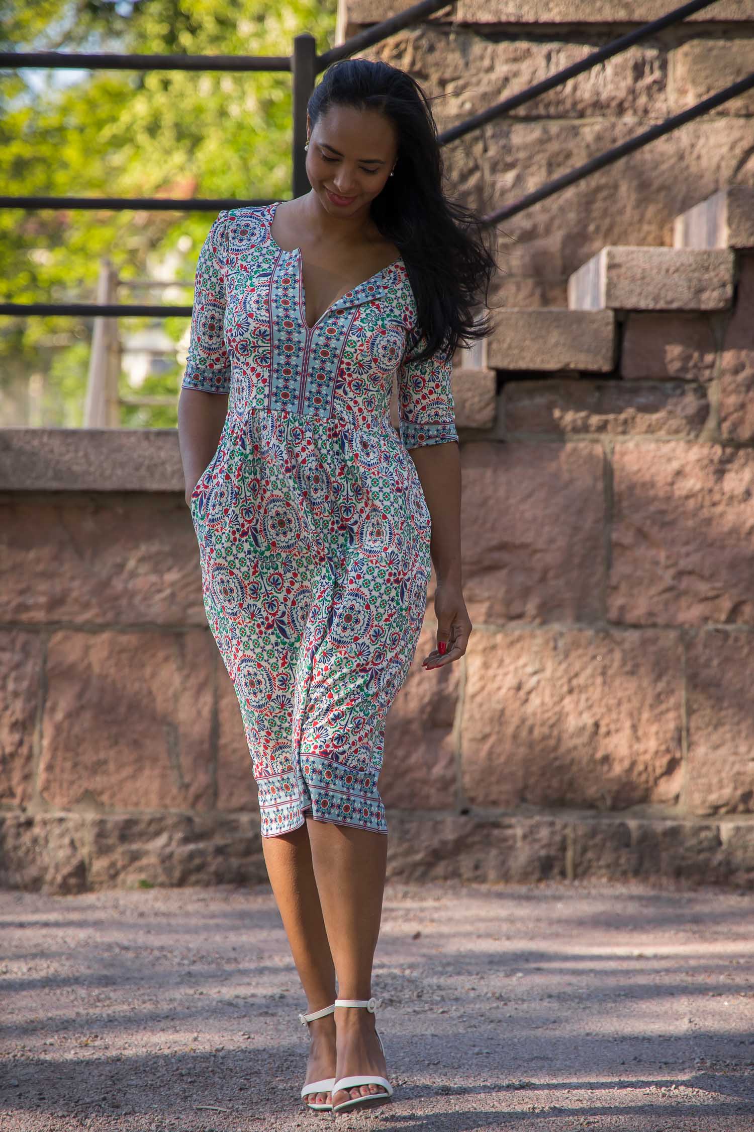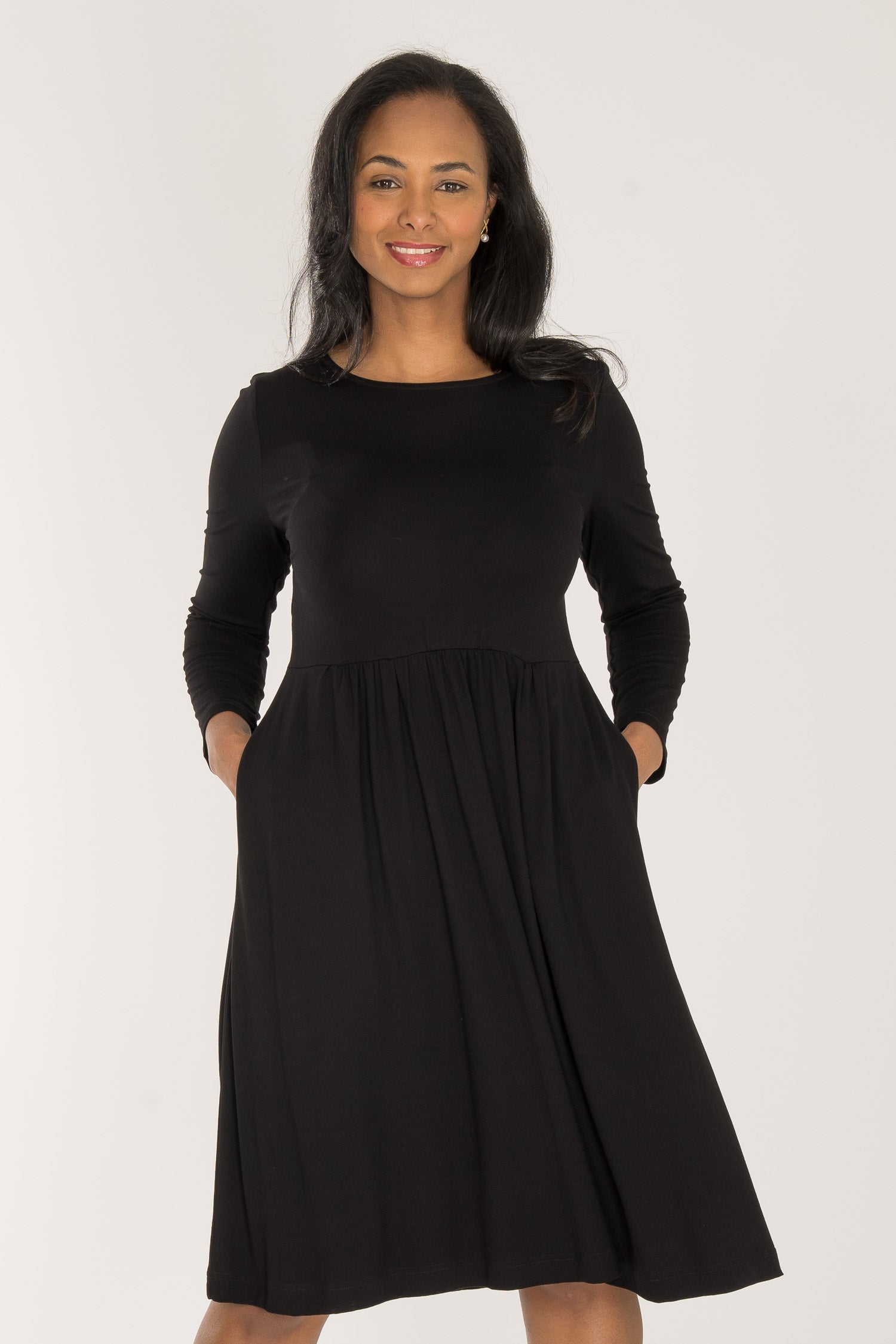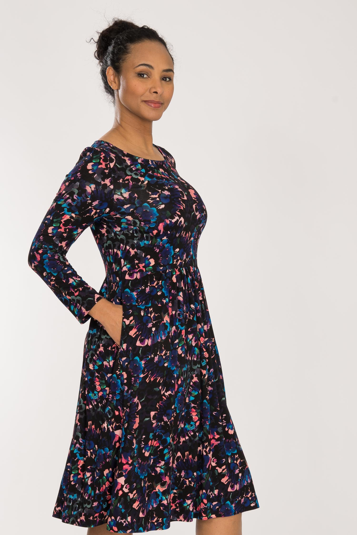Omlottklänning utan knytband, fastsydd i midjan och enkel att dra på. Både överdelen och kjolen omlottar framtill, vilket ger en välsittande och lättburen passform. Ärm med lätt rynk upptill. Klockad kjol med vidd. Sys i stretchig viskos/elastan-trikå med tungt fall.