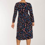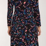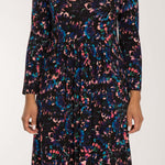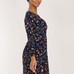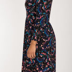 Detta klänningsmönster har en svart botten som ger en dramatisk grund, med marinblått, turkos och grönt för djup och rosa toner som skapar en energisk kontrast. Den harmoniska kombinationen av mörka och klara toner gör detta mönster perfekt för dig som söker en klänning som matchar din färgpalett.