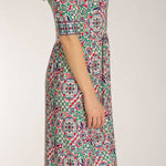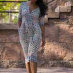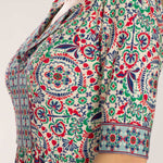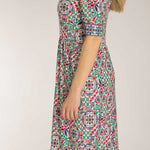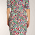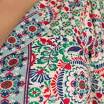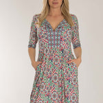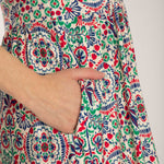 Vår populära Ideal dress finns nu i ett mönster med folkinspirerade medaljonger i rött, grönt och marinblått på ljus botten. Samma sköna passform – men med ny halsringning med en öppning framtill, inramad av en bård som också syns vid ärmslut och fåll.