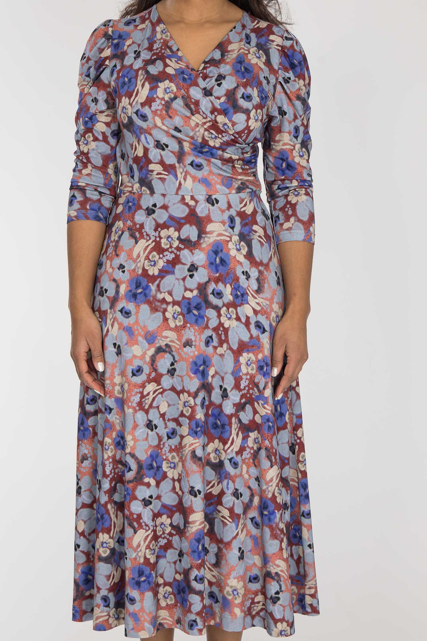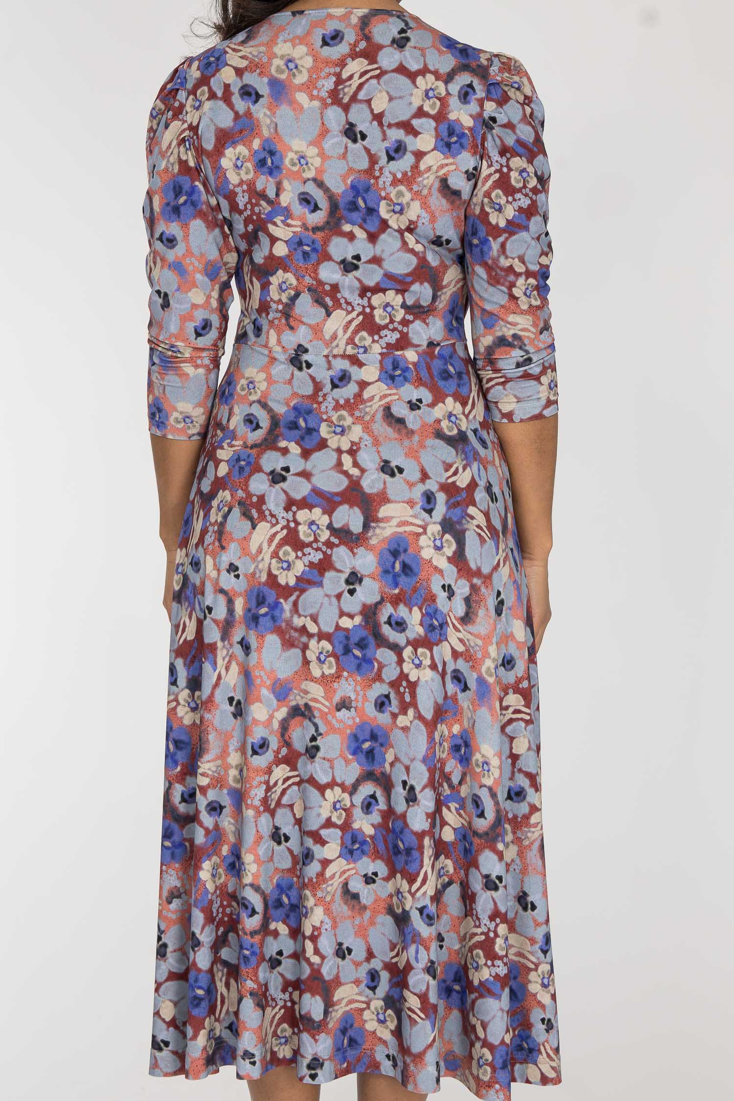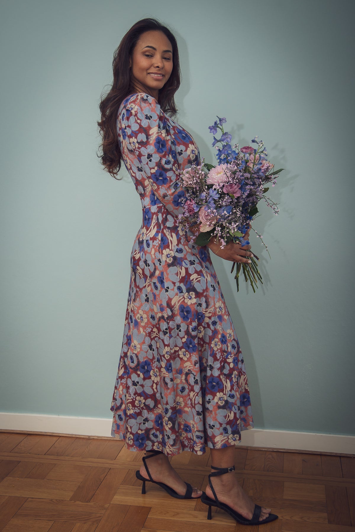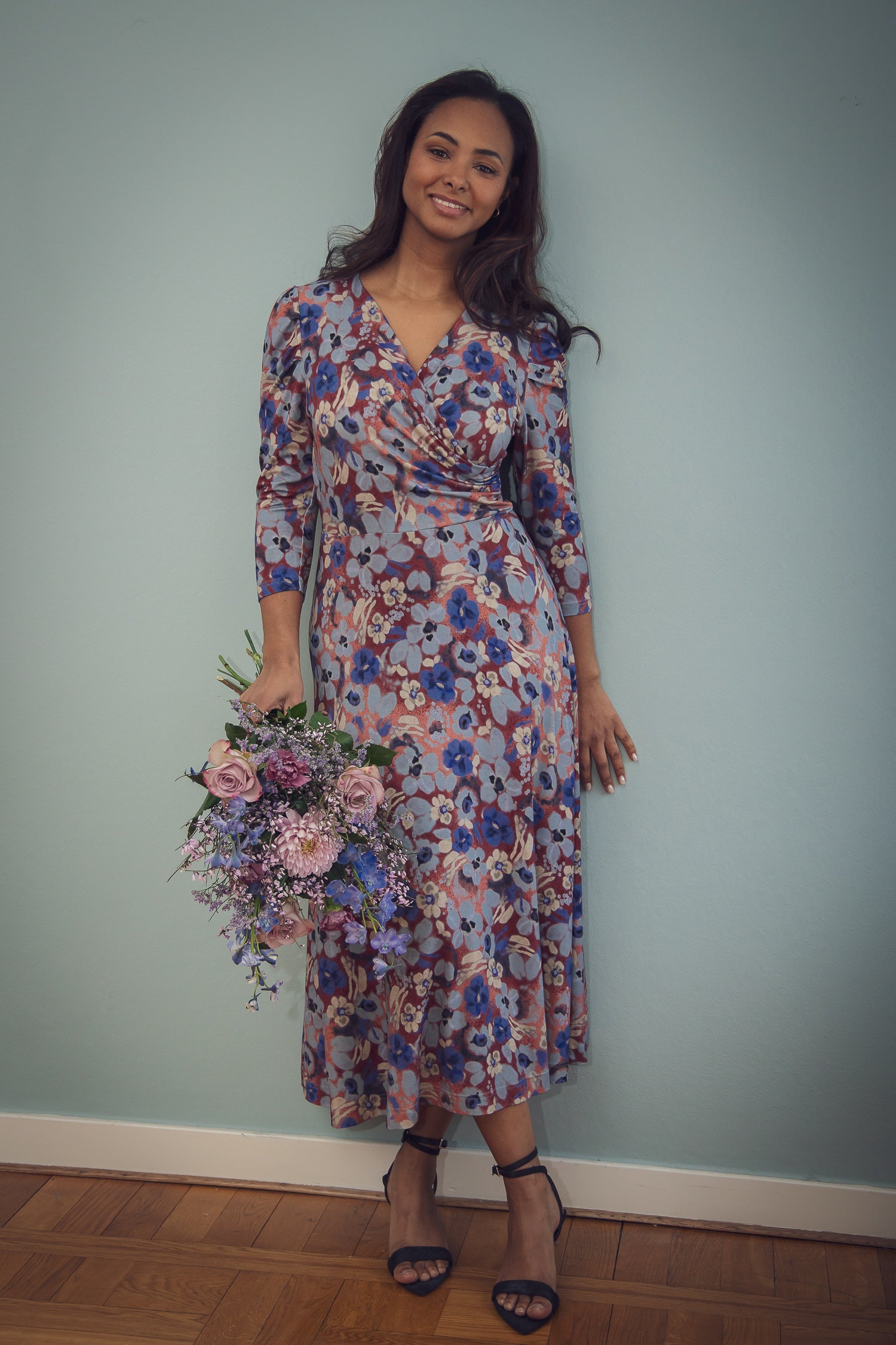 The dress features ¾-length puff sleeves and comes in a new print with a red-brown base and flowers in shades of blue. A comfortable yet refined style that works just as well for everyday wear as it does for more dressed-up occasions. Also available in a shorter knee-length.