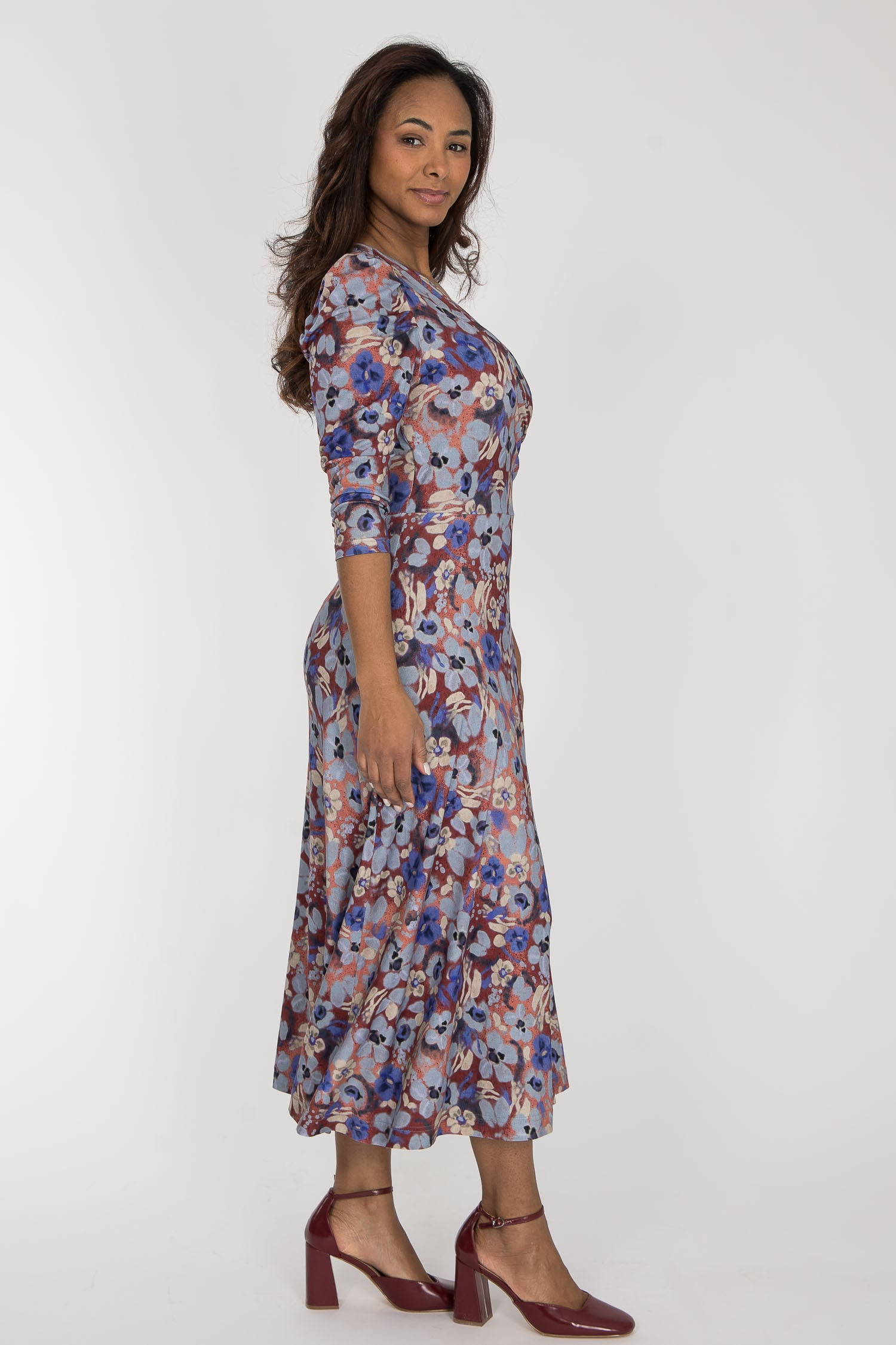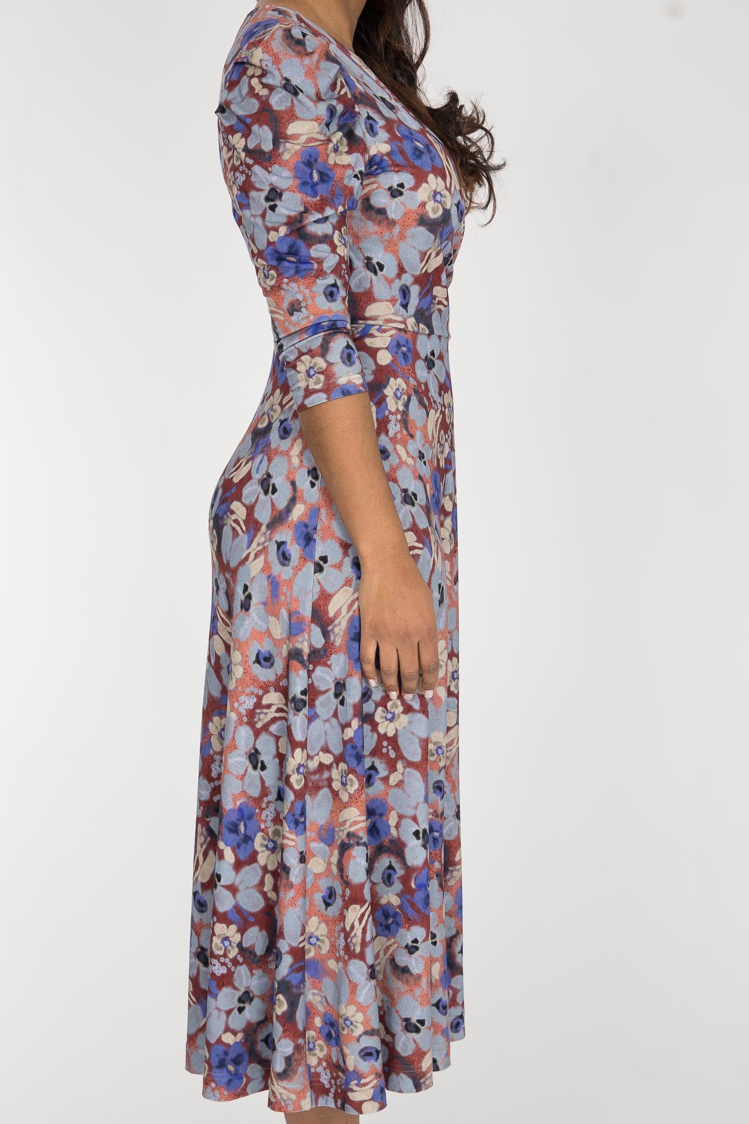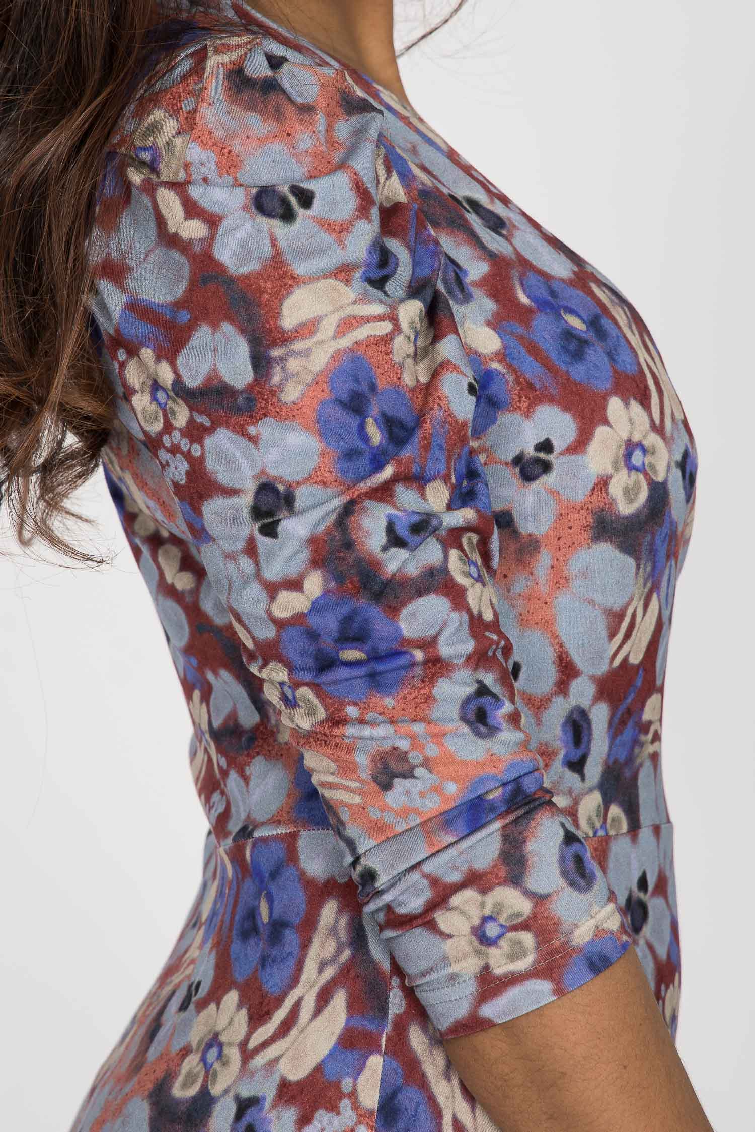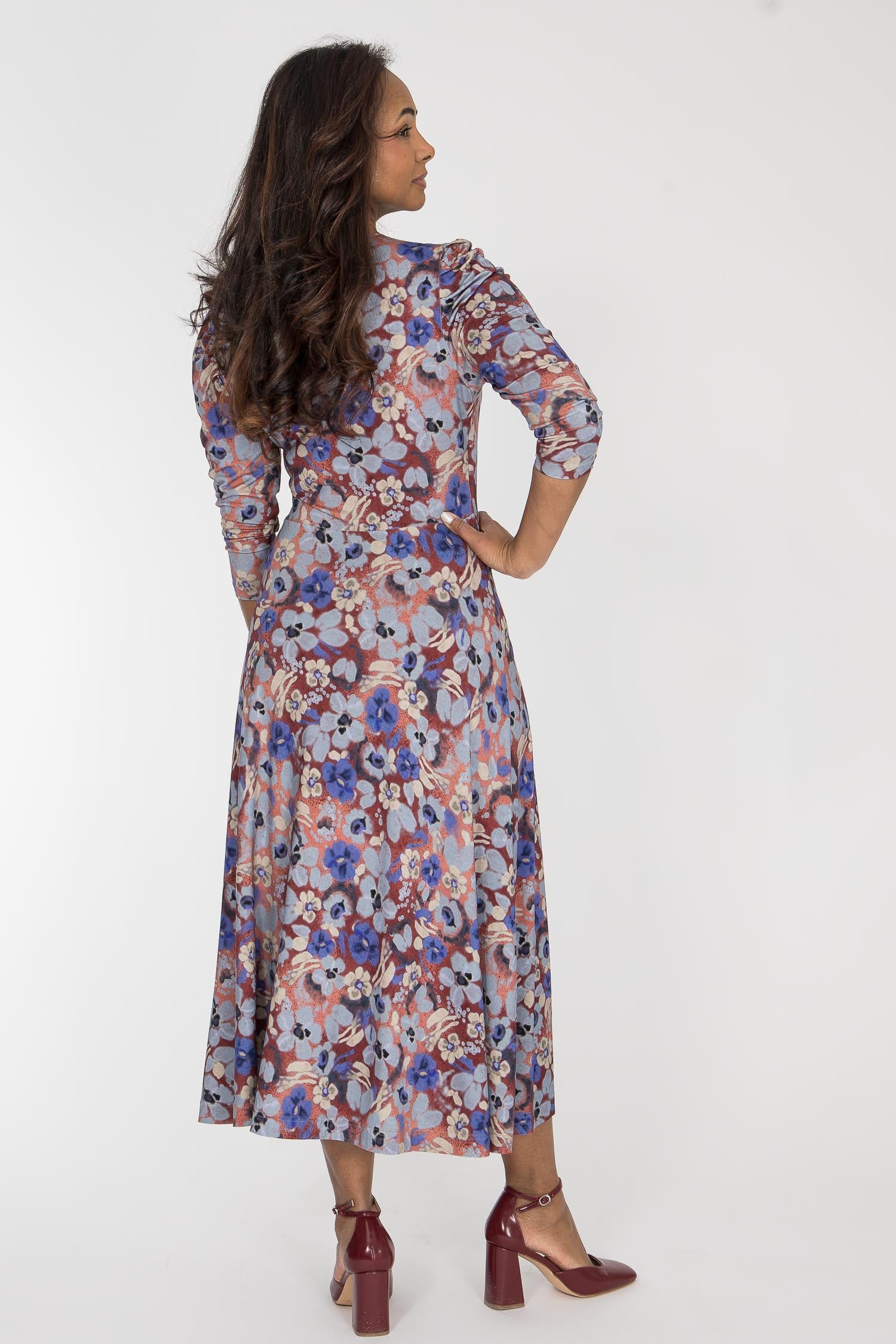 The dress features ¾-length puff sleeves and comes in a new print with a red-brown base and flowers in shades of blue. A comfortable yet refined style that works just as well for everyday wear as it does for more dressed-up occasions. Also available in a shorter knee-length.
