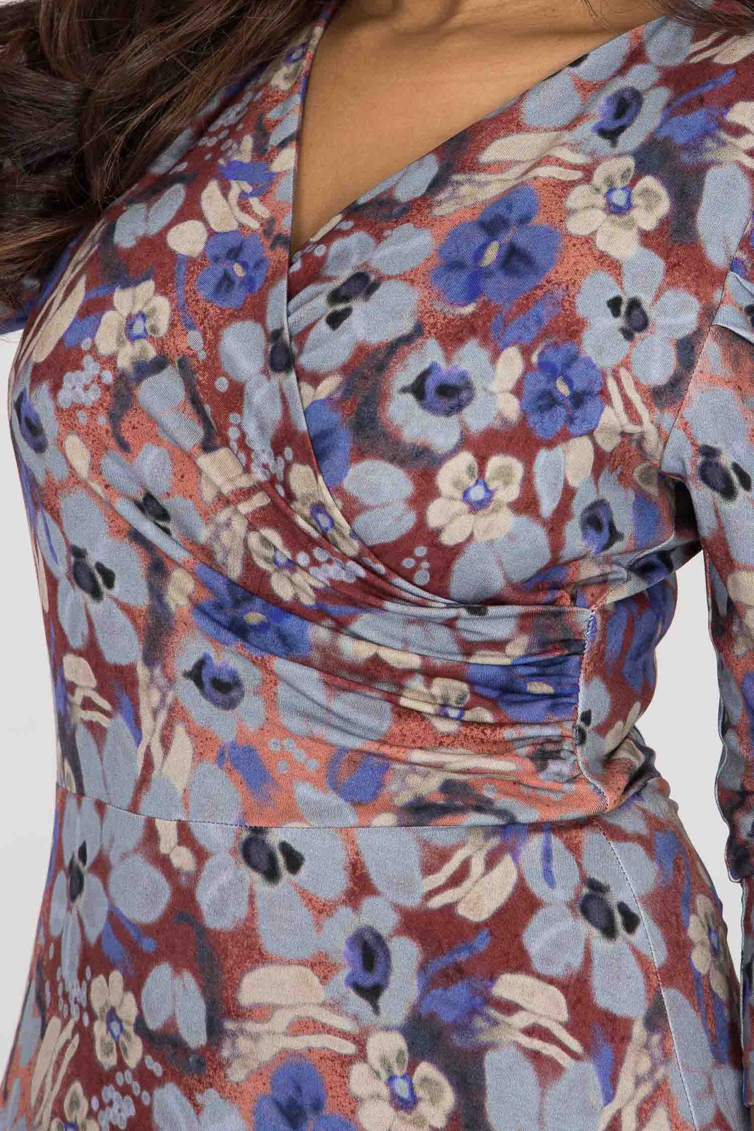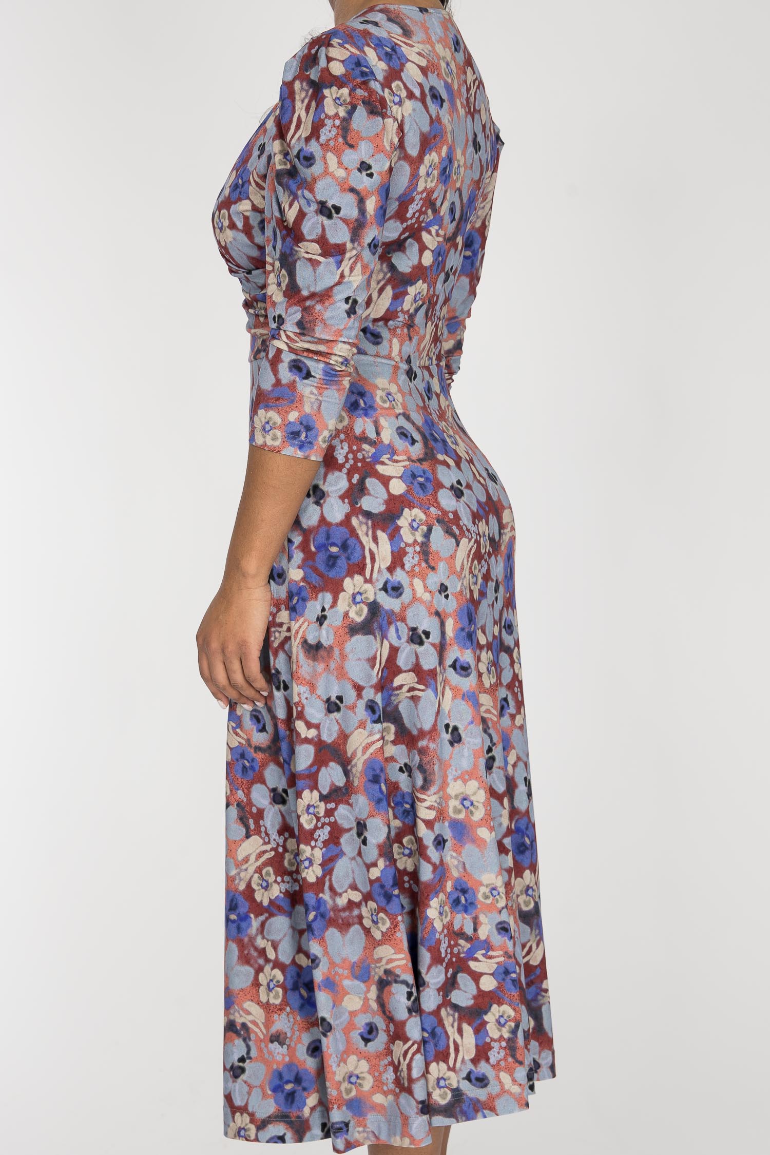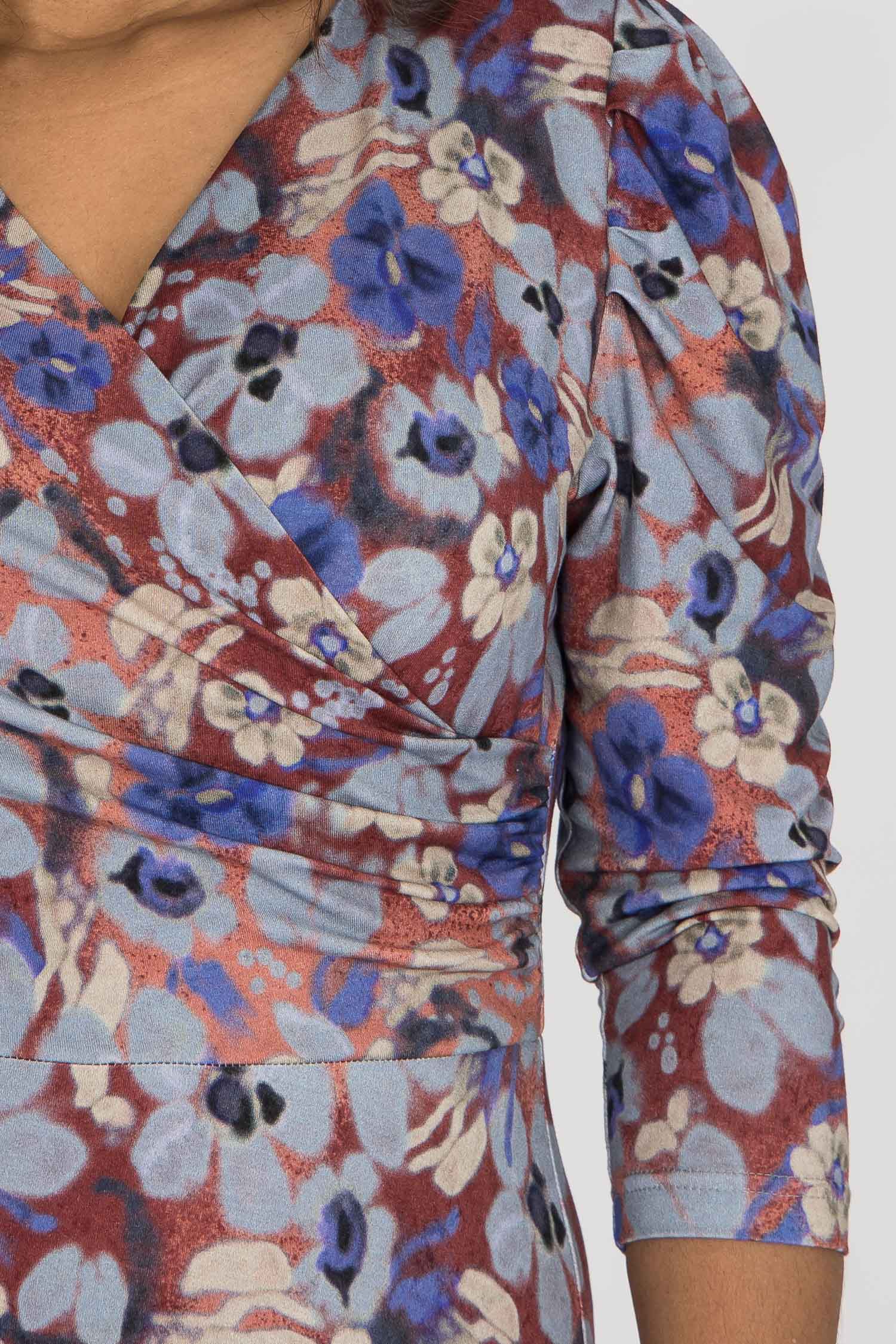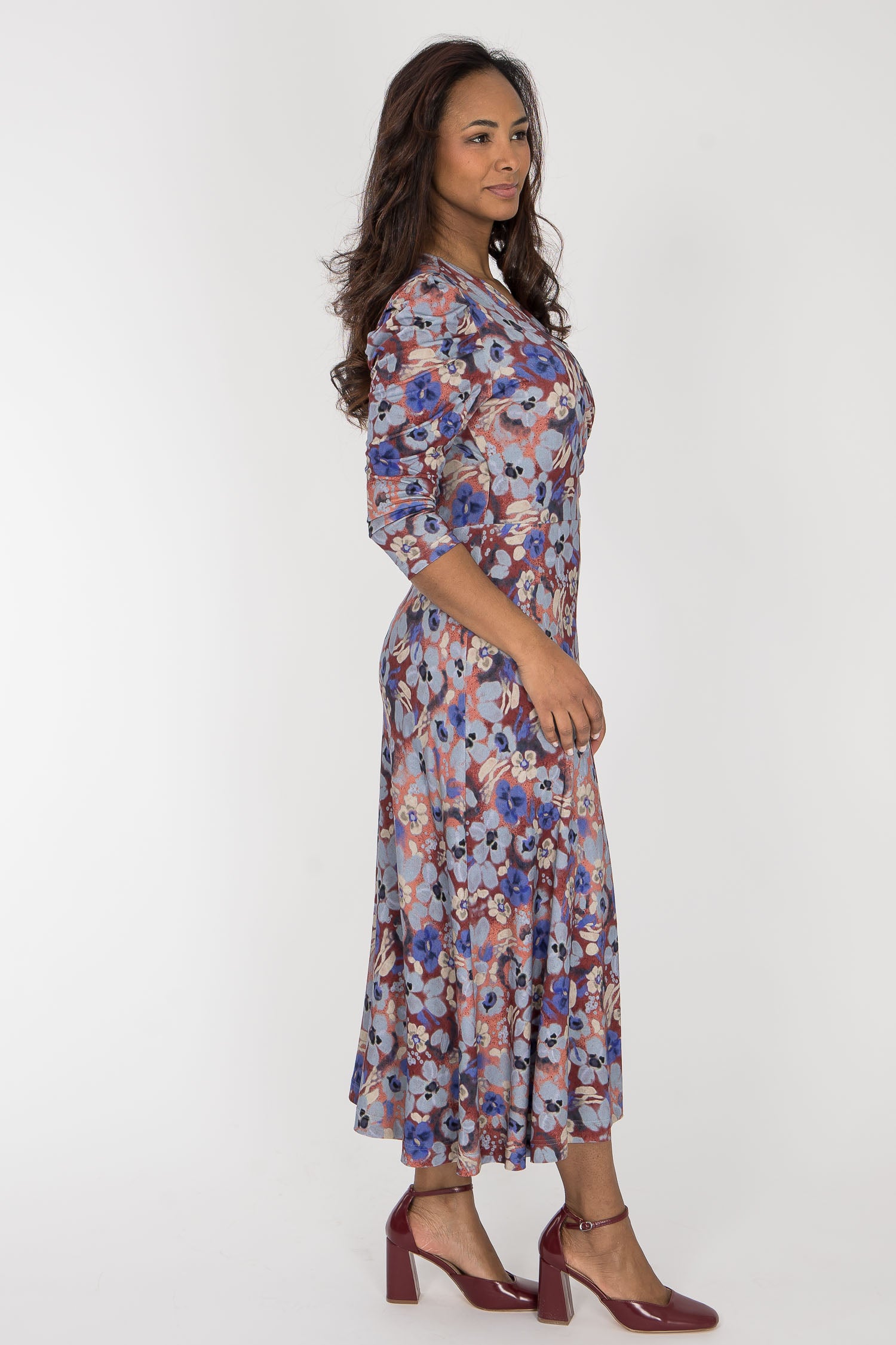 The dress features ¾-length puff sleeves and comes in a new print with a red-brown base and flowers in shades of blue. A comfortable yet refined style that works just as well for everyday wear as it does for more dressed-up occasions. Also available in a shorter knee-length.