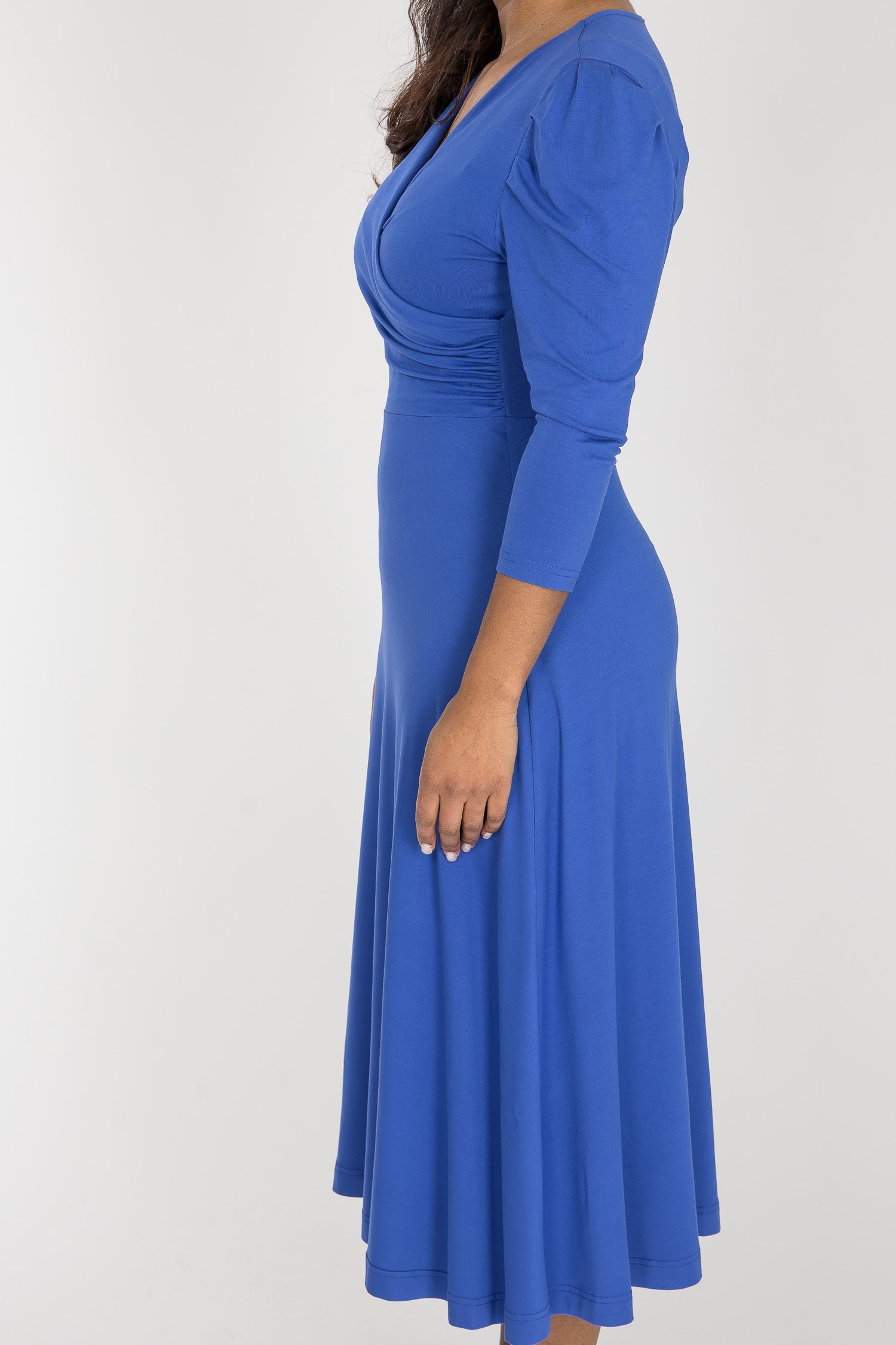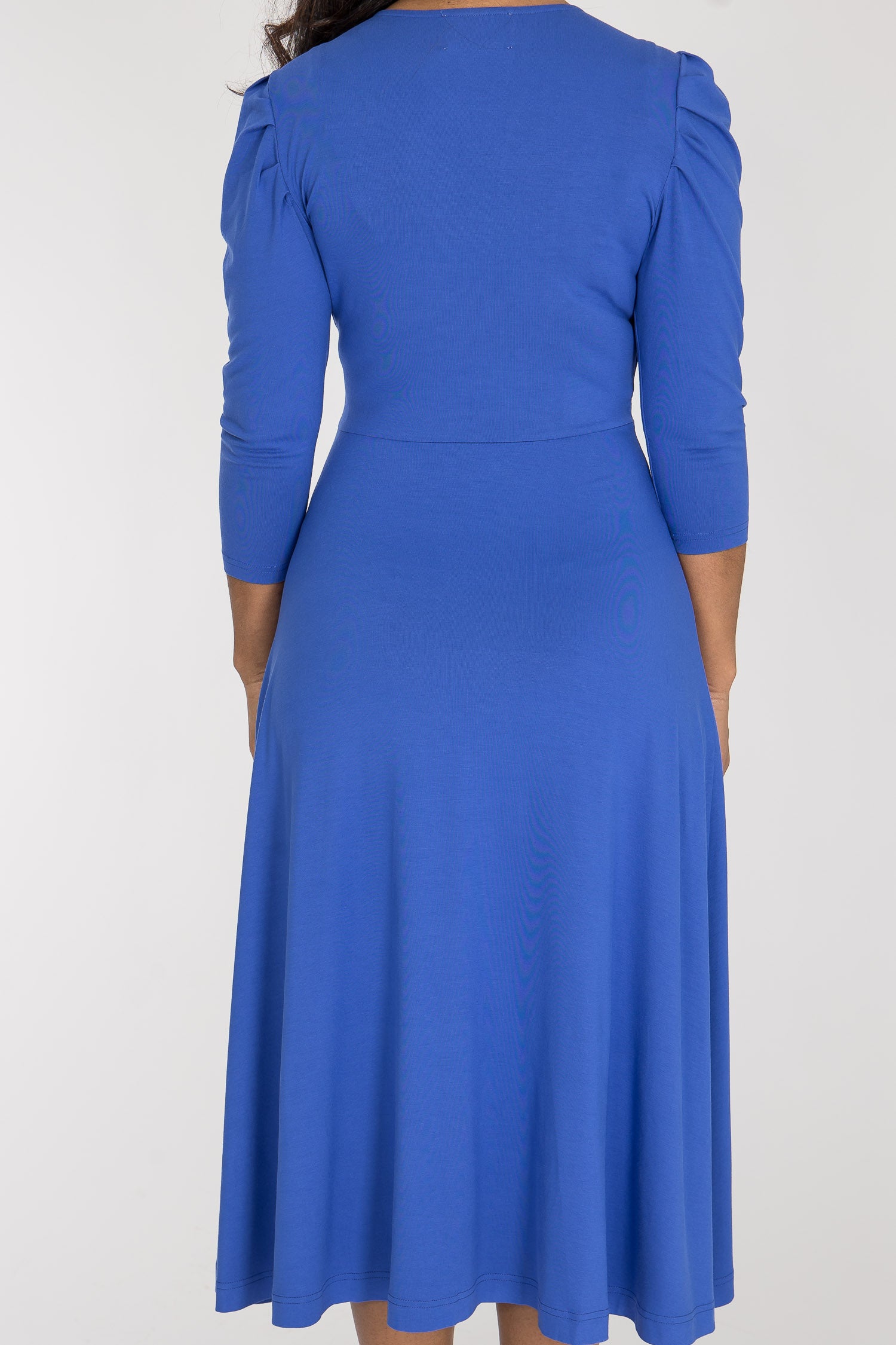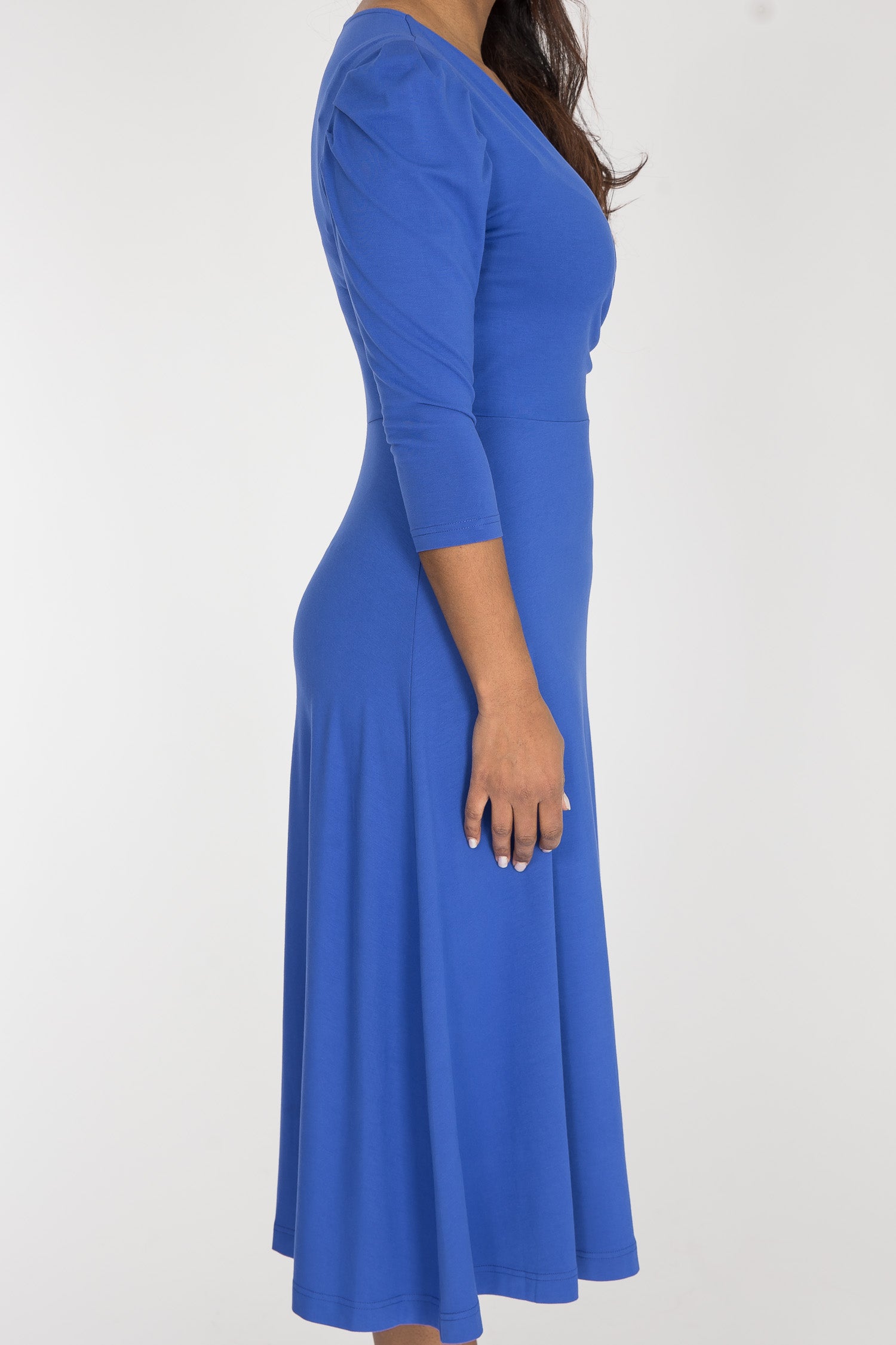 The dress features ¾-length puff sleeves and comes in a plain dazzling Blue color. A comfortable yet refined style that works just as well for everyday wear as it does for more dressed-up occasions. Also available in a shorter knee-length.