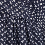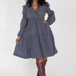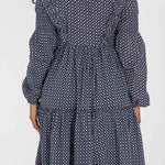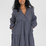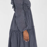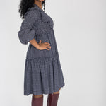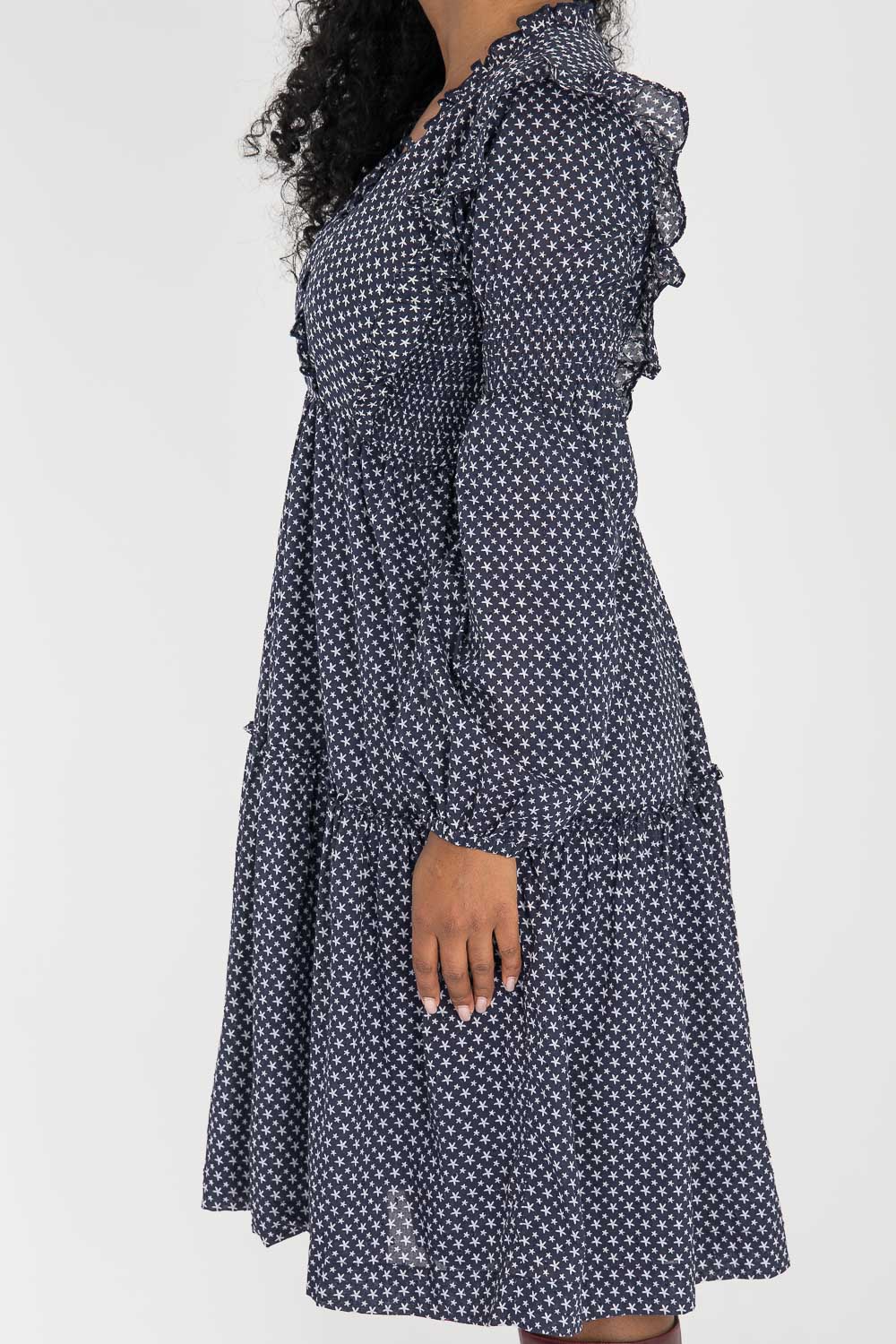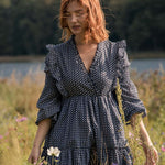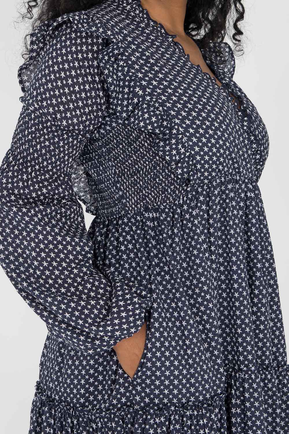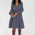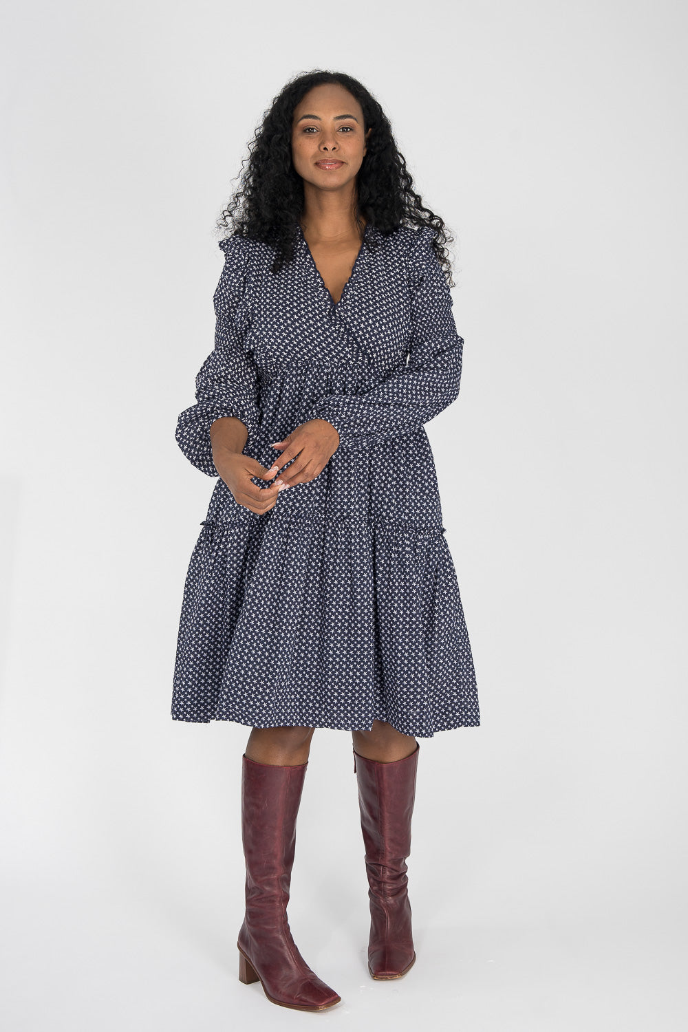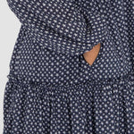 Kjolen är vid och avslutas med en bred volang nertill som ger klänningen ett vackert fall. Livet och kjolen är fodrade i tunn bomull för skön komfort och praktiska fickor i sidorna.