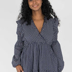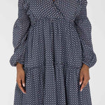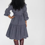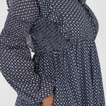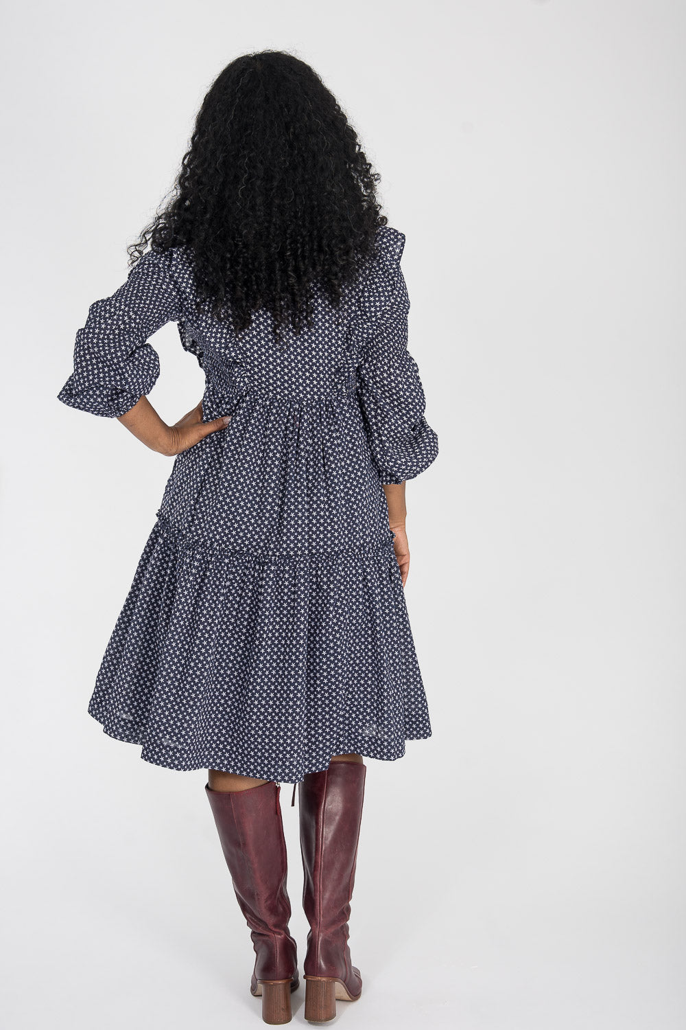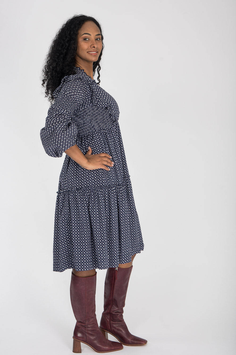 Klänningen är avskuren högt i midjan med en elastisk passform som gör den lätt och bekväm att bära. Smockdetaljer i sidorna upptill och på överärmen ger extra form och följsamhet. Ärmarna är långa och puffiga med resår i nederkanten, vilket gör att de kan bäras både långa eller uppdragna.
