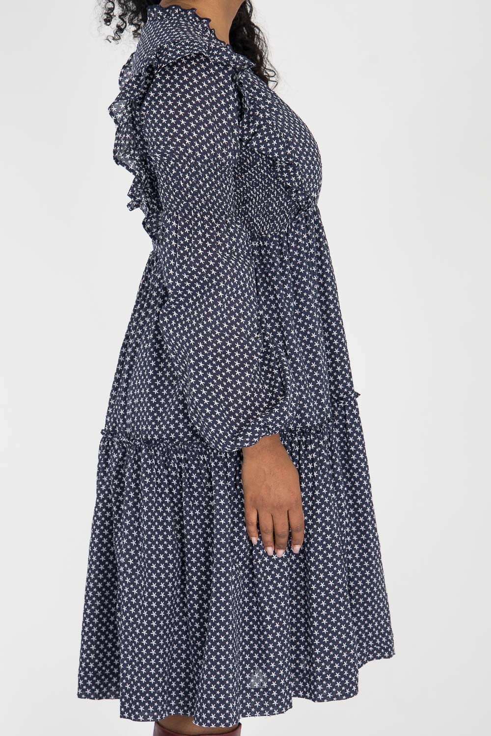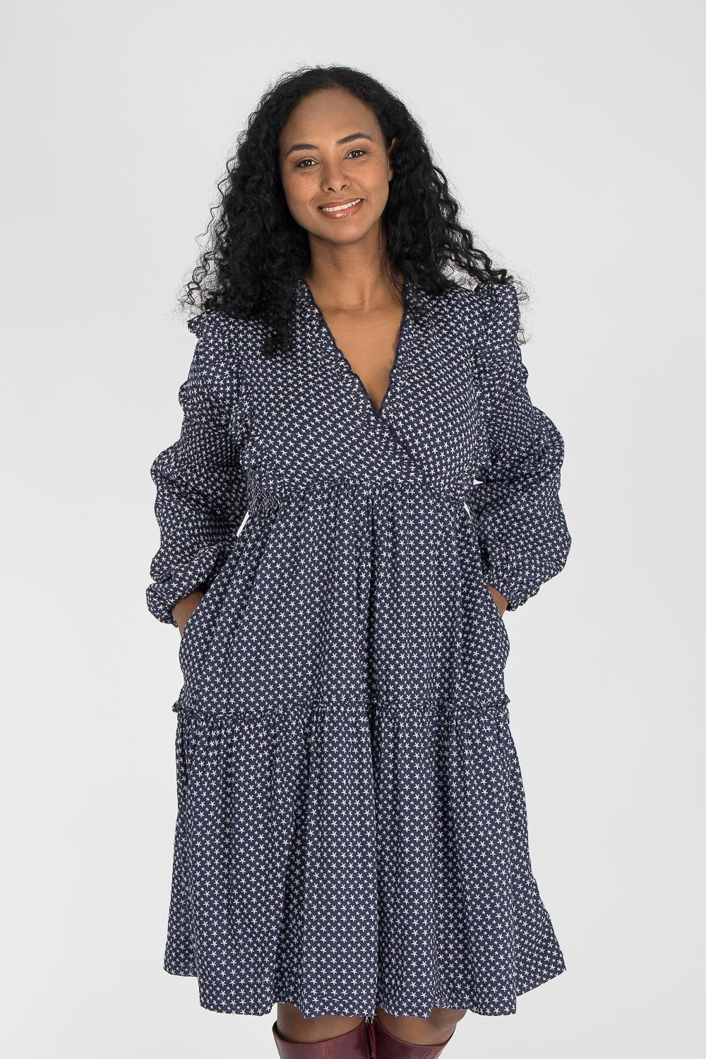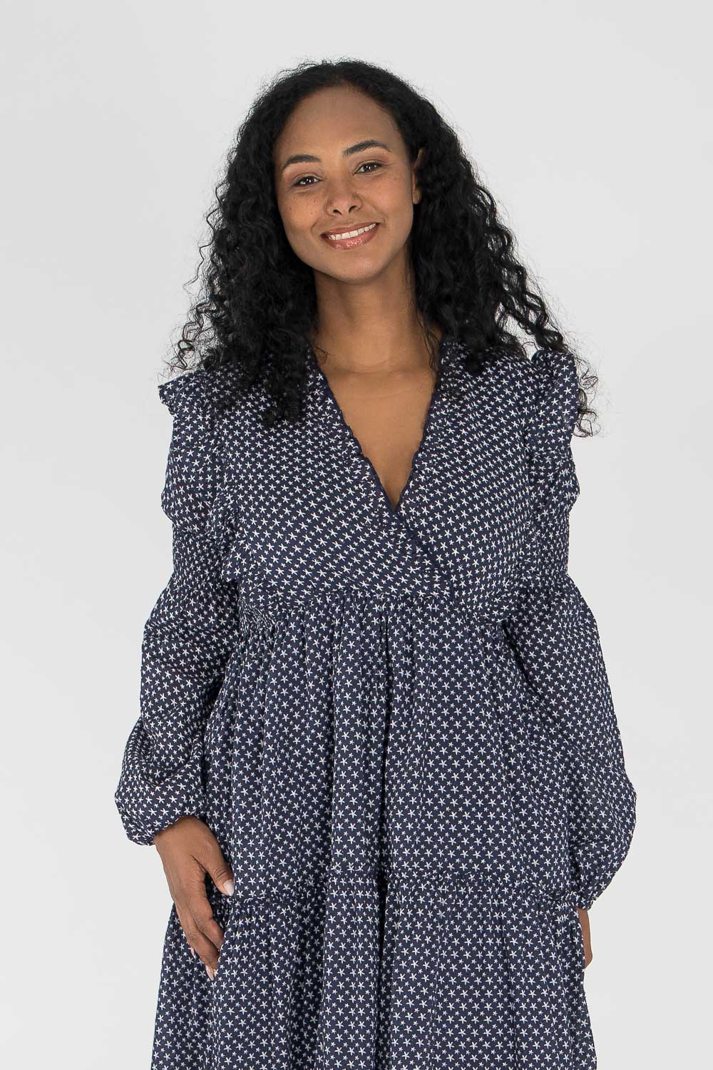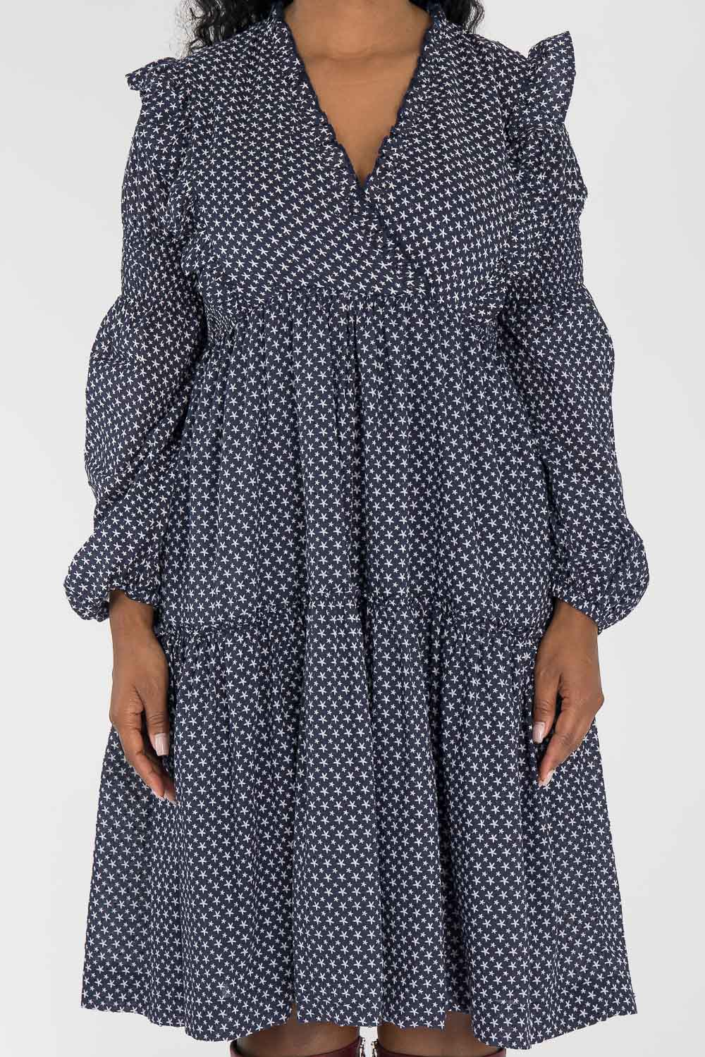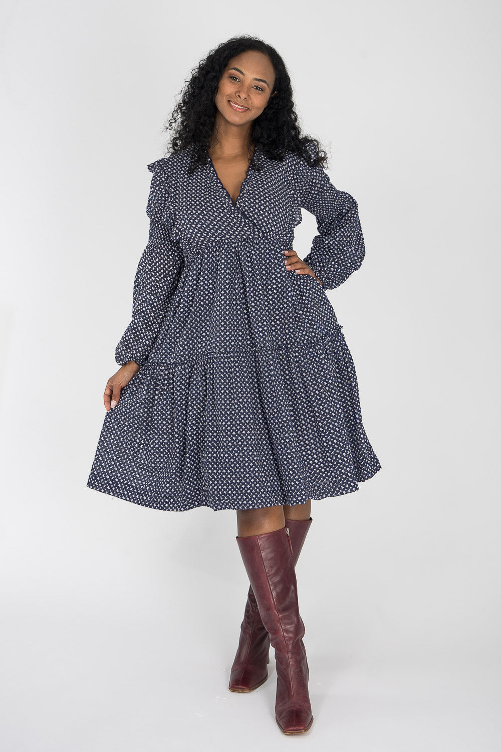 Här är en ny favorit i ekologisk bomull – en knälång klänning i broderat och mönstrat tyg som ger en lyxig struktur och ett levande uttryck. Den V-ringade halsringningen går omlott och ramas in av små volanger, medan en bred volang löper runt axlarna både fram och bak för en romantisk känsla.