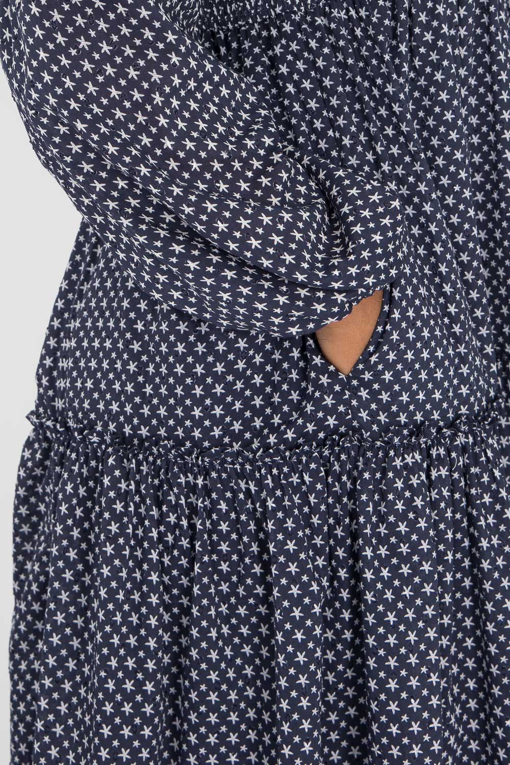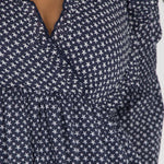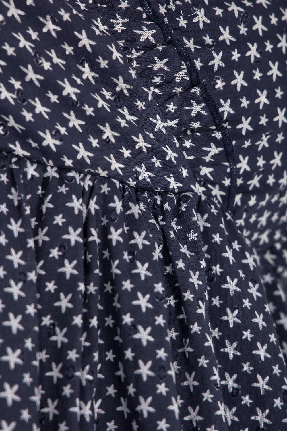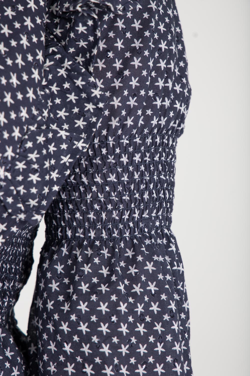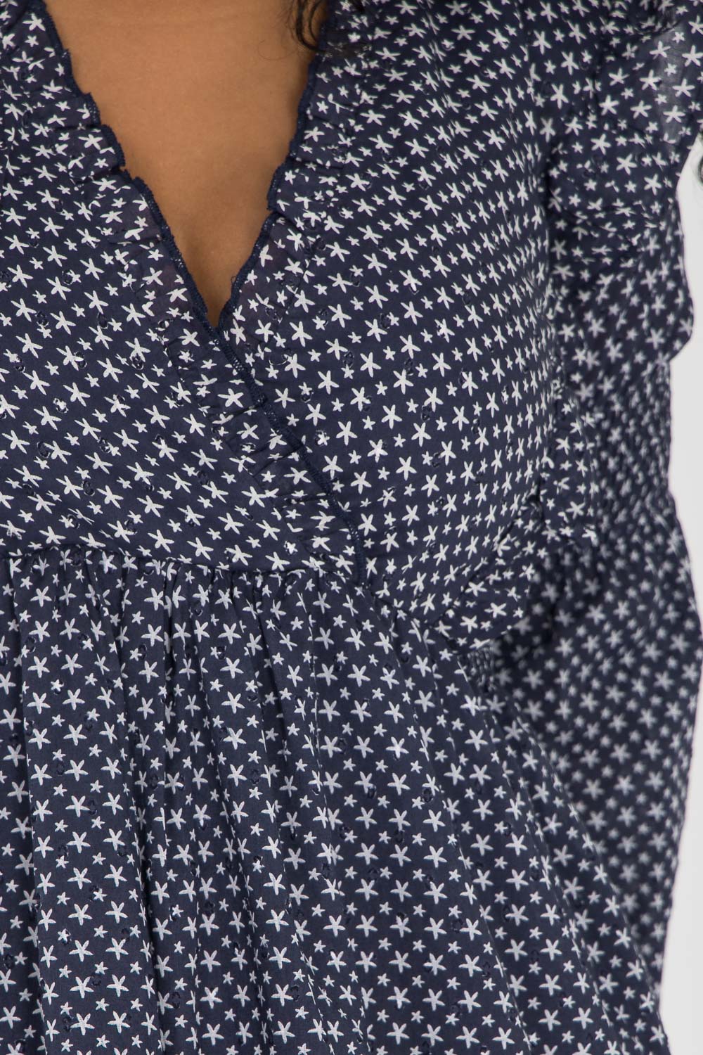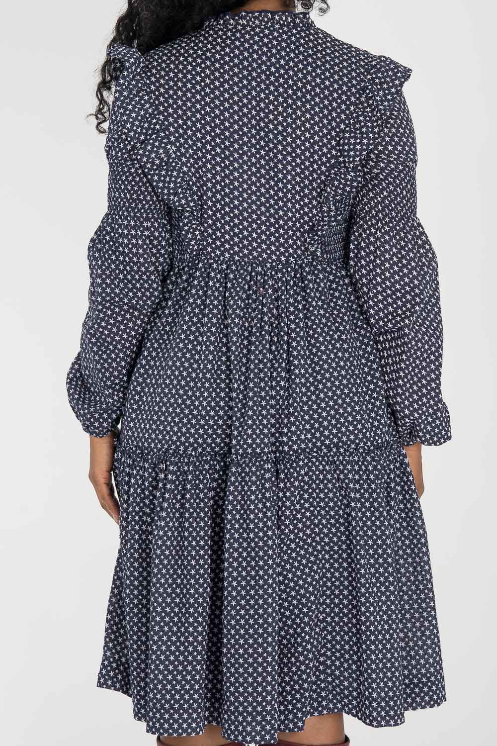 Här är en ny favorit i ekologisk bomull – en knälång klänning i broderat och mönstrat tyg som ger en lyxig struktur och ett levande uttryck. Den V-ringade halsringningen går omlott och ramas in av små volanger, medan en bred volang löper runt axlarna både fram och bak för en romantisk känsla.