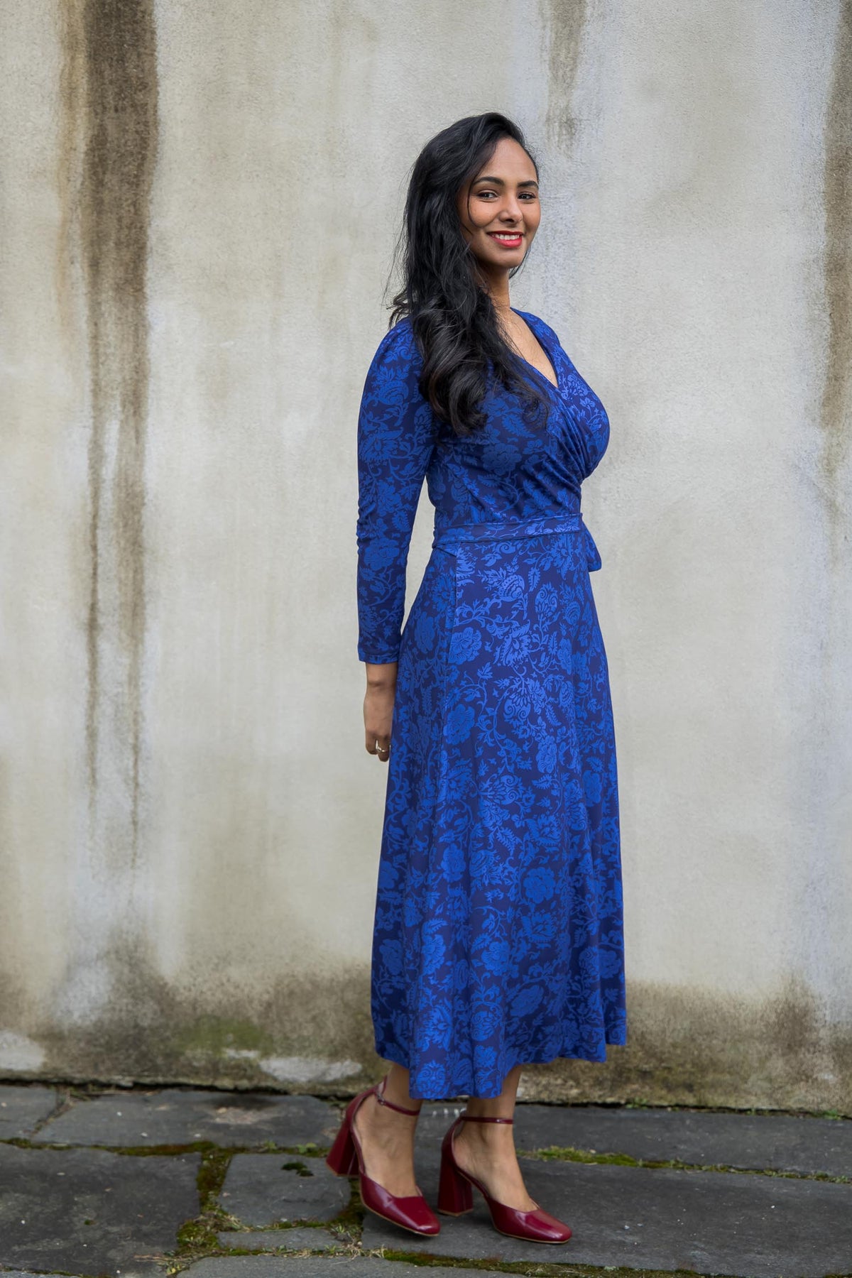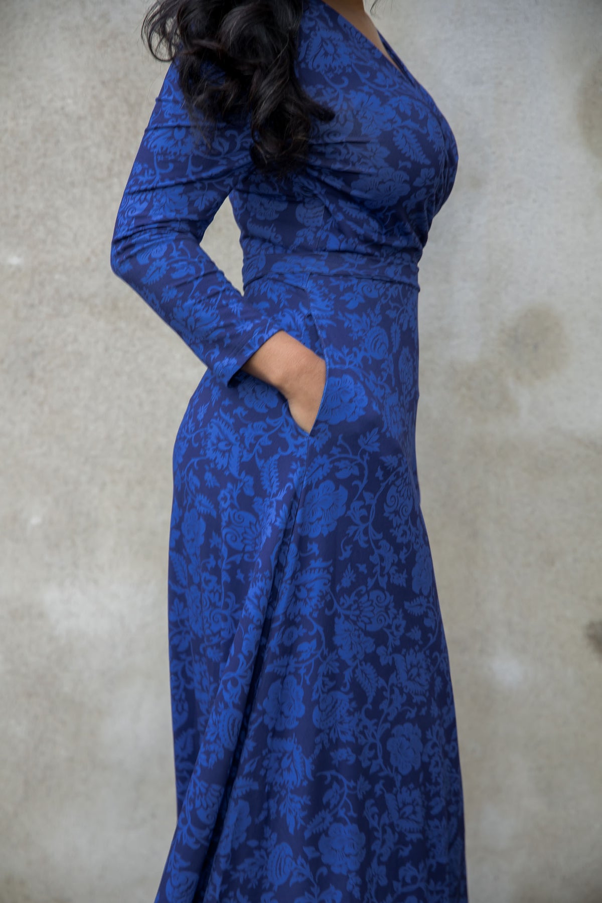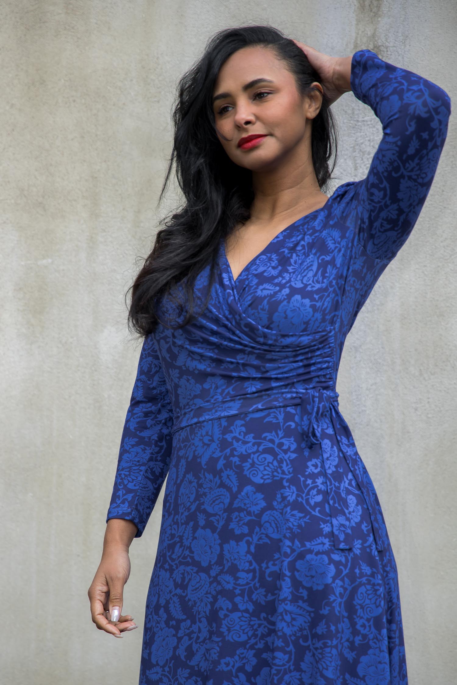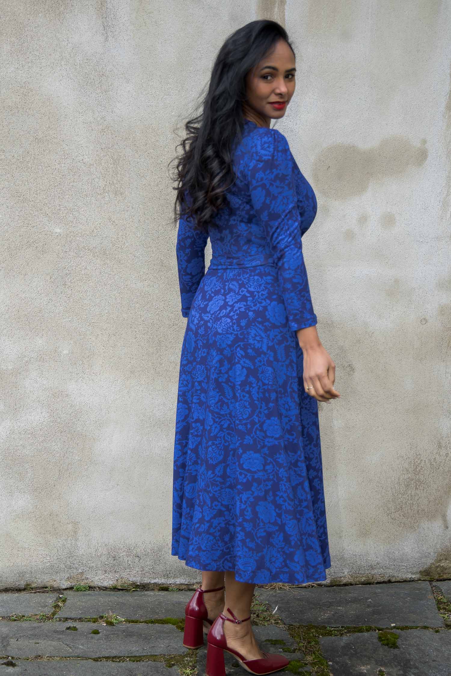 The bodice is designed with a wrap front and side draping to highlight your silhouette. The ¾-length sleeves have a little gathering at the shoulder, adding a subtle detail and feminine touch that complements the flared skirt. The fixed tie at the side can easily be tied around the waist, either at the front or the back. The dress also has practical side pockets – perfect for keeping small essentials close at hand.