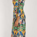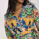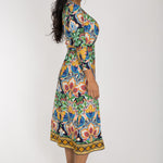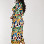 Mönstret är en färgsprakande folkloredröm med pigga nyanser av grönt, gult, rött och blått på en djup marinblå botten. Nertill pryds kjolen av en dekorativ bård som ger en fin inramning och förstärker den bohemiskt eleganta känslan.