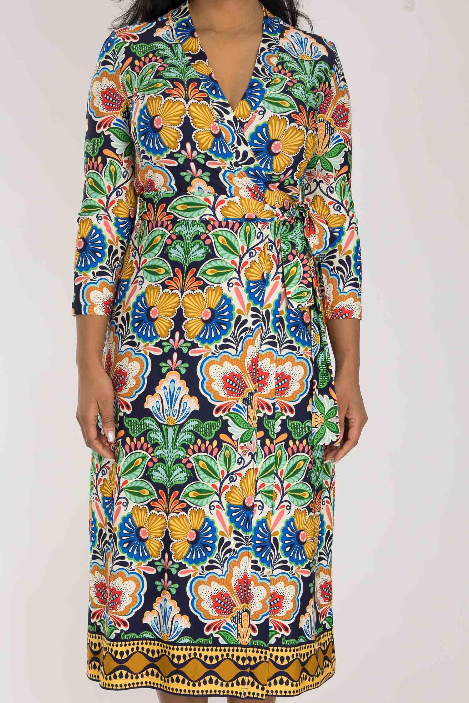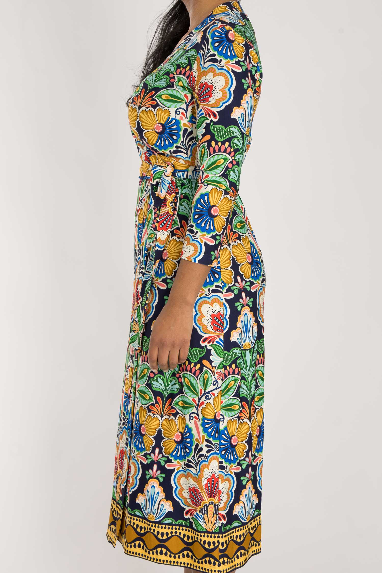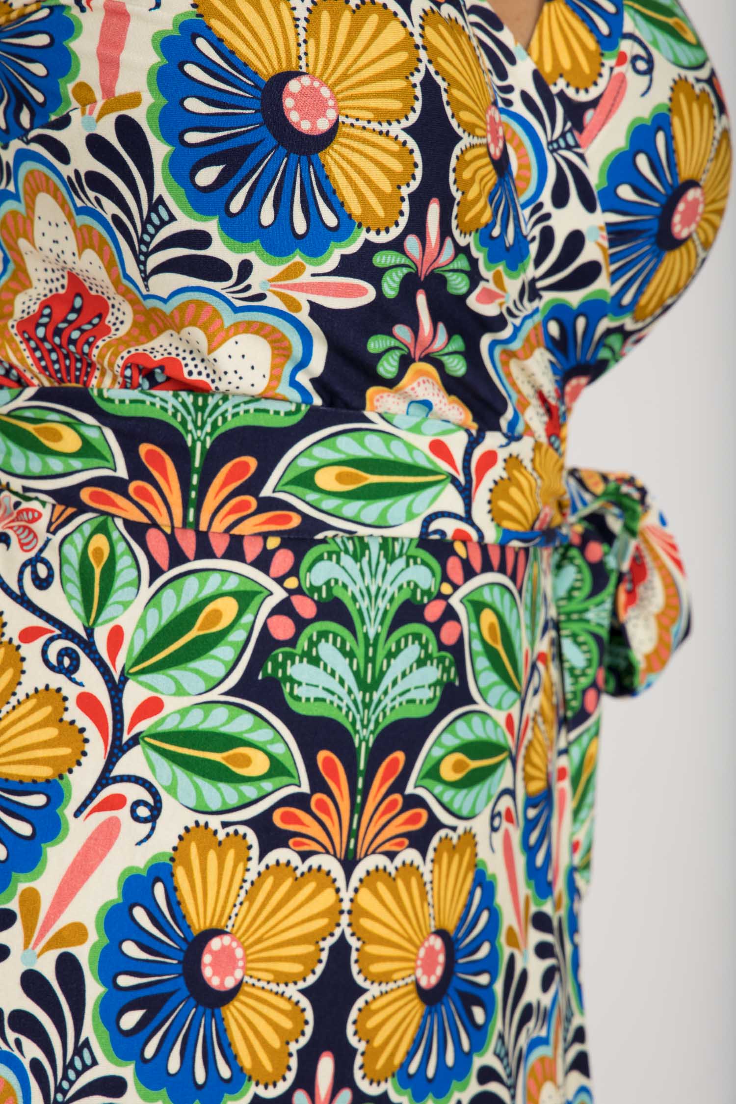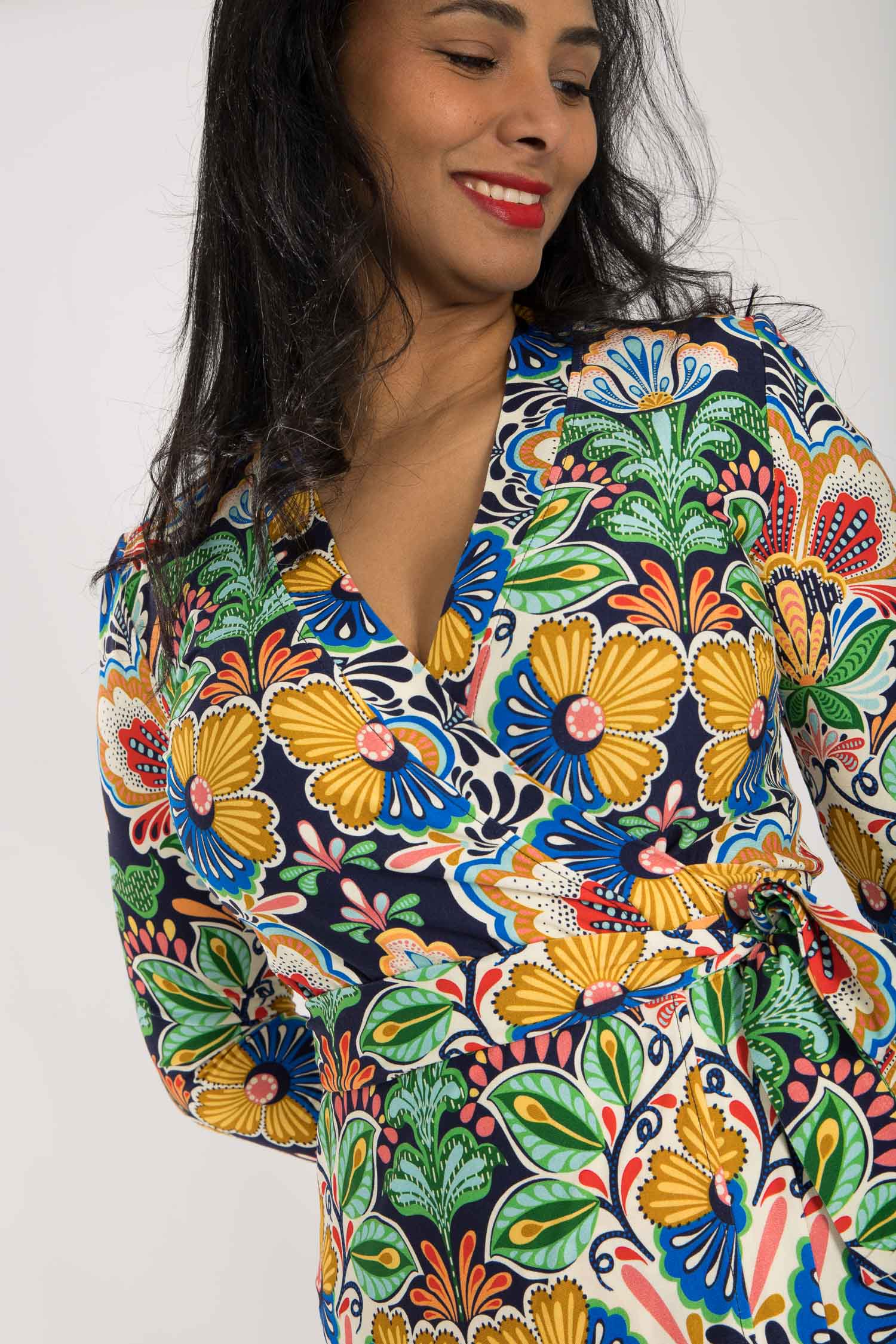 Slim Wrap – Omlottklänning med rakare kjol och färgstarkt folklore-mönster.