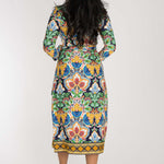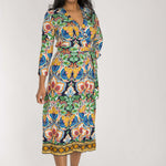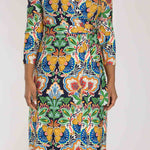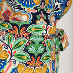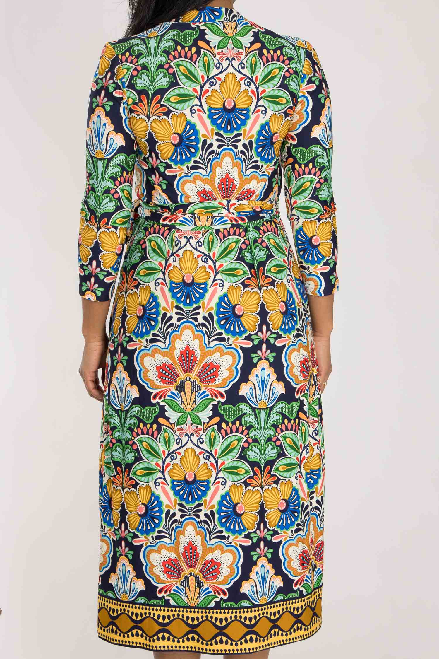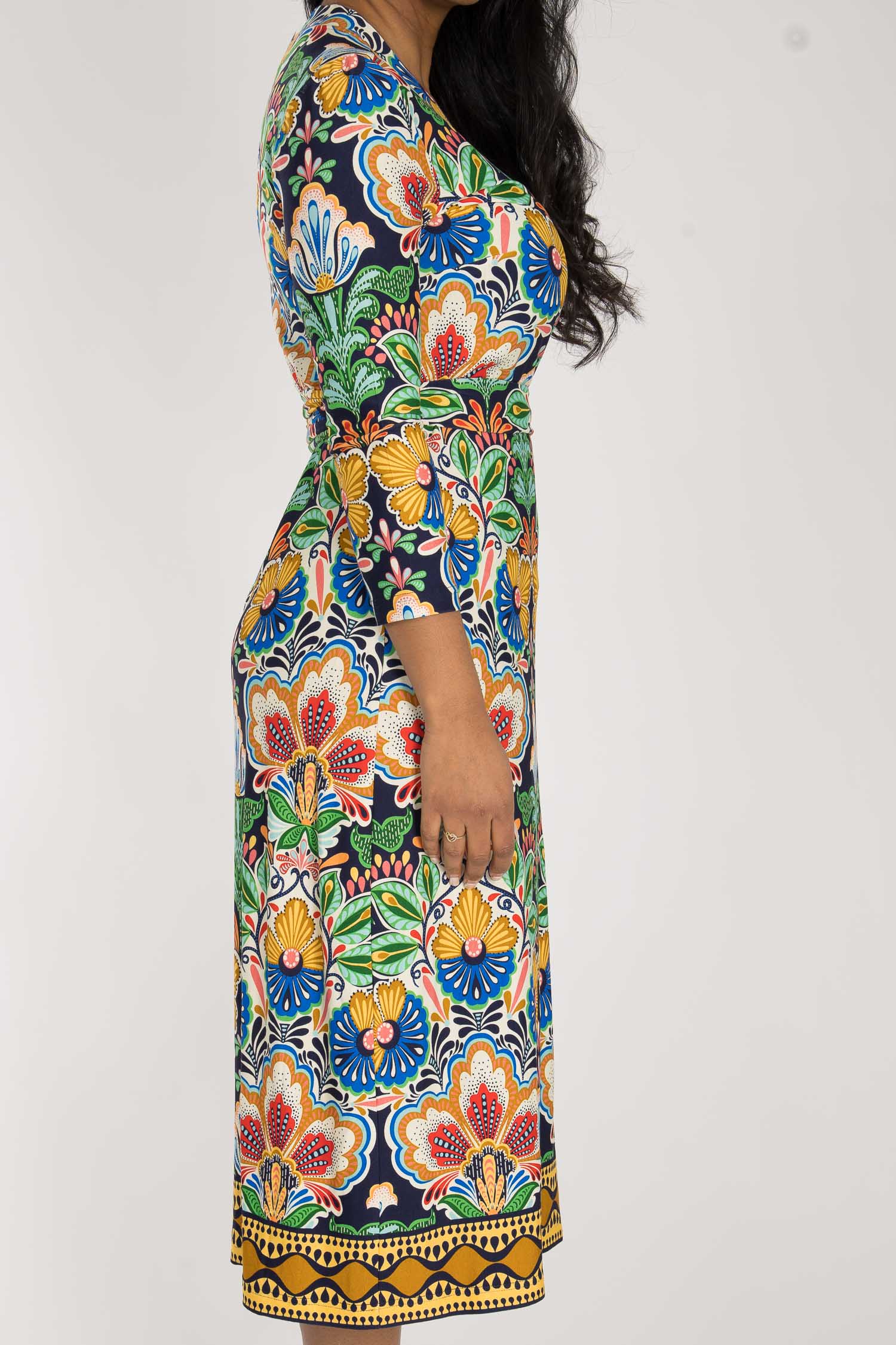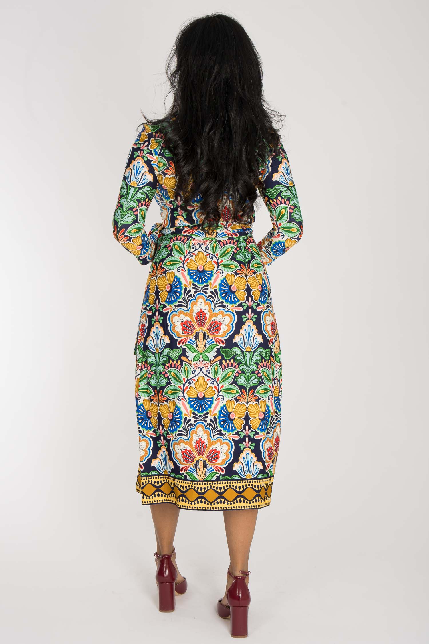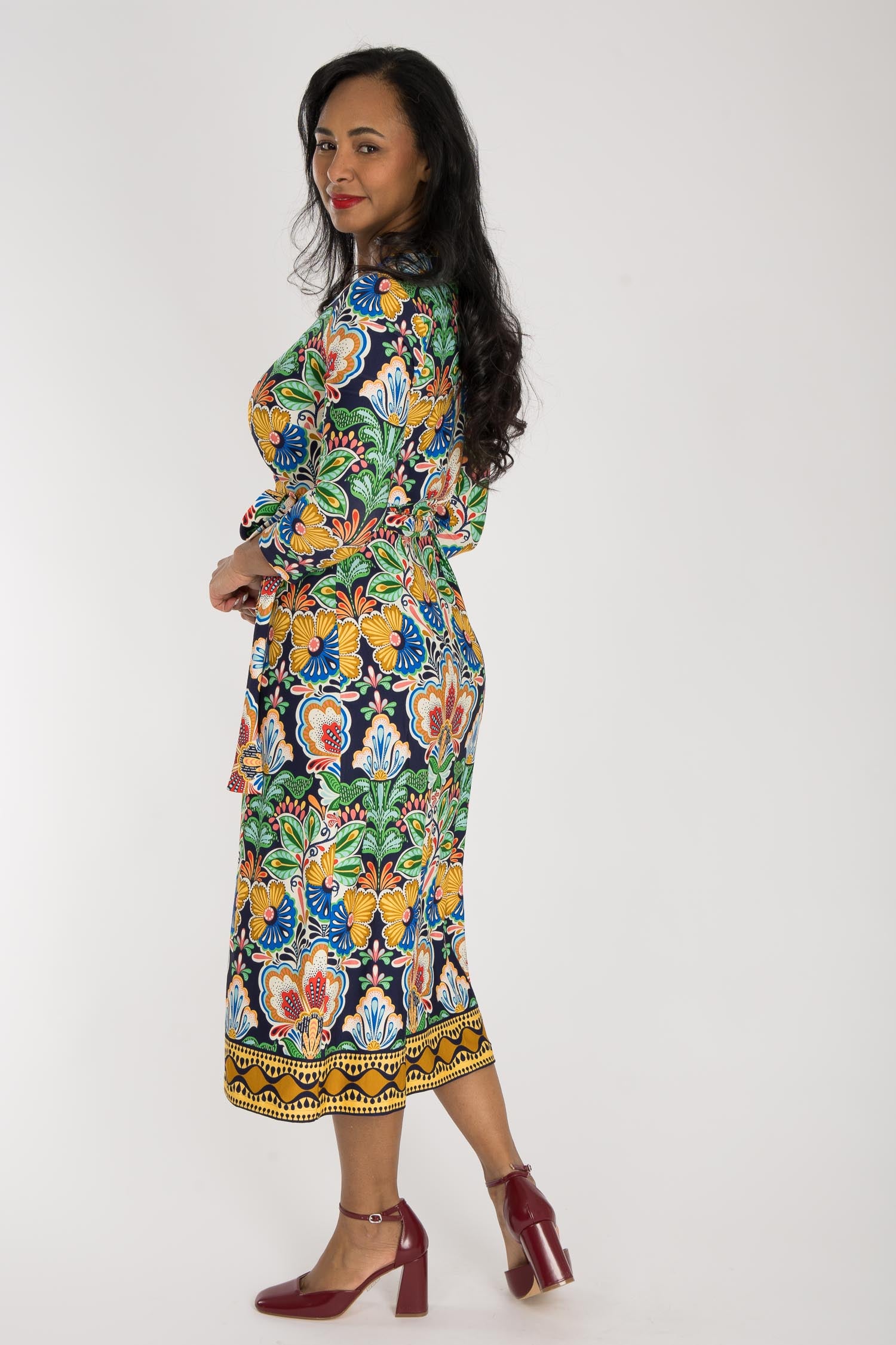 Slim Wrap – Omlottklänning med rakare kjol och färgstarkt folklore-mönster.