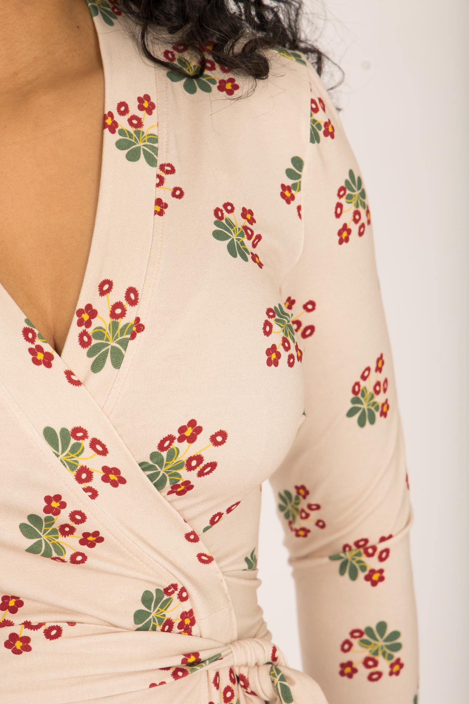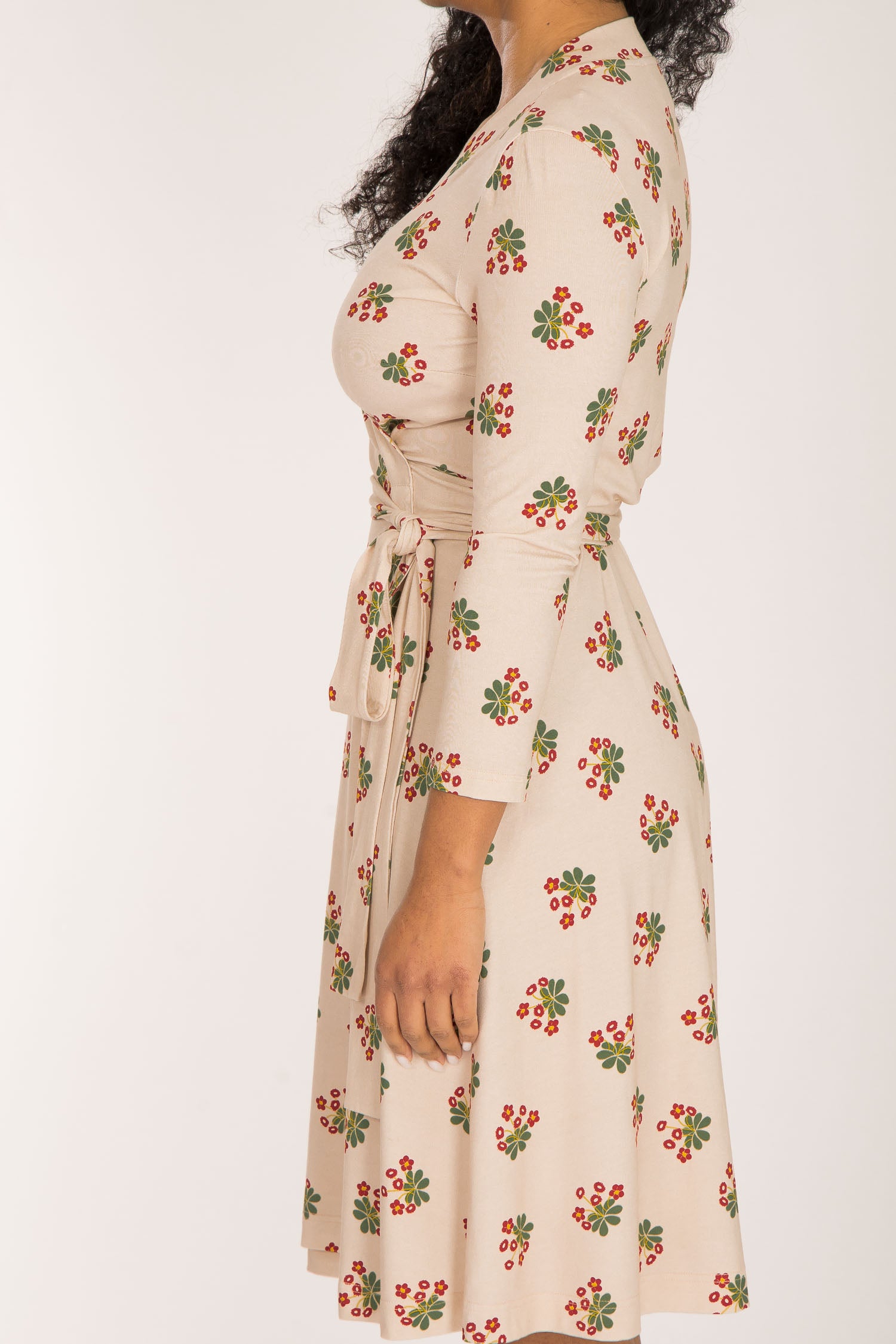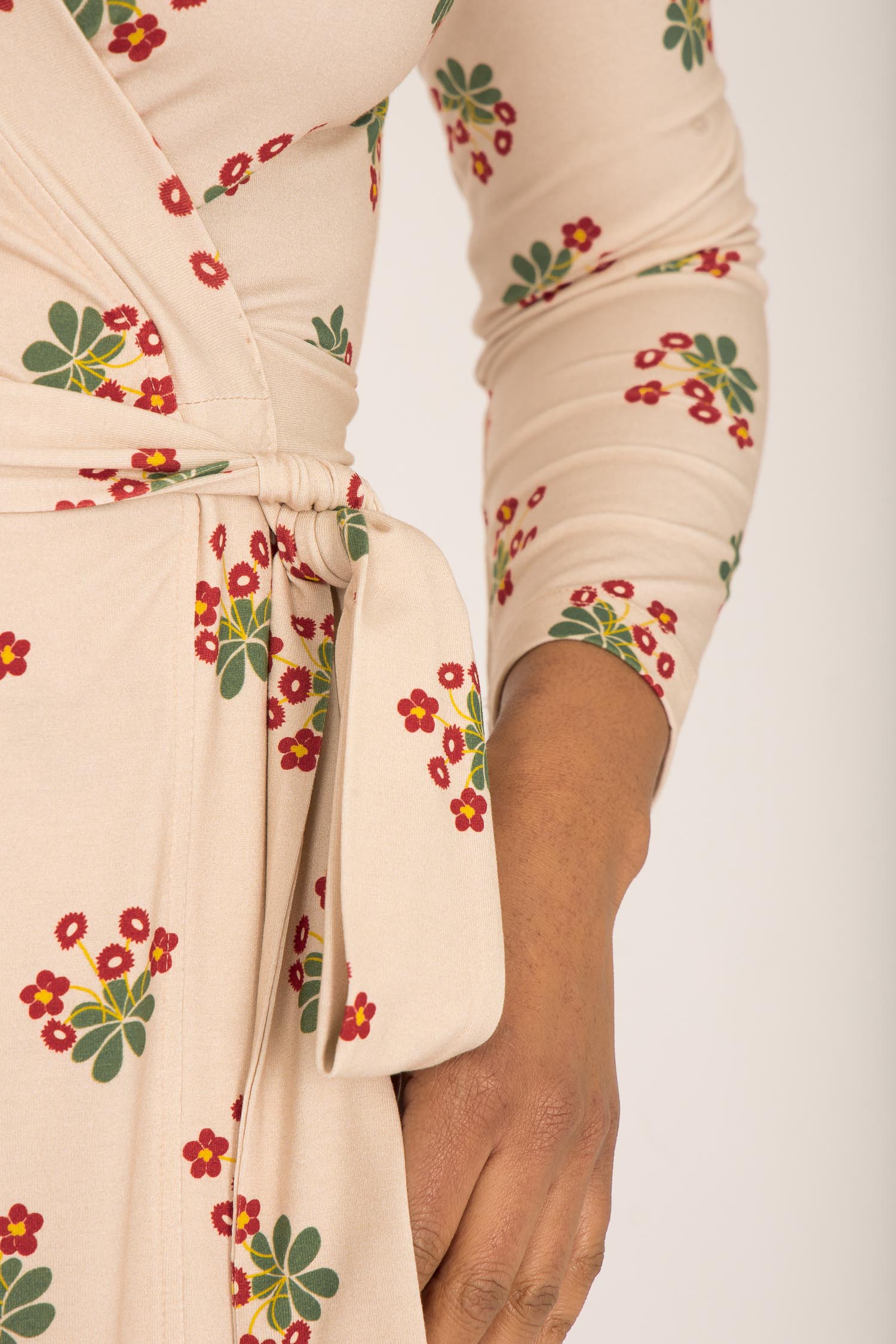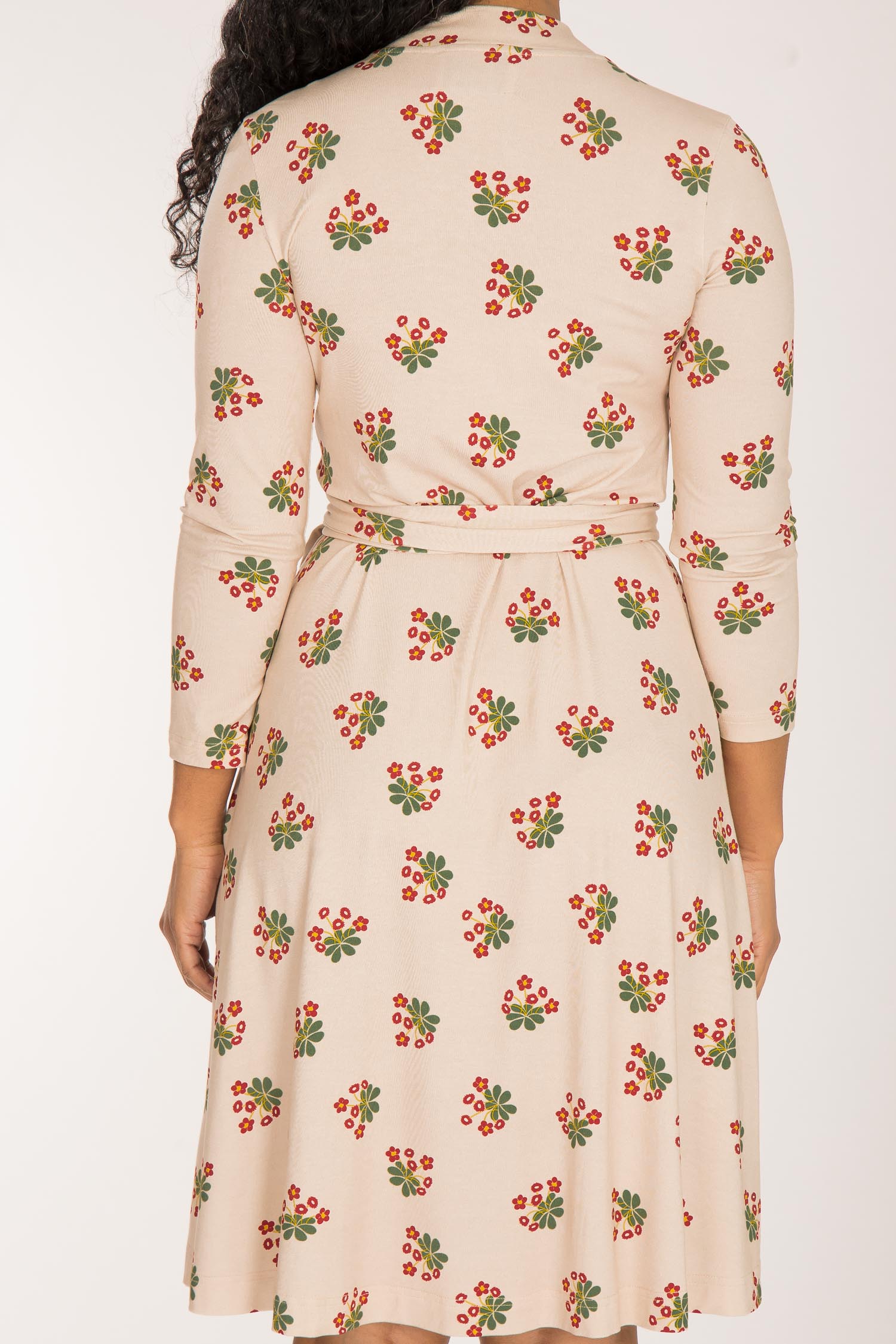 Tyget på denna omlottklänning har en beige botten med ett vackert blommönster i mörkt rött och grönt. Den har generöst med tyg och omlottar mycket runt kroppen och sluter fint vid nacken. Kjolen är rundskuren med härlig vidd och ett vackert fall.