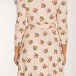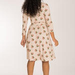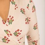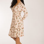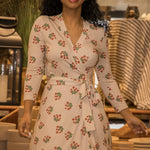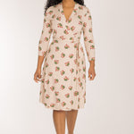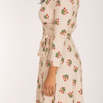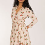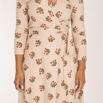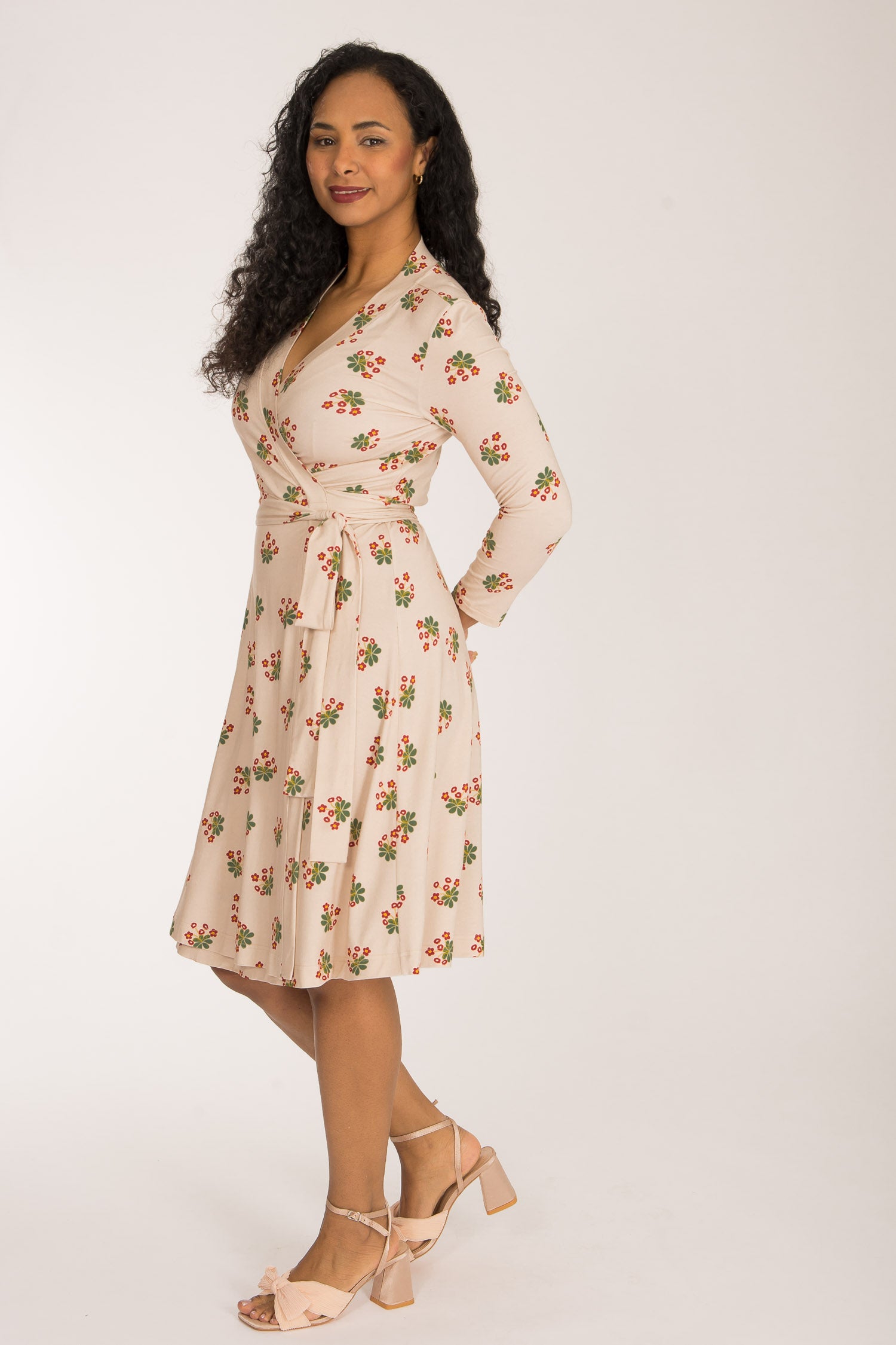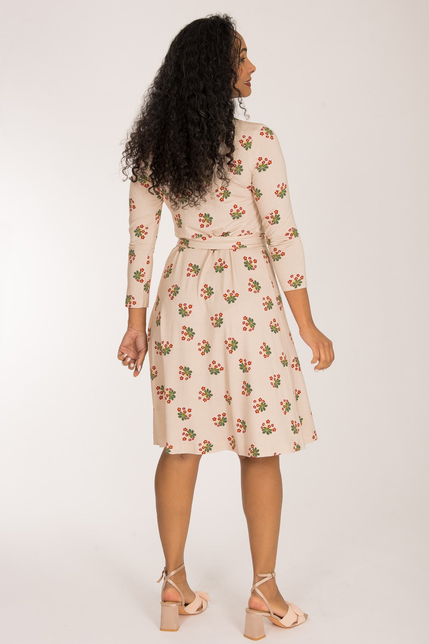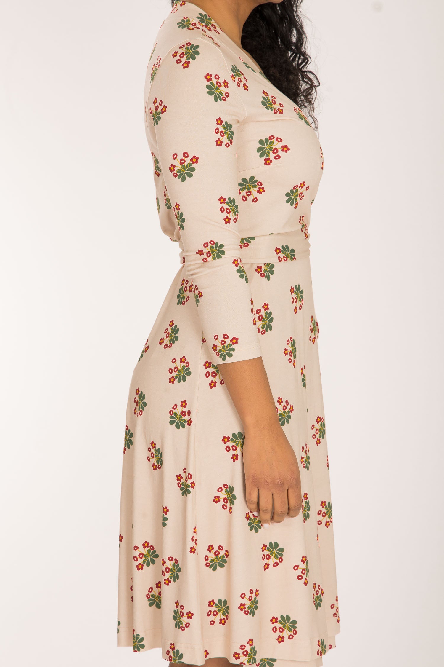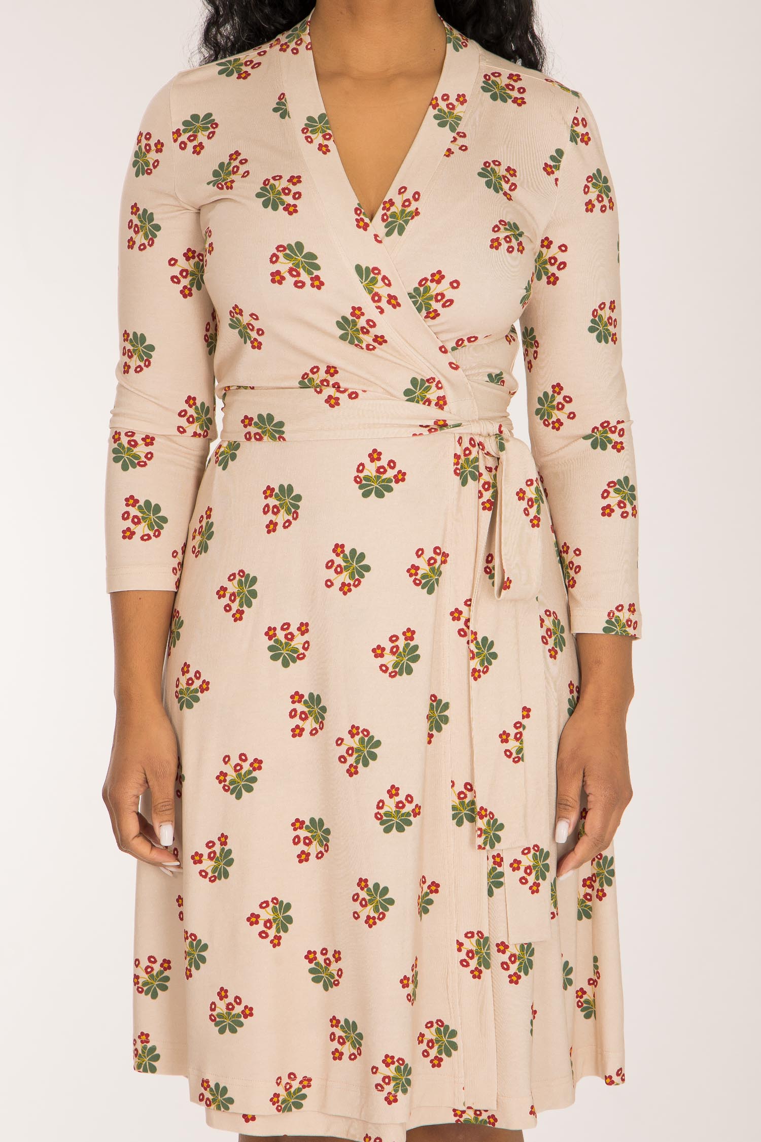 Tyget på denna omlottklänning har en beige botten med ett vackert blommönster i mörkt rött och grönt. Den har generöst med tyg och omlottar mycket runt kroppen och sluter fint vid nacken. Kjolen är rundskuren med härlig vidd och ett vackert fall.